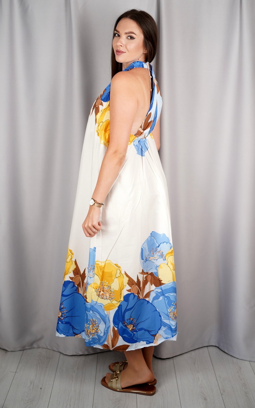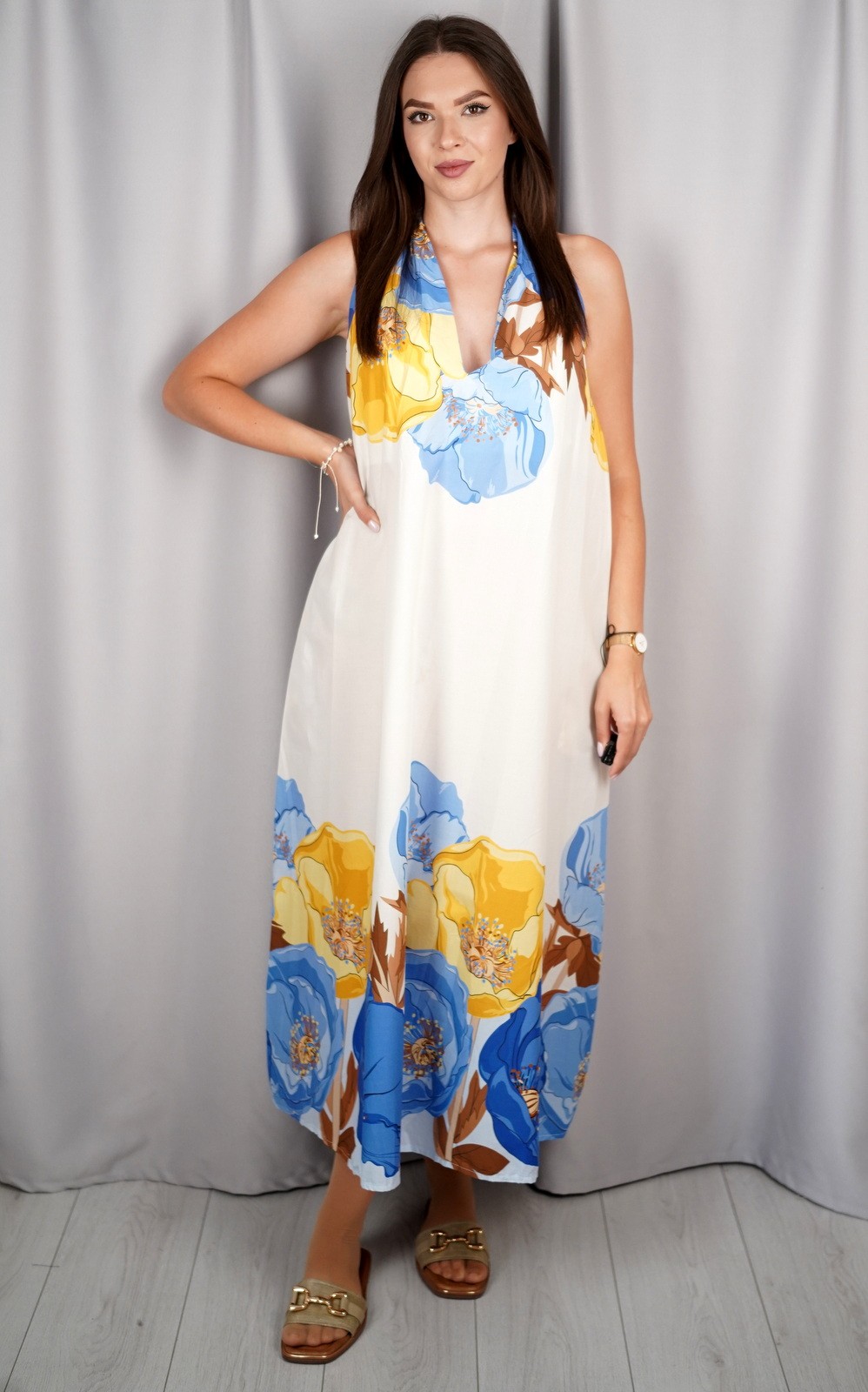 Ova duga ljetna haljina s halter izrezom i raskošnim cvjetnim printom savršena je kombinacija udobnosti i ženstvene elegancije. Lepršavi kroj omogućava slobodu kretanja, dok otvoreni rameni dio i bezrukavni dizajn pružaju svježinu u toplim danima. Cvjetni motivi dodaju haljini romantičan i vibrantan izgled, čineći je idealnim izborom za šetnje uz more, ljetne večere ili posebne prigode na otvorenom. Izrađena od laganog, prozračnog materijala koji nježno pada i prati pokrete tijela, ova haljina će postati vaš omiljeni komad za sezonu.