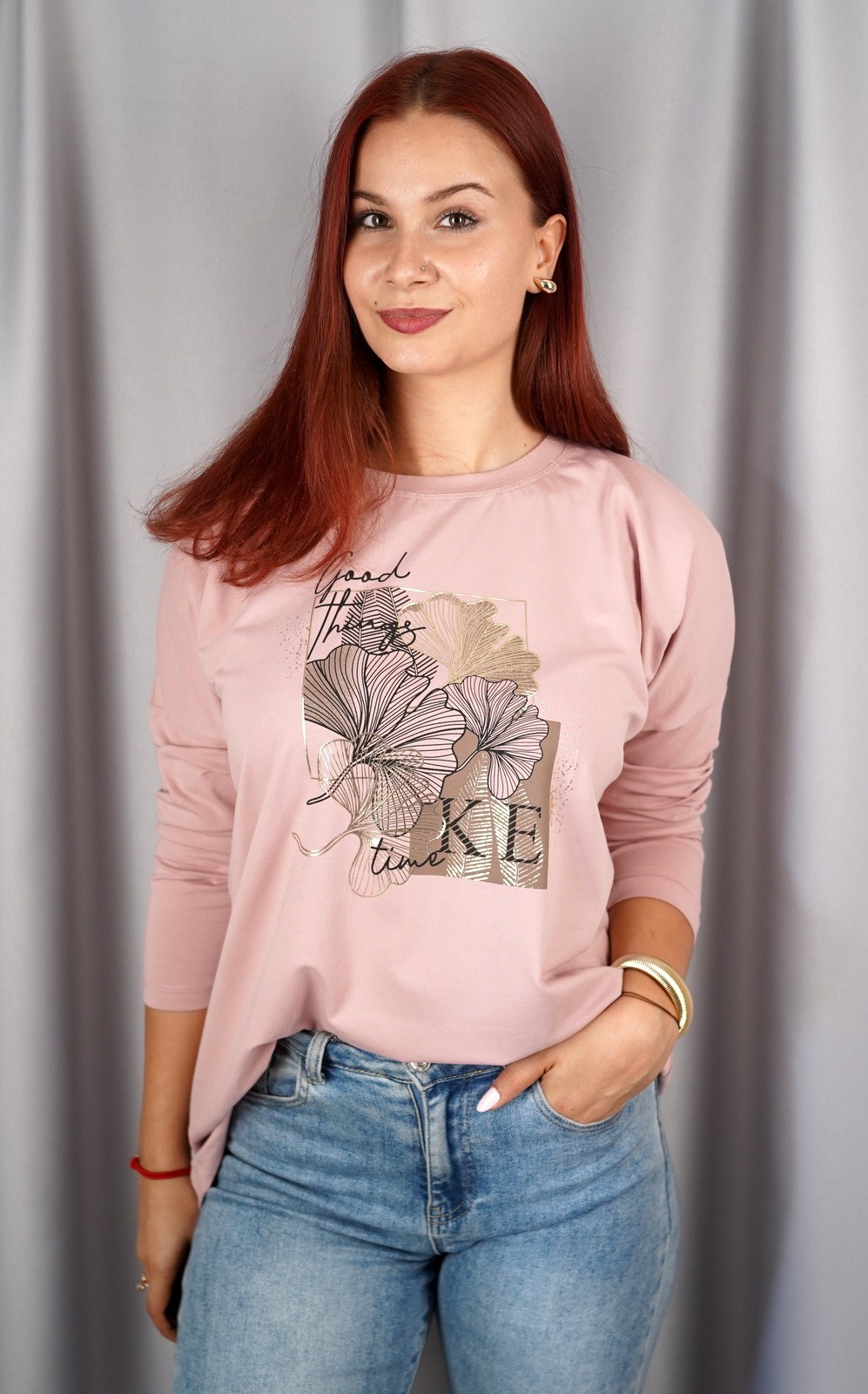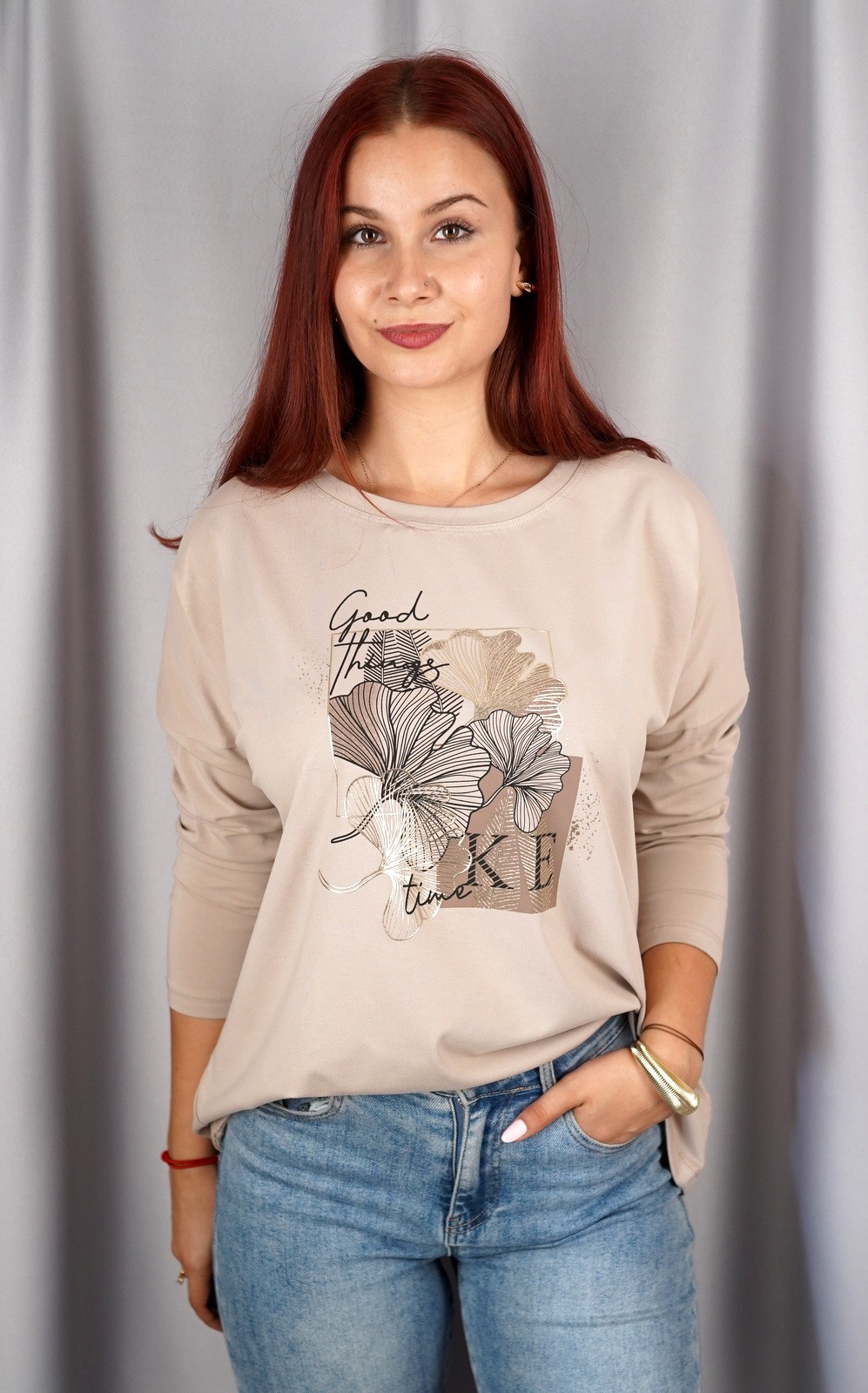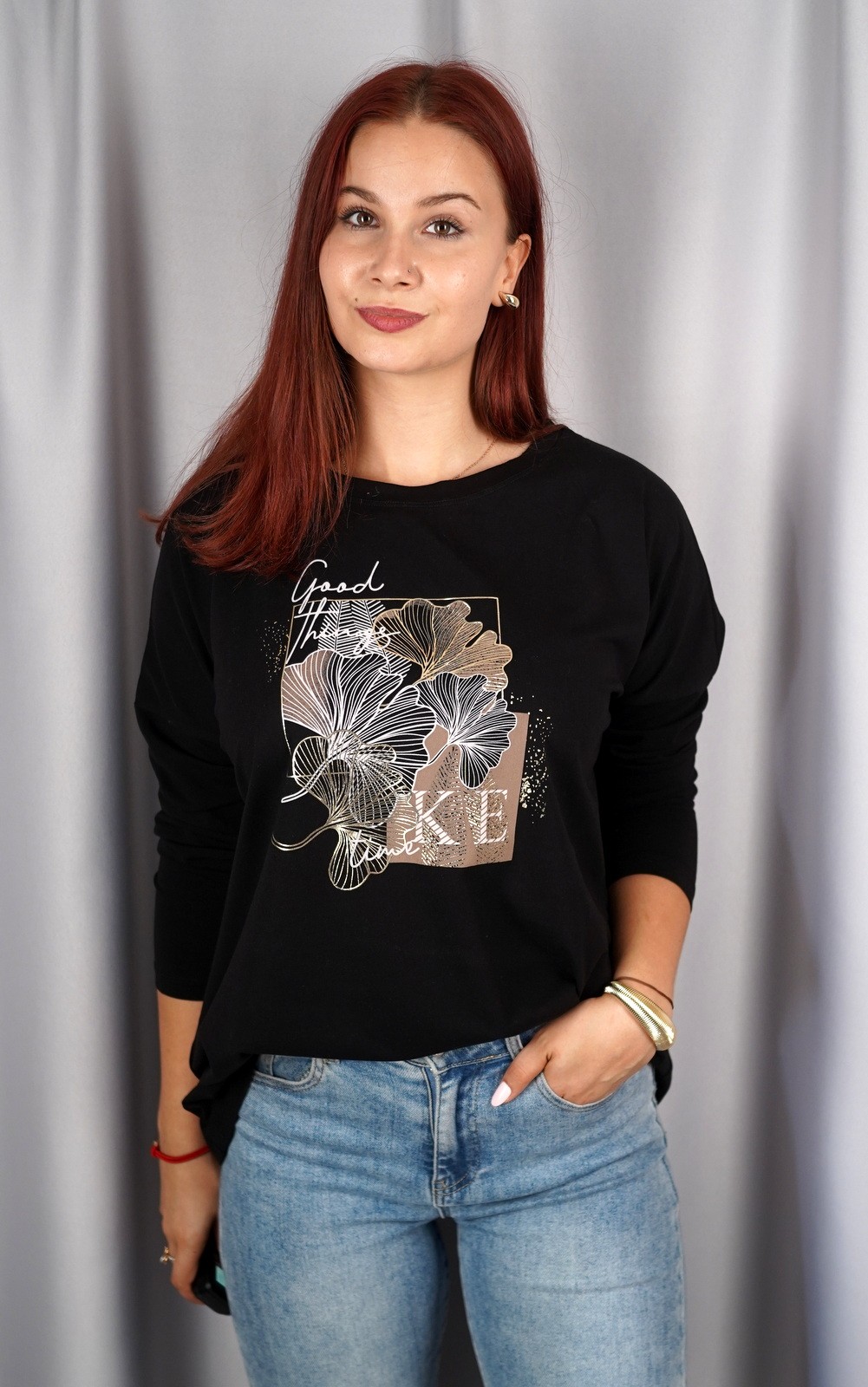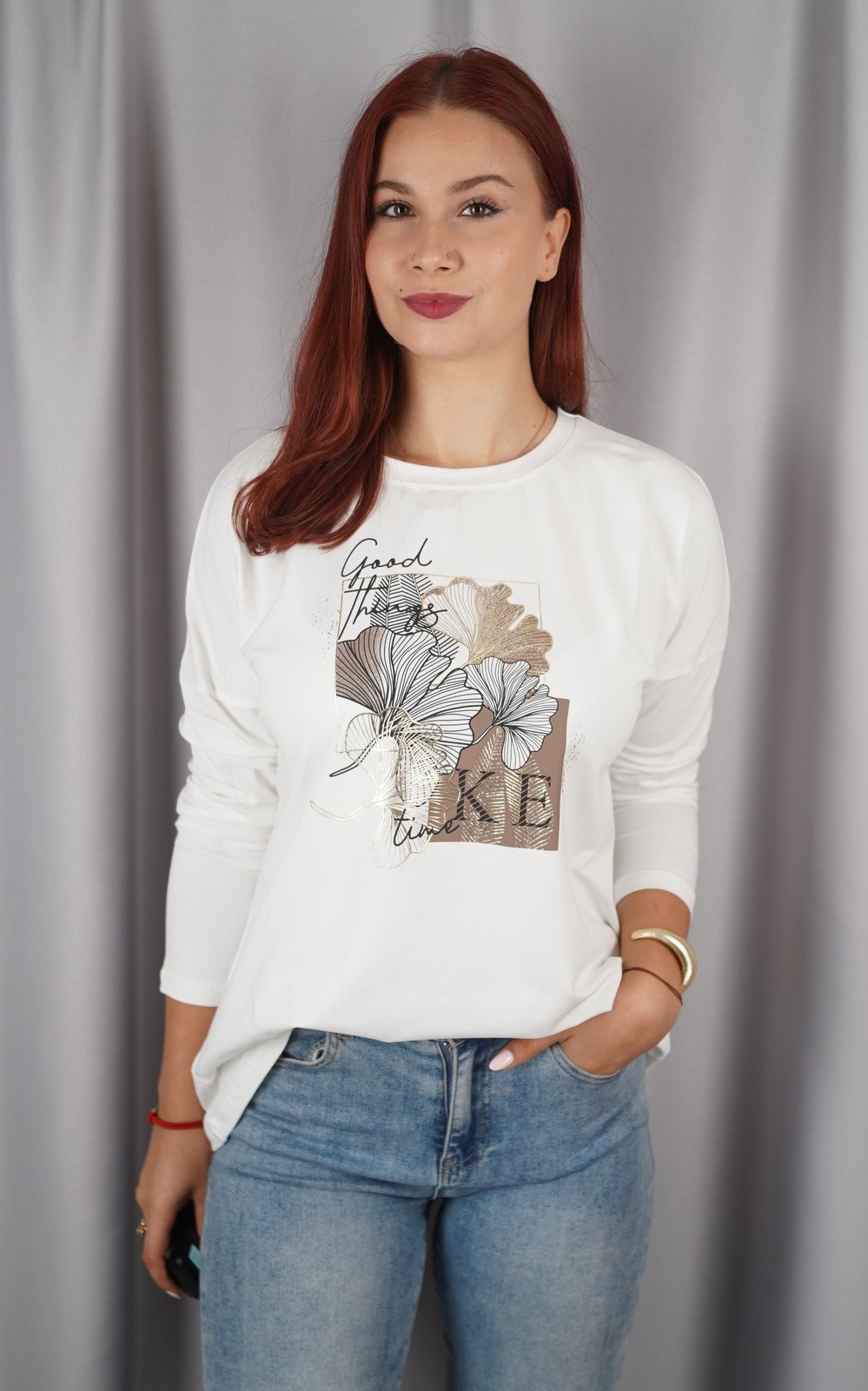 Ženska pamučna majica dugih rukava s printom cvjetnog motiva i natpisom – V9194