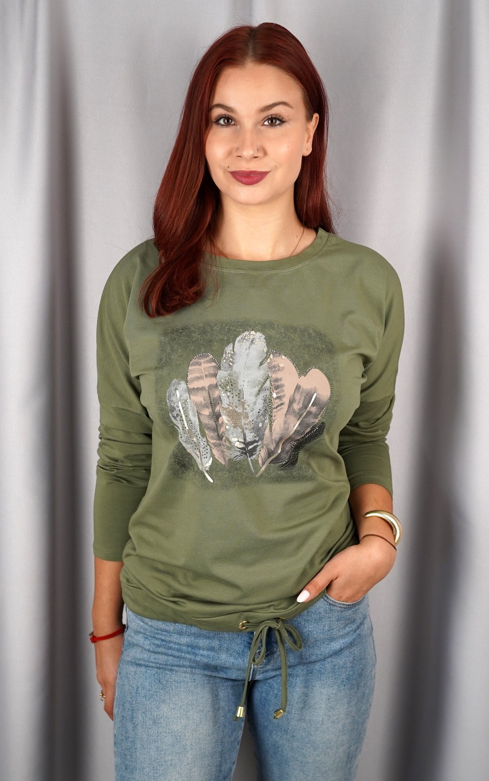 Ženska pamučna majica dugih rukava s printom perja i vezicom u struku – S0453