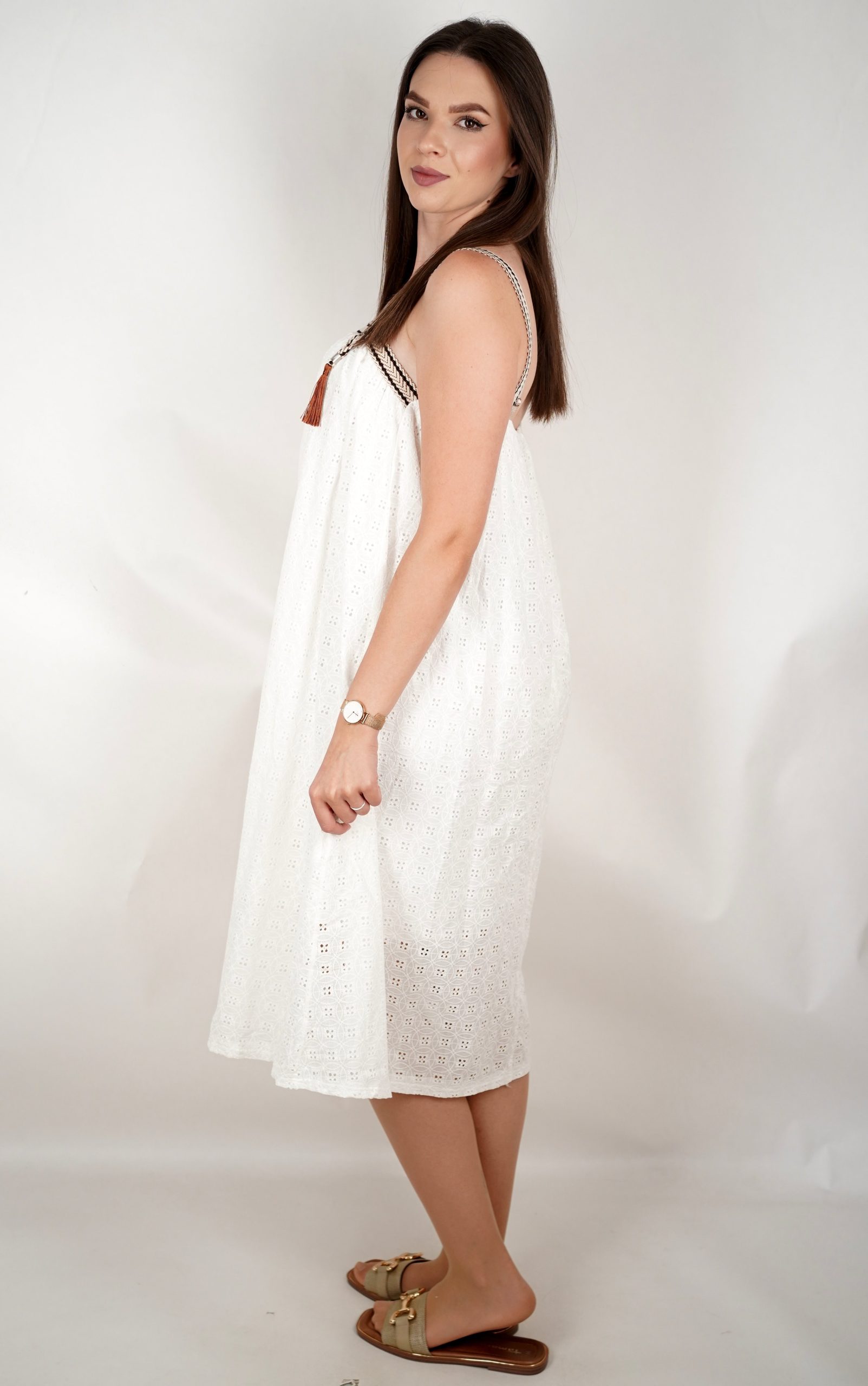 Ženska pamučna midi haljina s izvezenim rupičastim uzorkom i tankim naramenicama s resicama – 36165