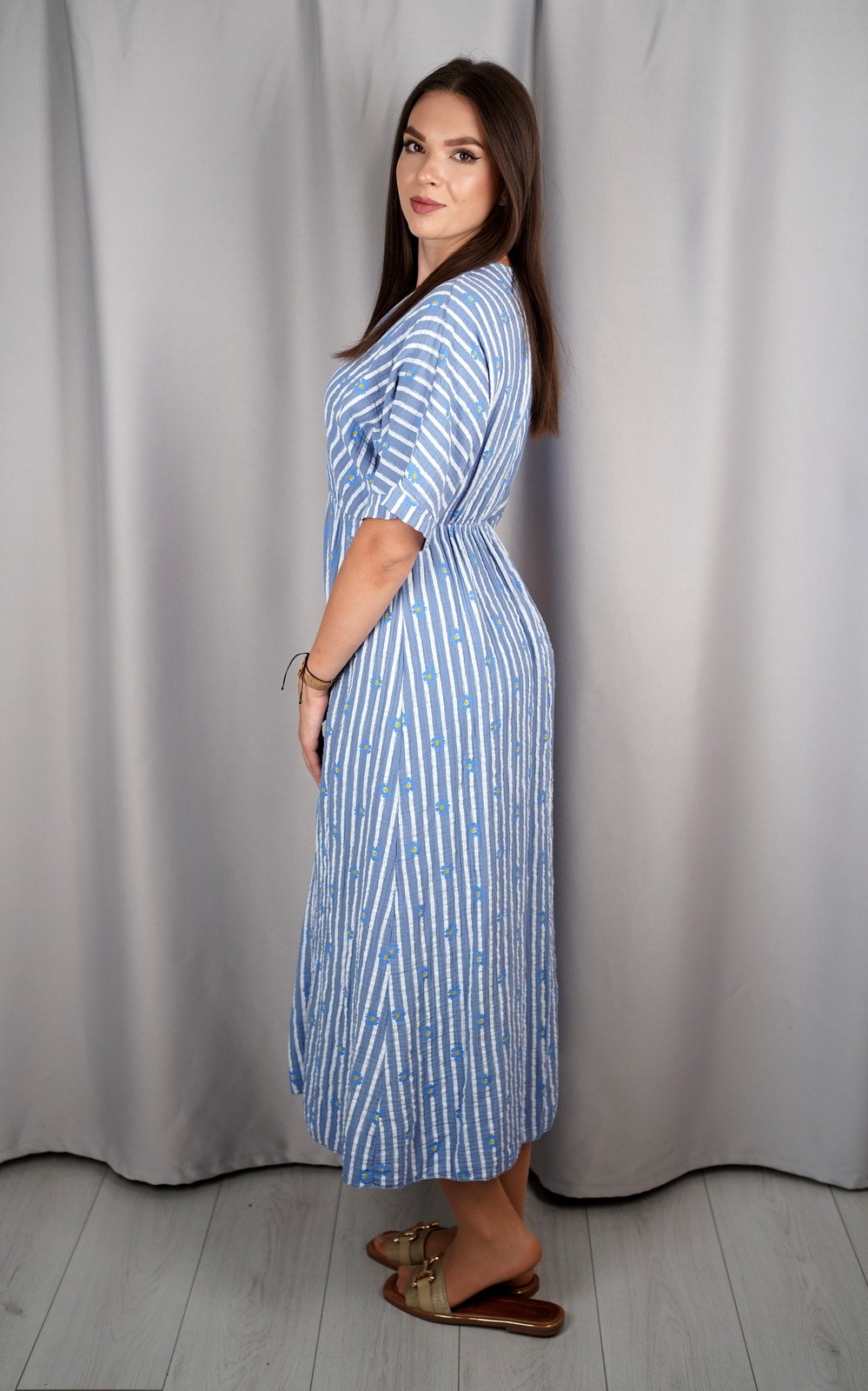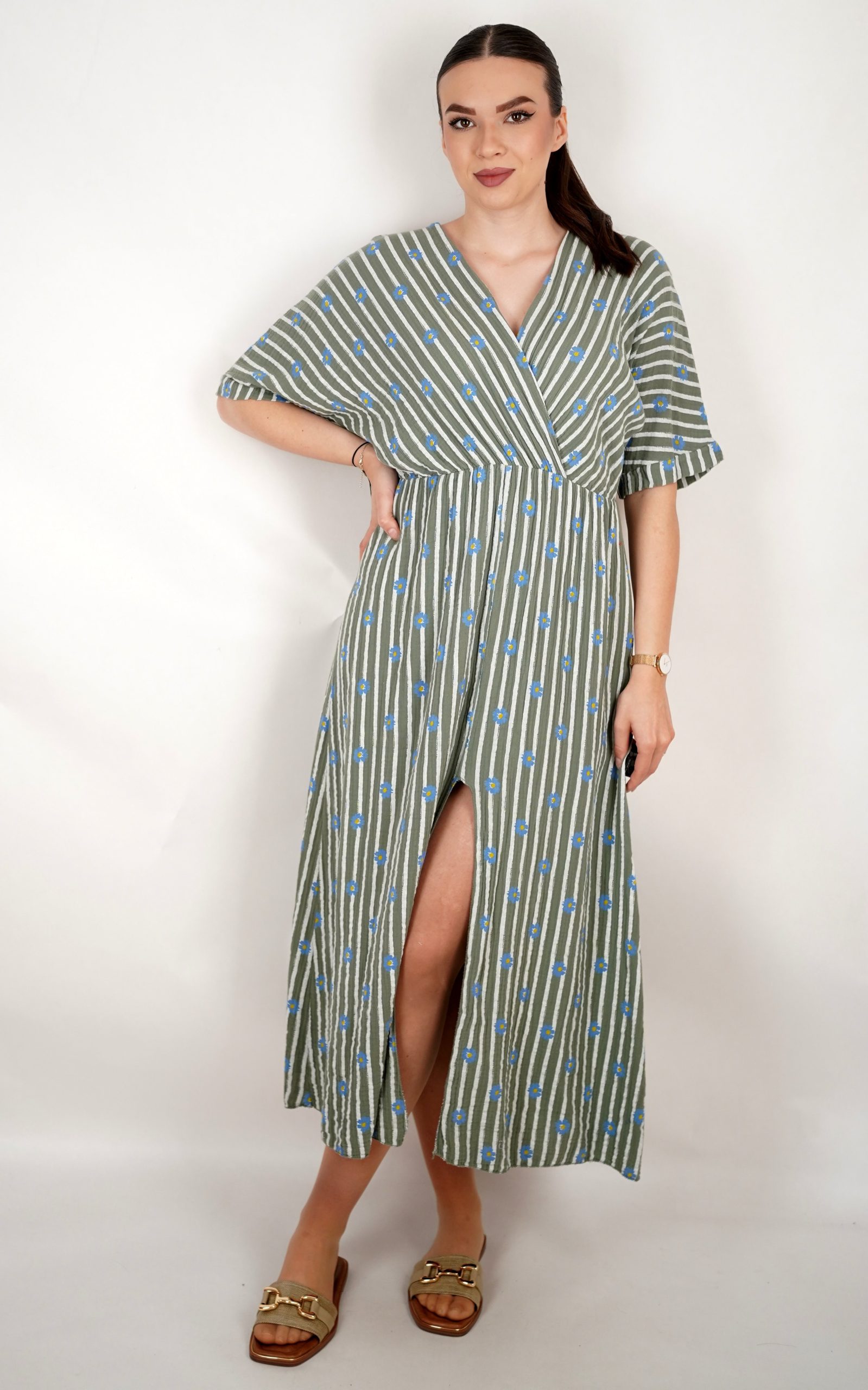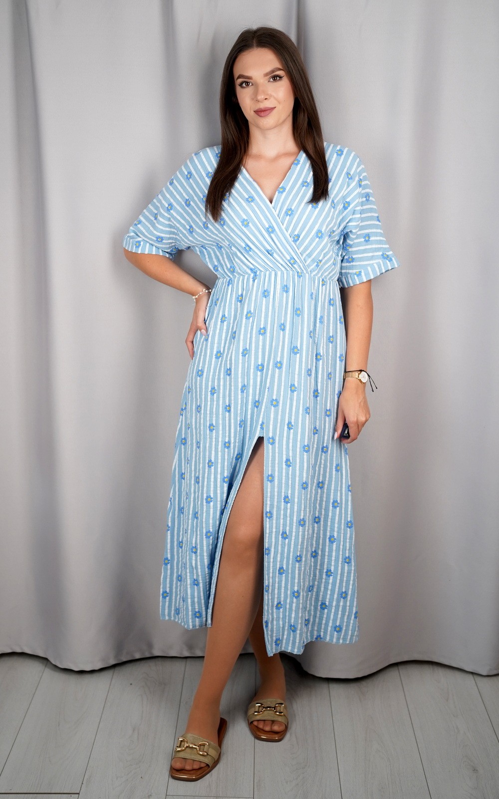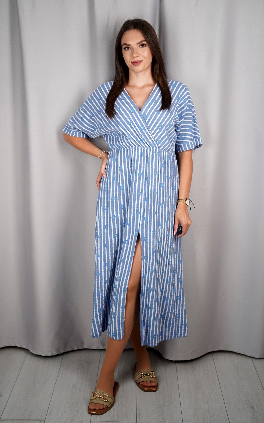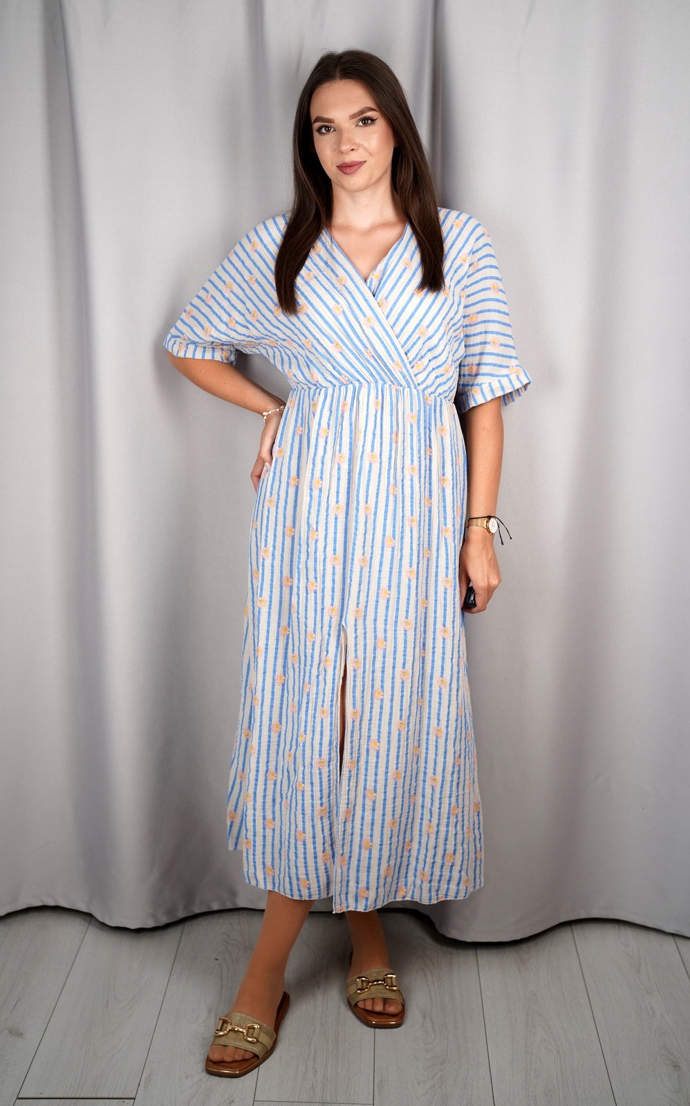Ženska pamučna midi haljina s V-izrezom, prugastim uzorkom i prorezom – gaza – ART.24321