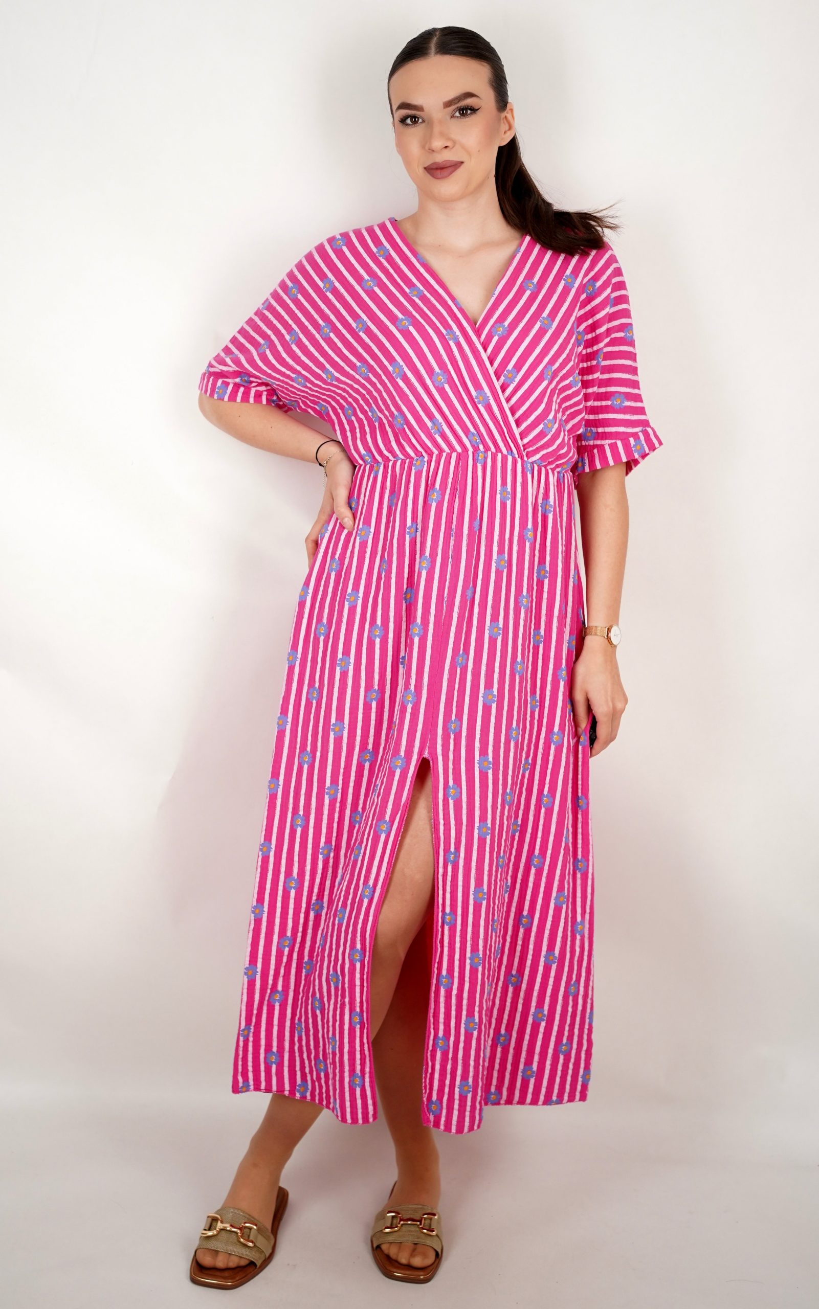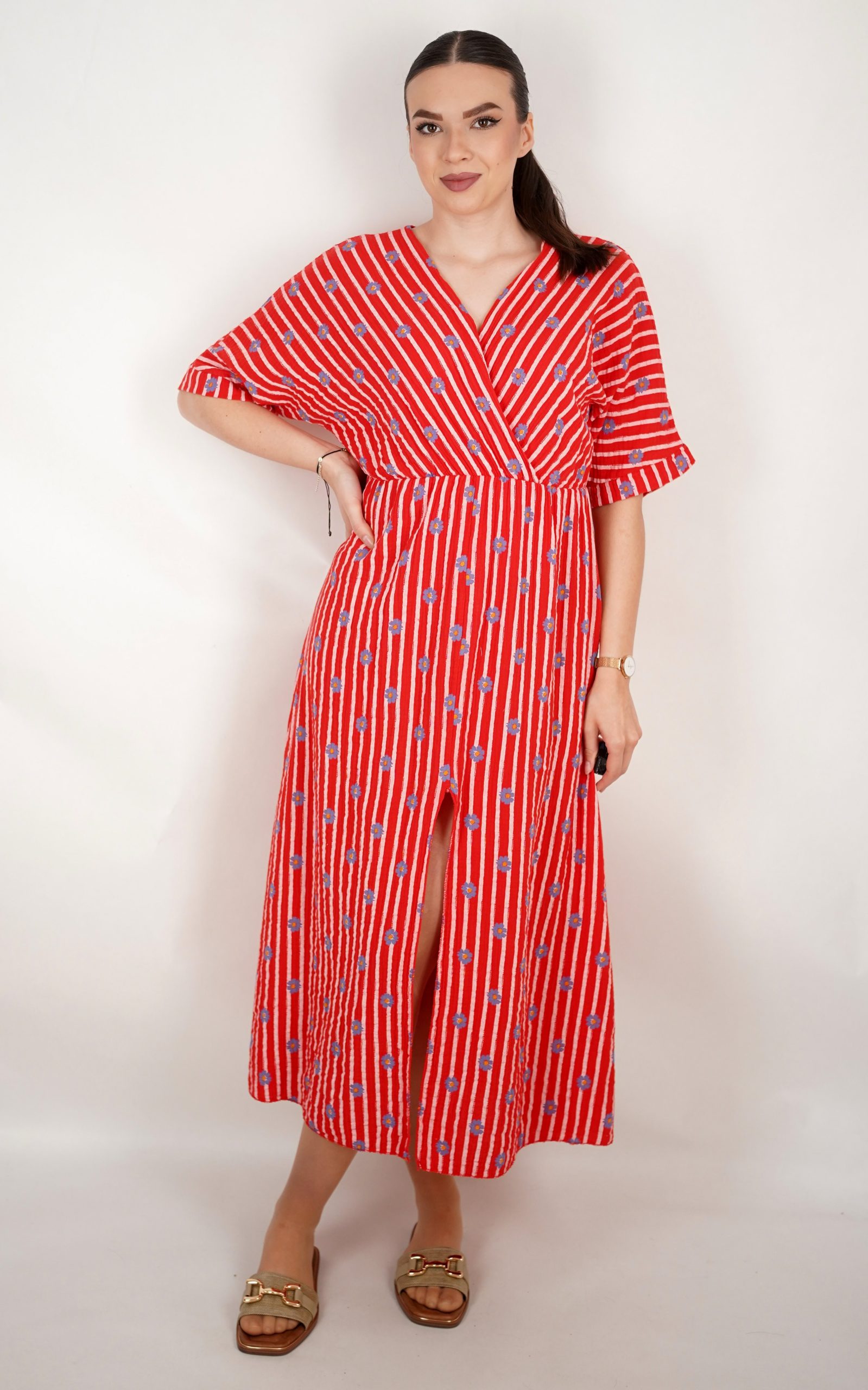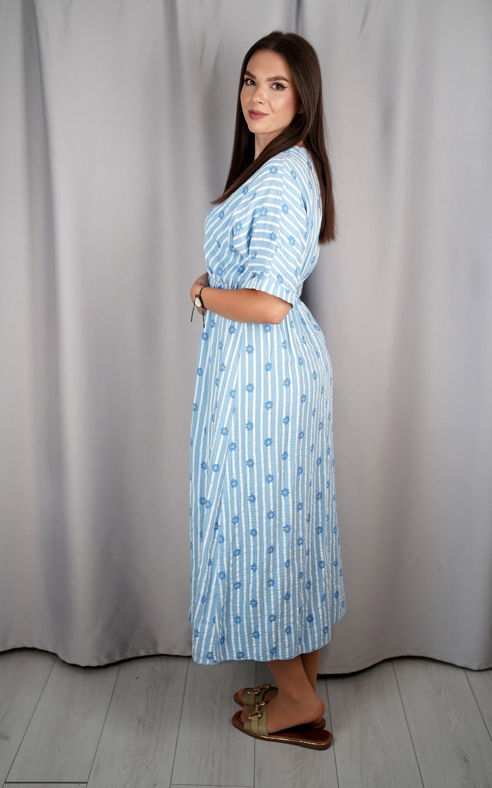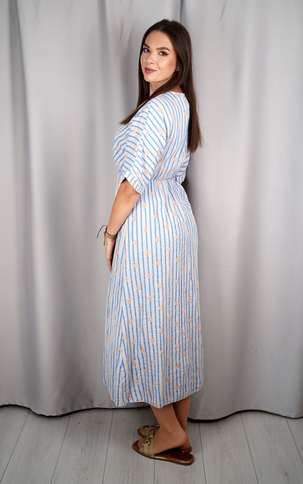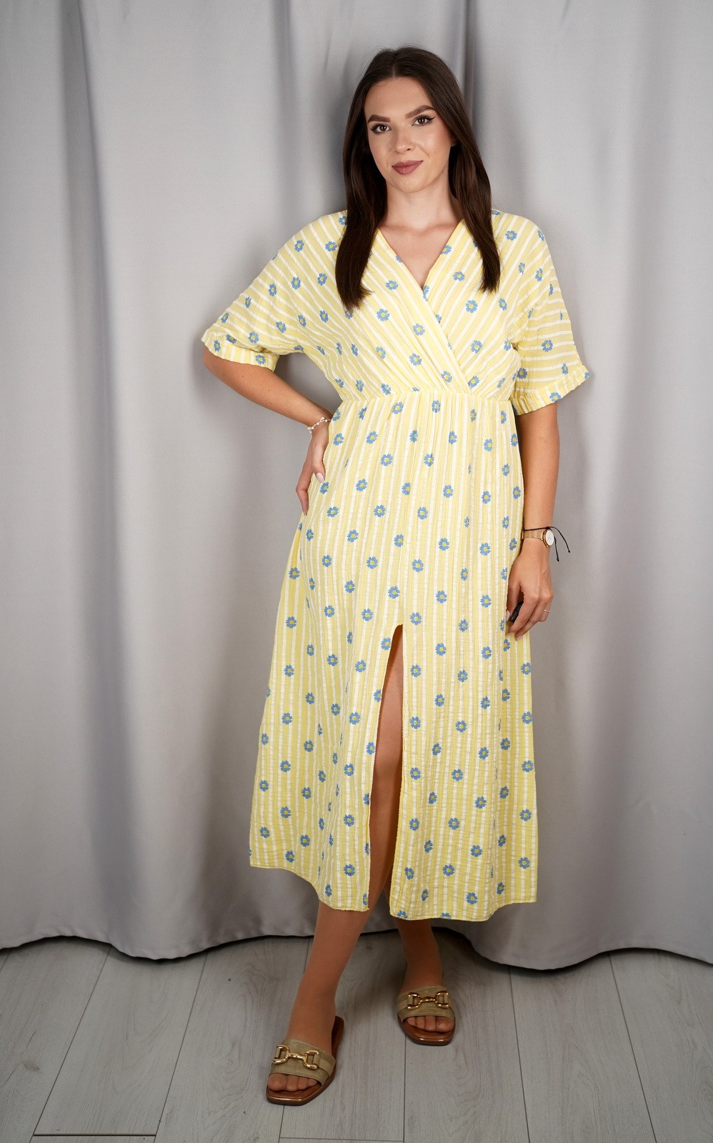 Ženska pamučna midi haljina s V-izrezom, prugastim uzorkom i prorezom – gaza – ART.24321
