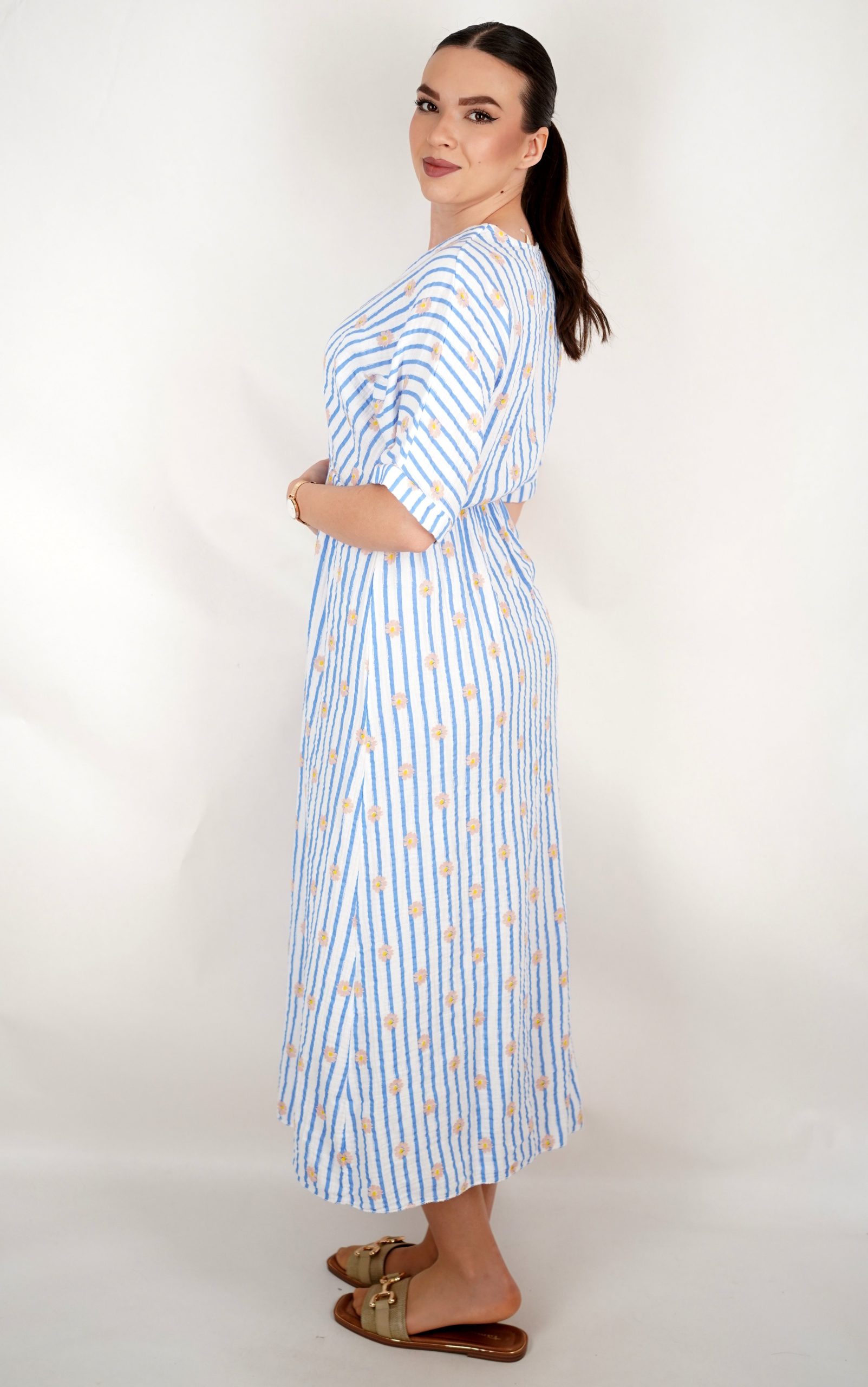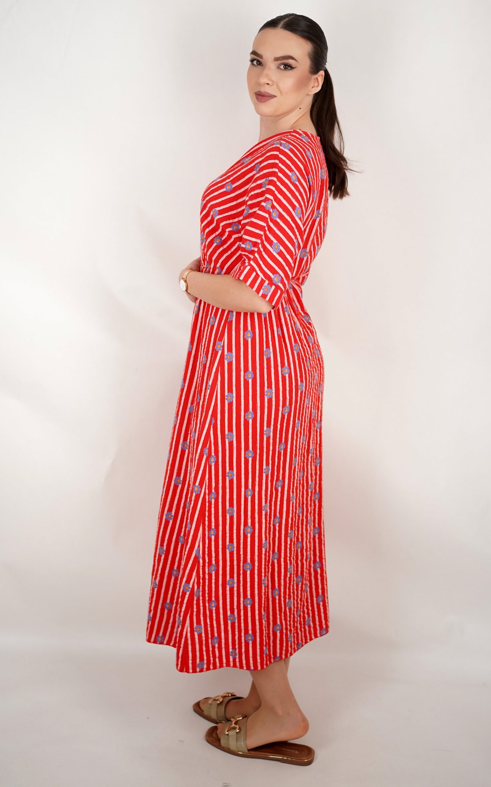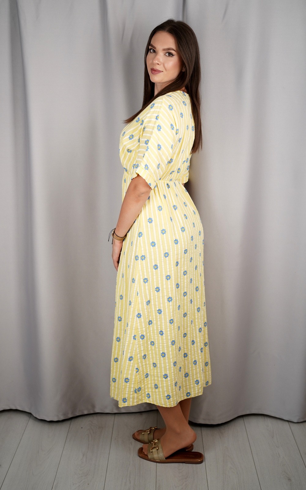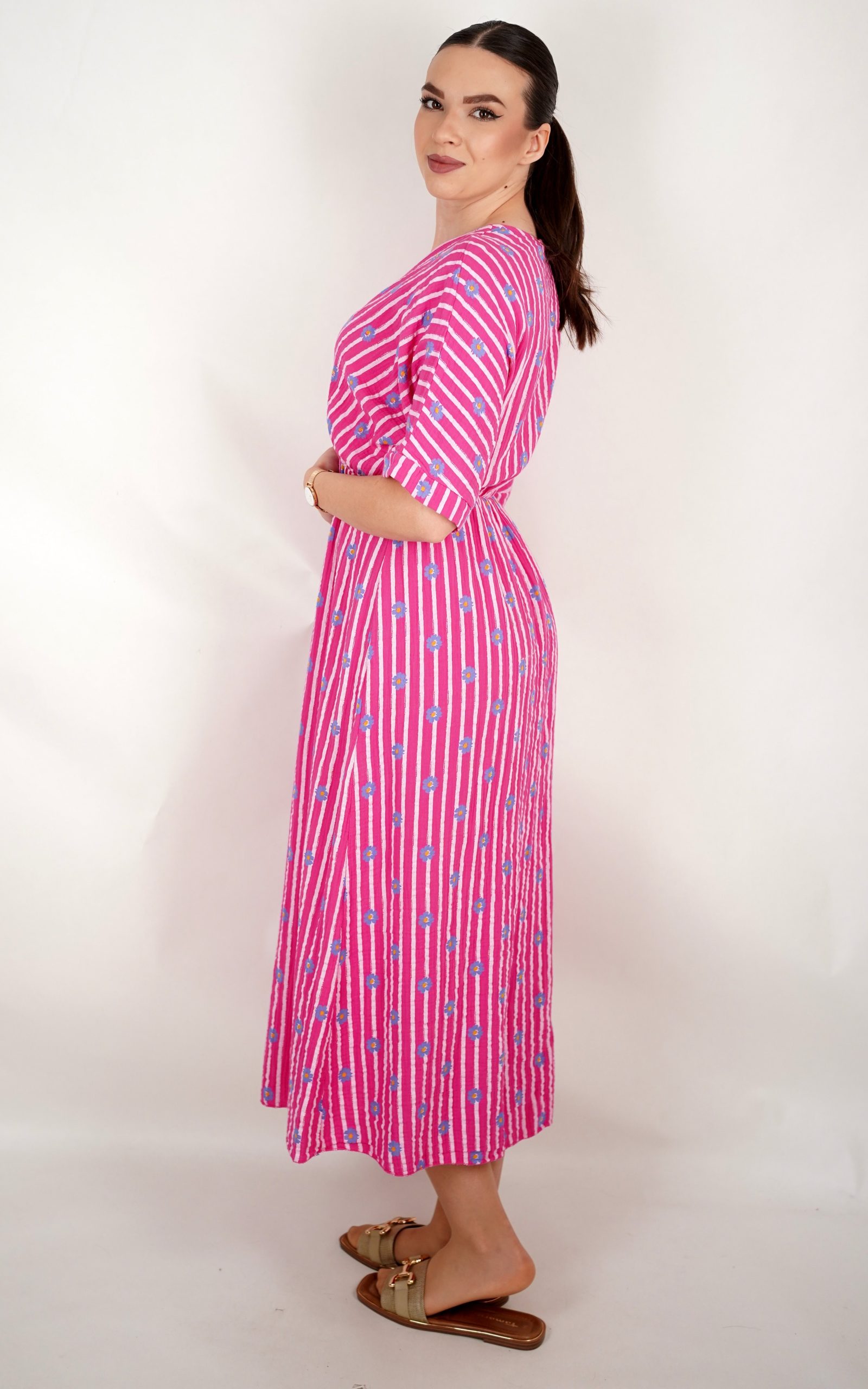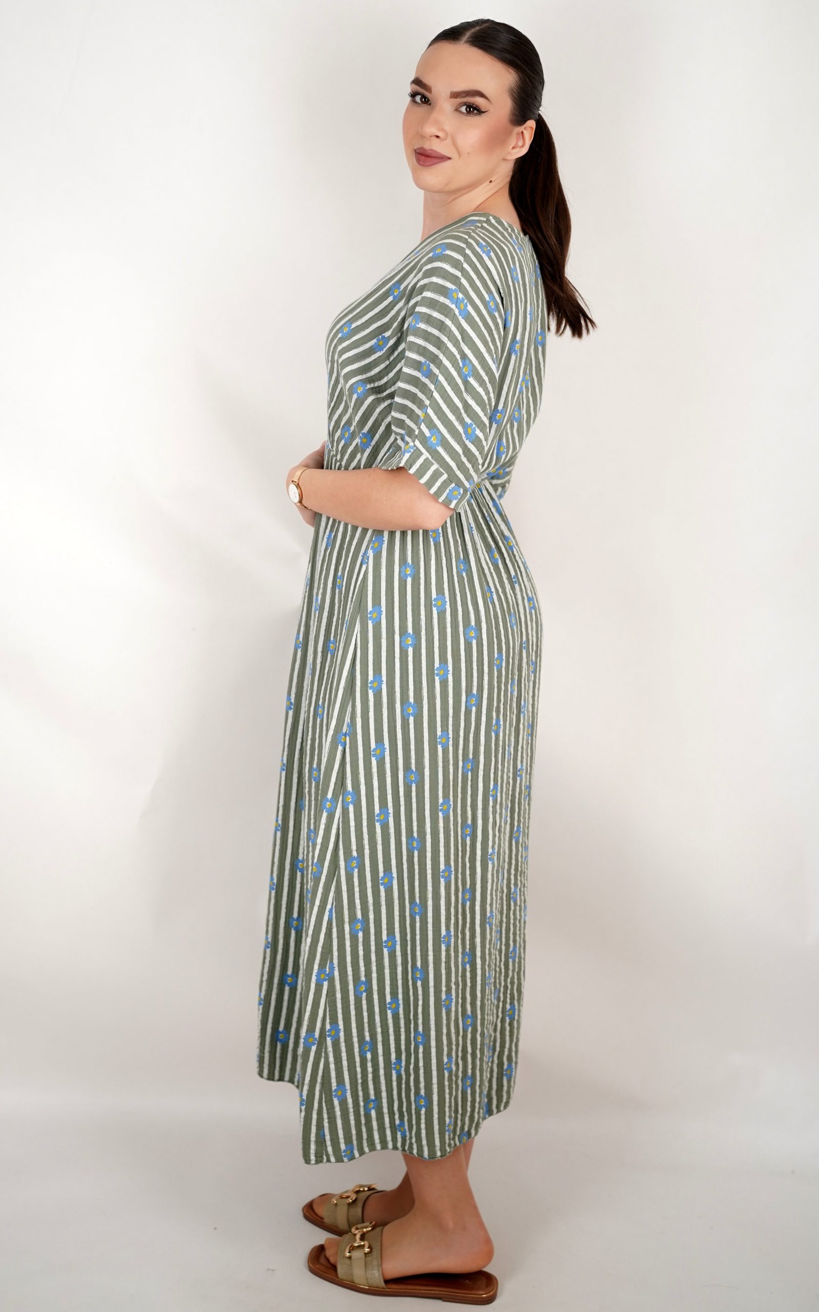 Ženska pamučna midi haljina s V-izrezom, prugastim uzorkom i prorezom – gaza – ART.24321