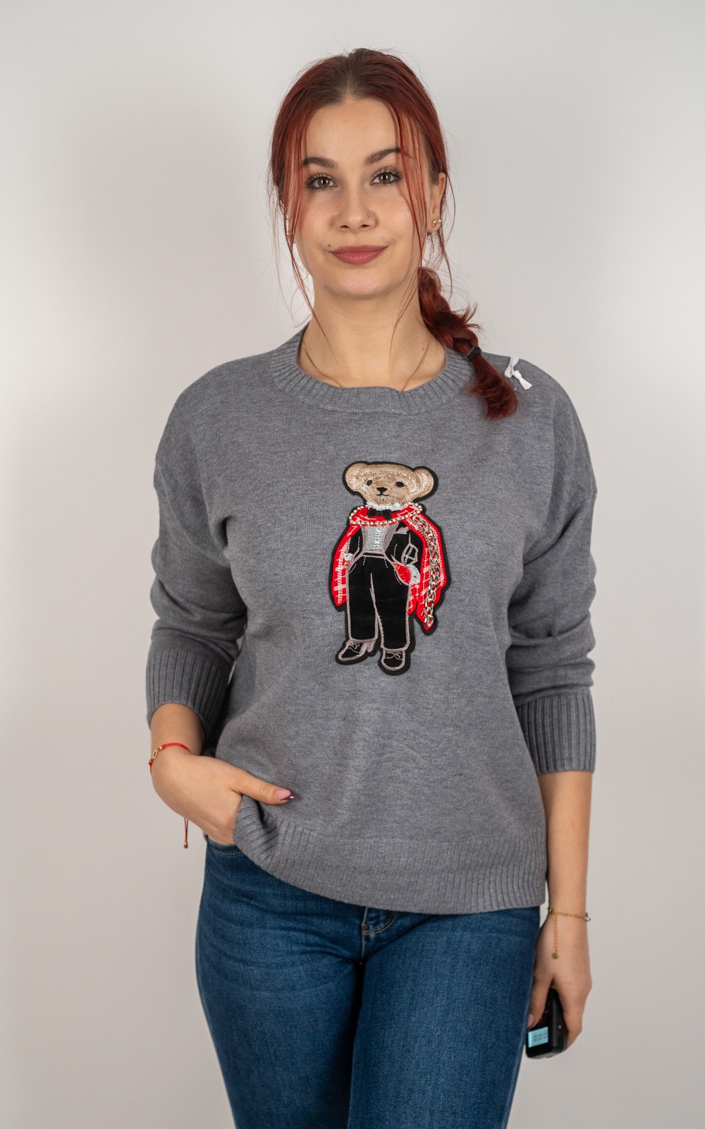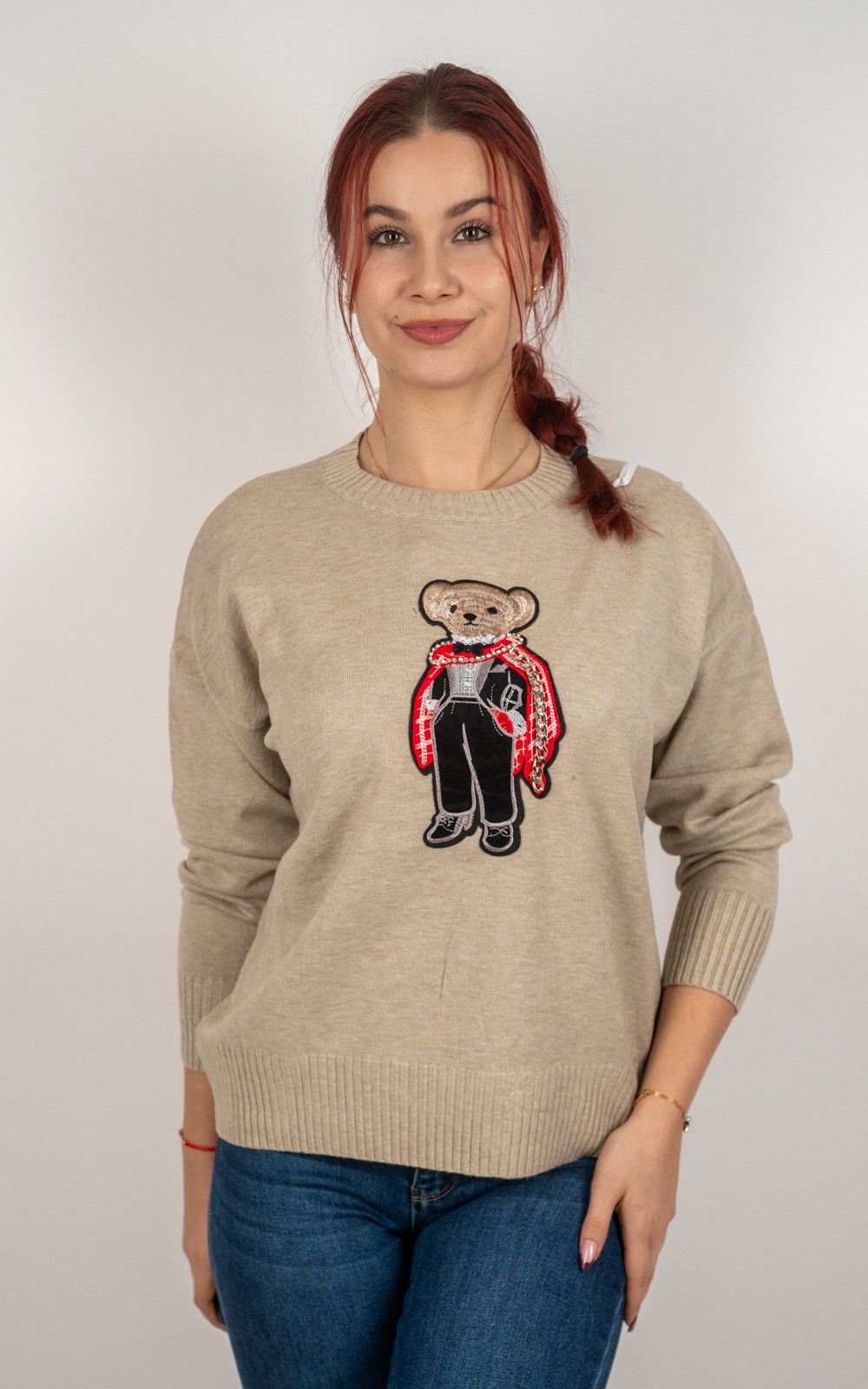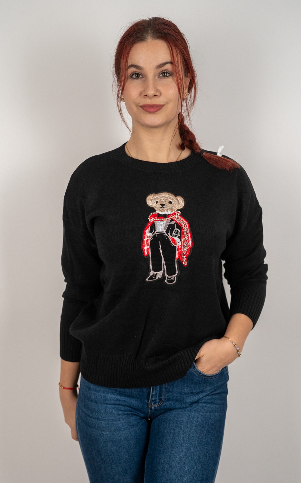Ženska pletena majica s aplikacijom medvjedića i dekorativnim detaljima – u veličinama – 3122