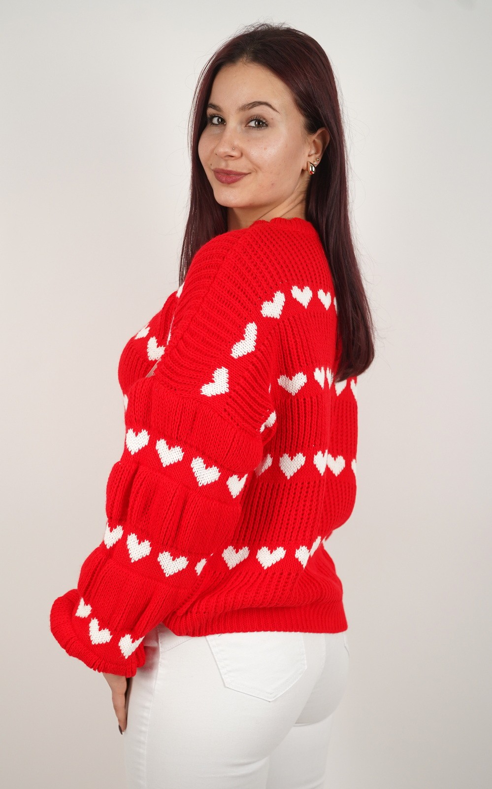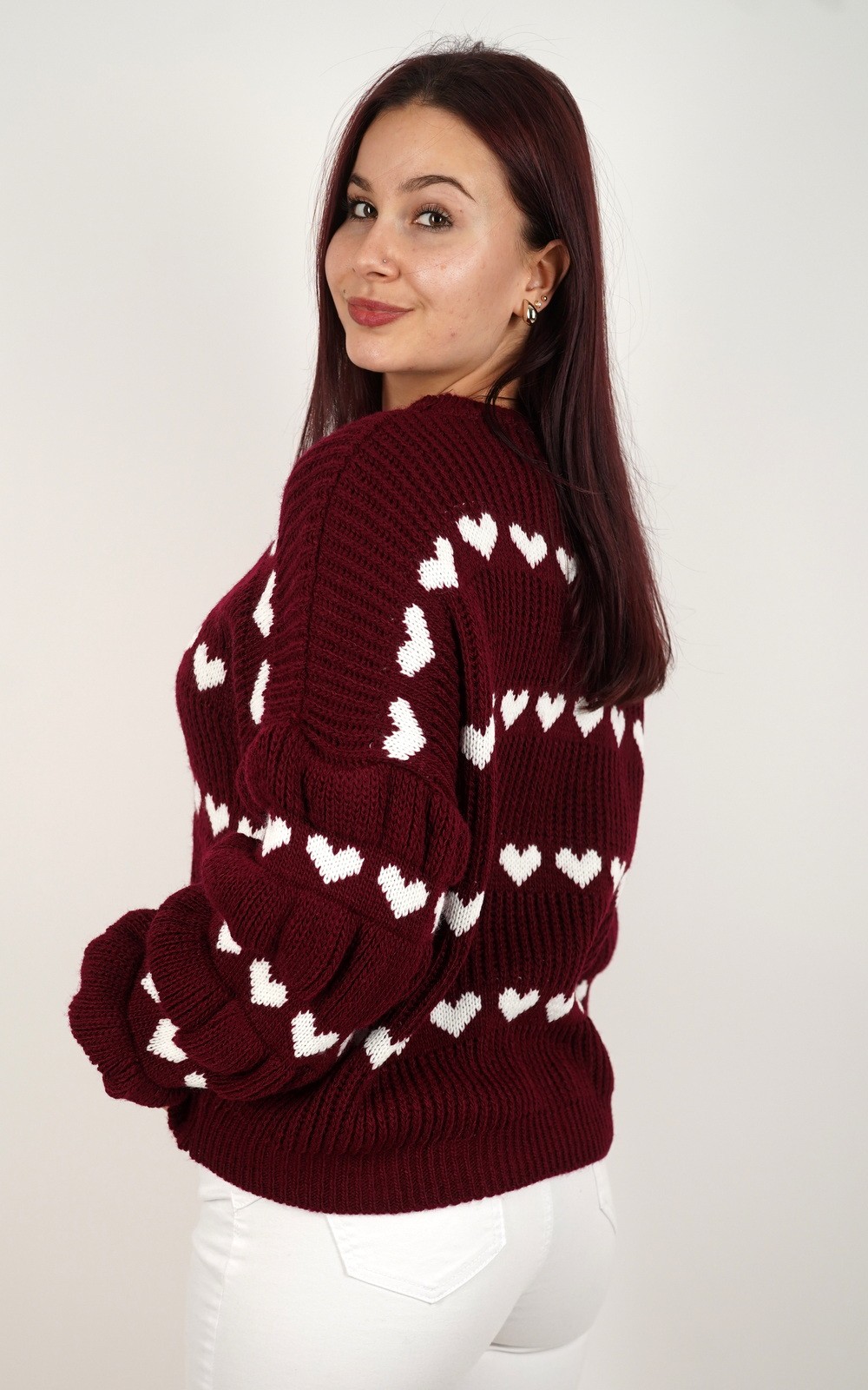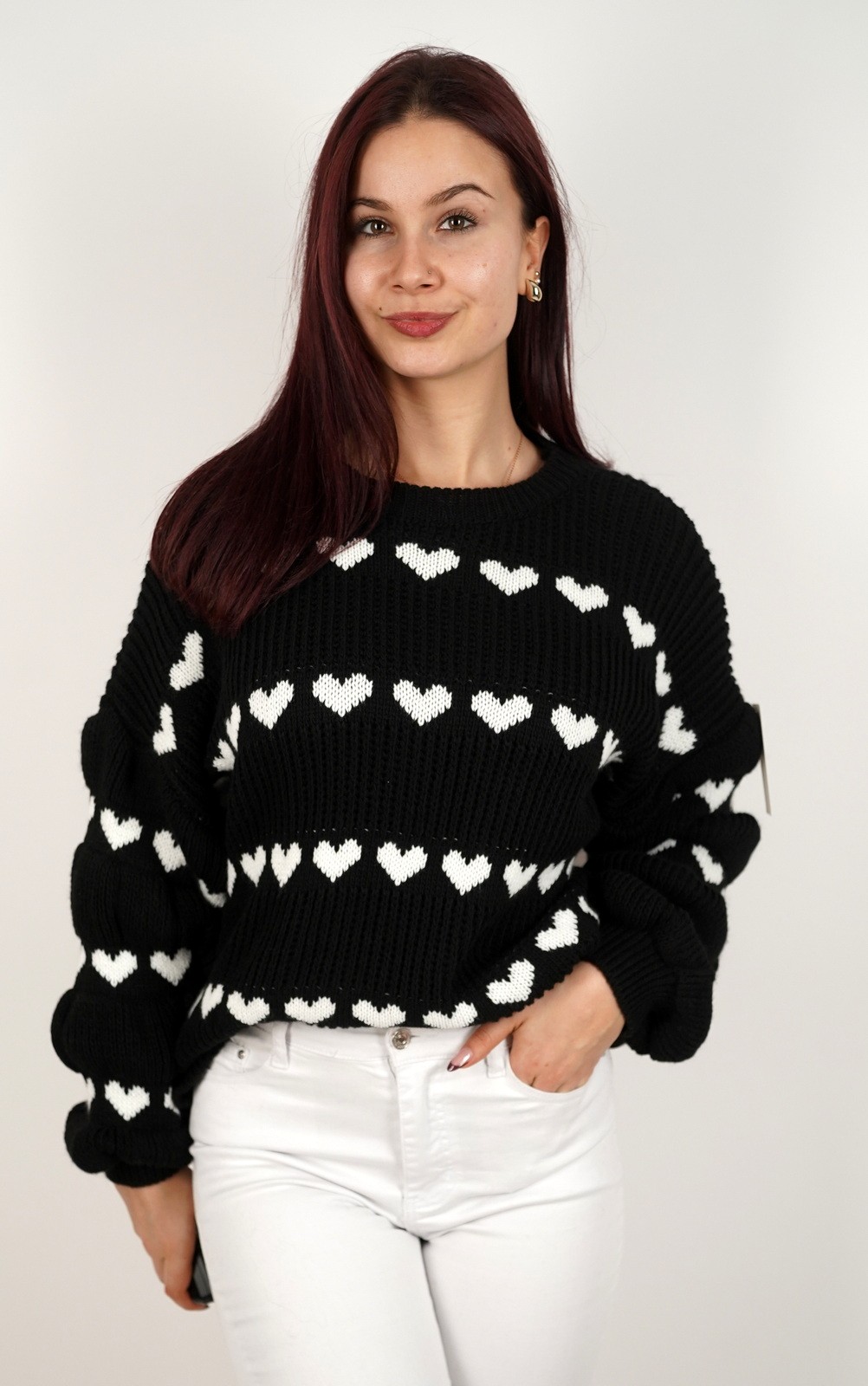Mekana pletiva majica dolazi s romantičnim uzorkom srca i modernim puf rukavima koji joj daju poseban, trendi izgled. Topla, udobna i savršena za svaki casual jesensko-zimski outfit.