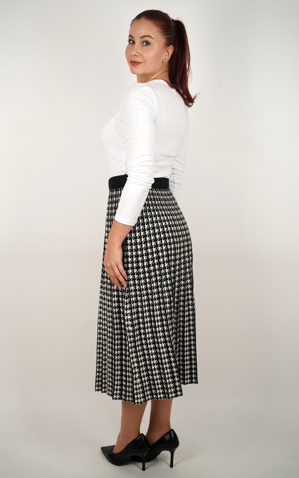 Ženska midi suknja izrađena od mekanog i udobnog pletiva s profinjenim kariranim uzorkom. Plisirani kroj pruža lepršavost i eleganciju pri svakom koraku, dok elastični pojas omogućuje savršeno pristajanje i udobnost tijekom cijelog dana. Ova suknja jednostavno se kombinira uz bluze, dolčevite ili tanke džempere, čineći je idealnim izborom za ured, večernje prilike ili svakodnevne modne kombinacije. Klasičan dizajn koji nikad ne izlazi iz mode.