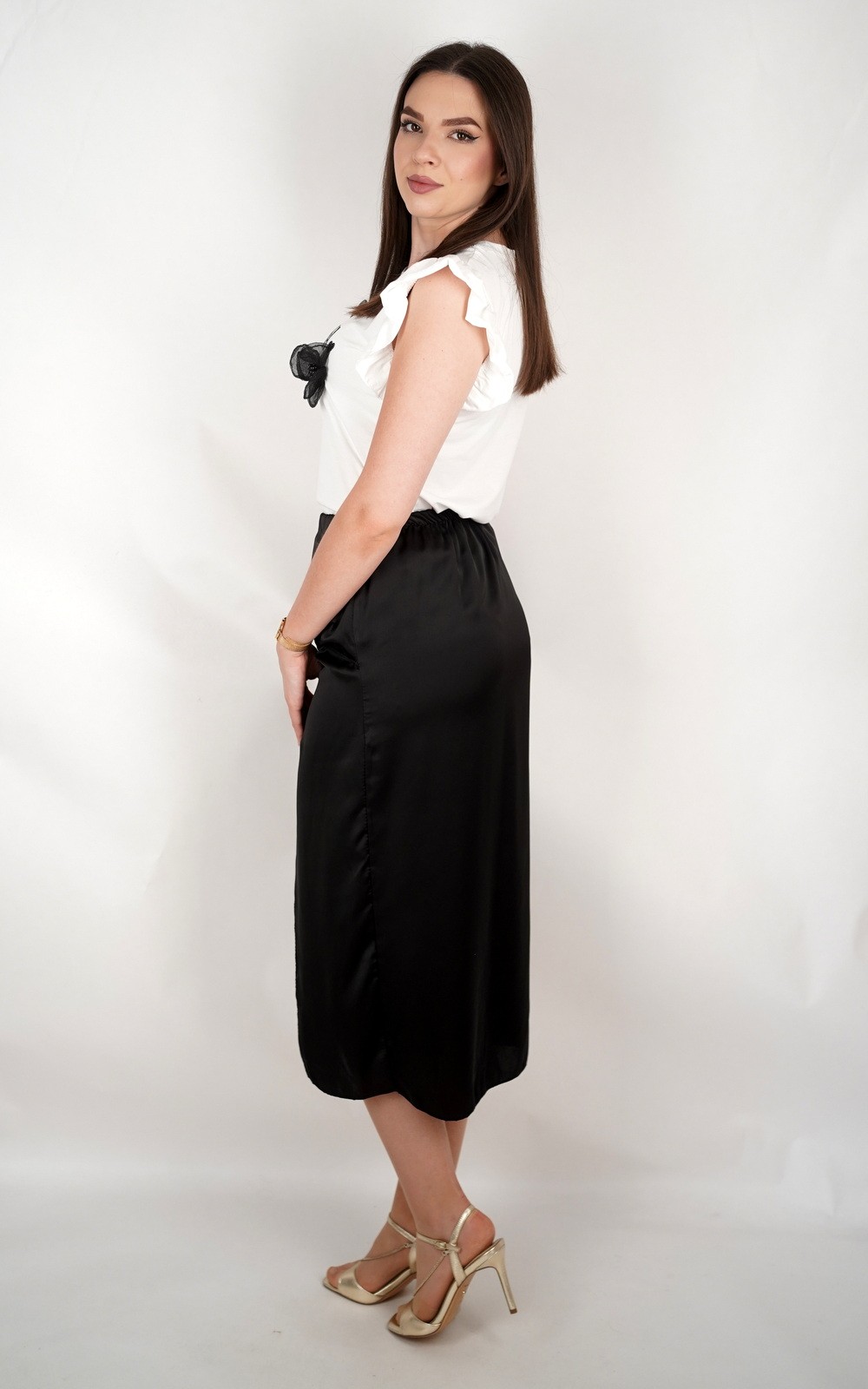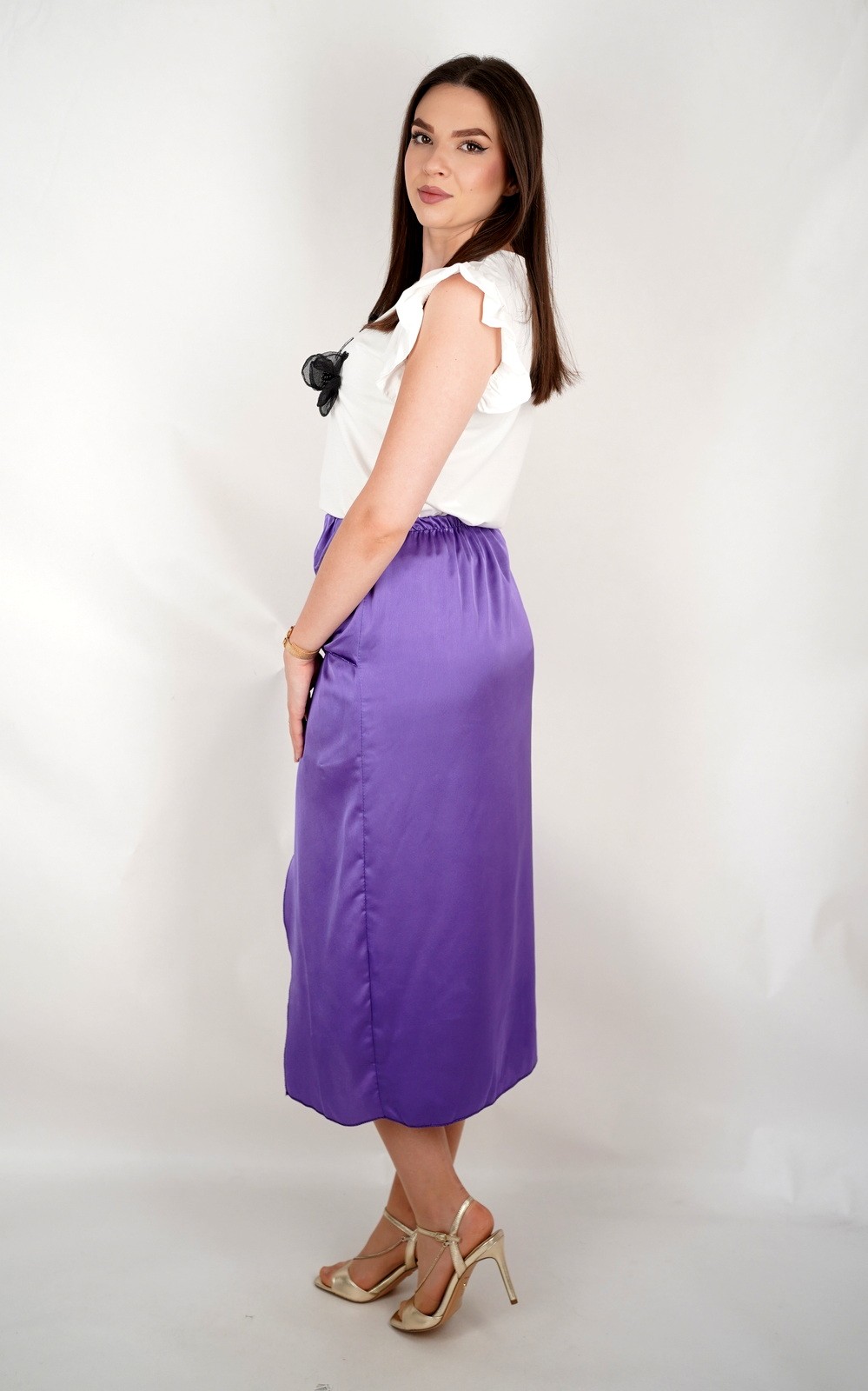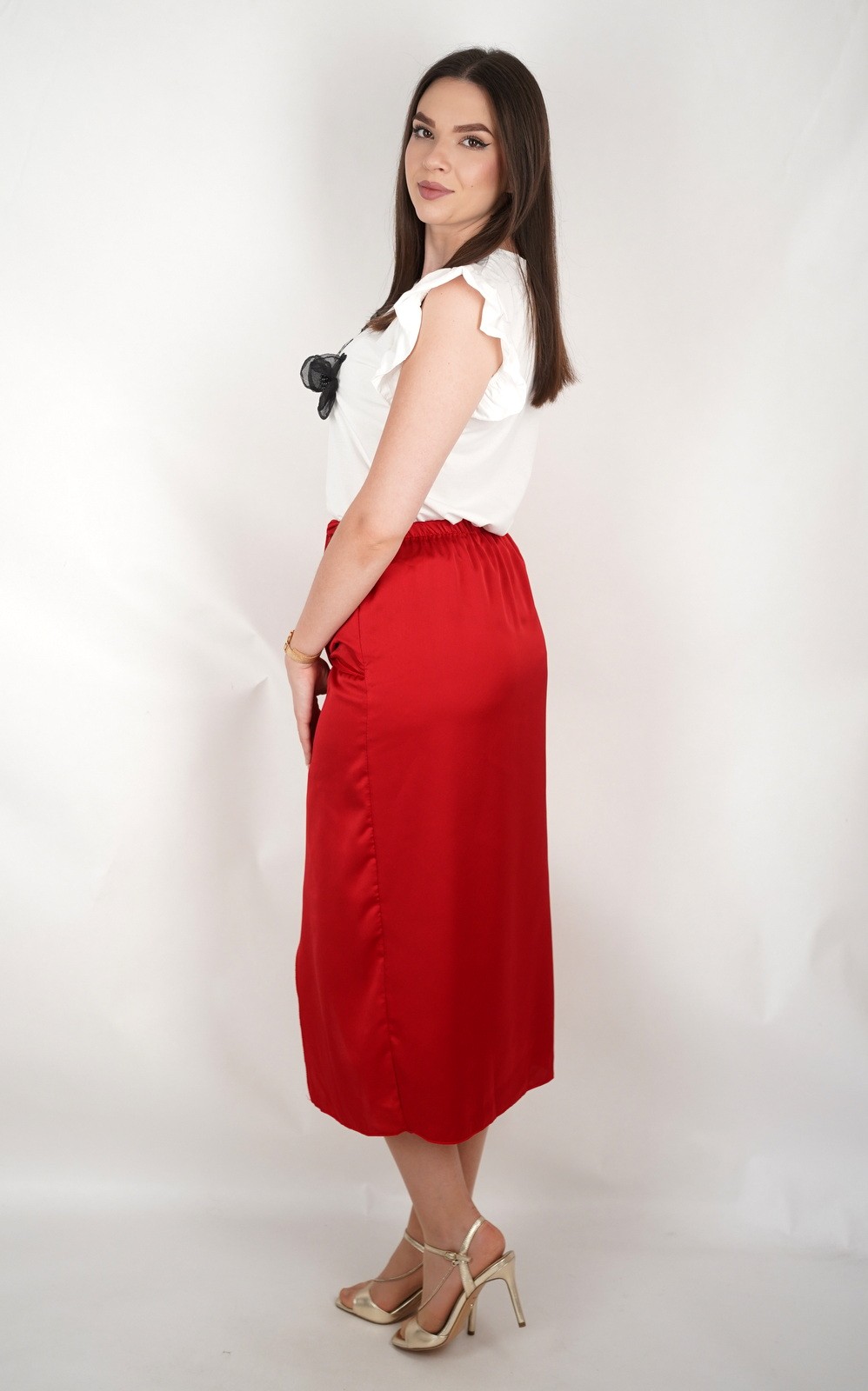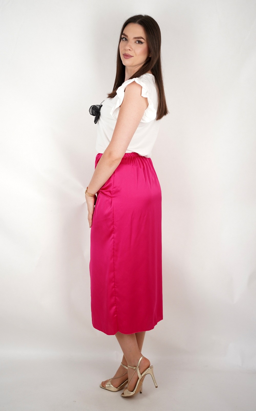 Ova elegantna i ženstvena satenska suknja midi dužine idealna je za posebne prigode, večernje izlaske ili kao glamurozan dodatak dnevnim kombinacijama. Izrađena je od sjajnog satenskog materijala koji lijepo reflektira svjetlost i daje luksuzan izgled. Prednji čvor stvara efekt nabora u struku i dodatno naglašava figuru, dok asimetrični prorez na prednjem dijelu dodaje dašak senzualnosti i otkriva nogu na suptilan, ali atraktivan način. Suknja se lako kombinira uz jednobavne bluze, majice ili sako, a savršeno izgleda uz visoke pete ili sandale. Model koji odiše sofisticiranošću i modernim dizajnom.