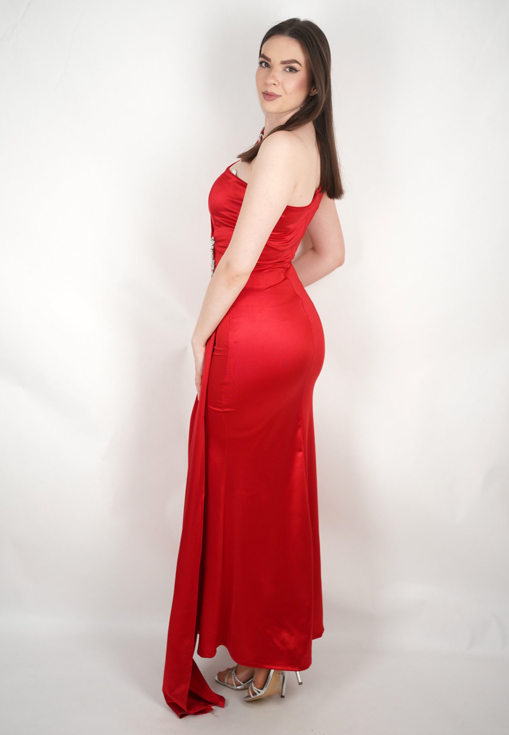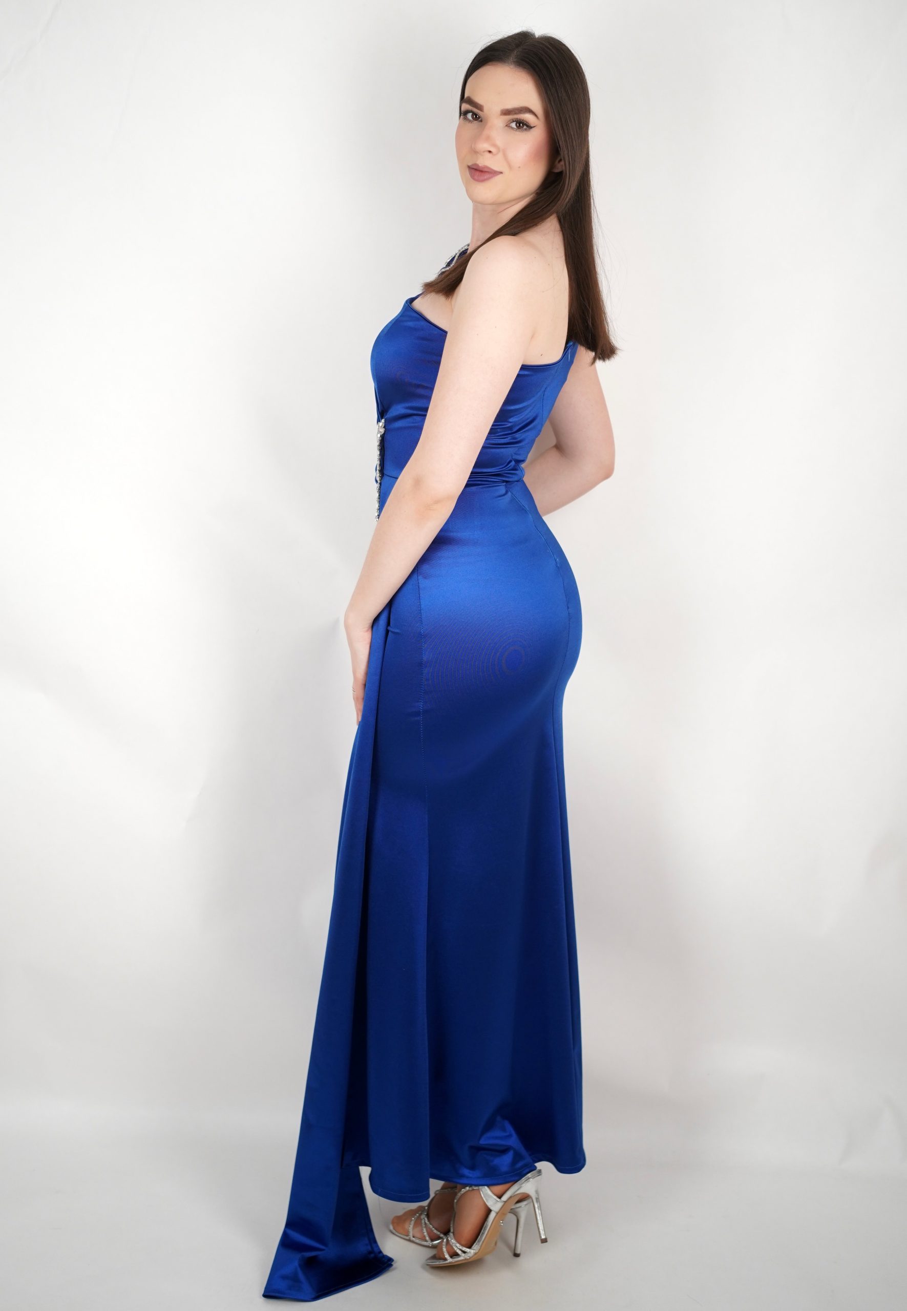 Zasjajite na svakoj svečanoj prigodi uz ovu izuzetno ženstvenu i elegantnu večernju haljinu na jedno rame. Sofisticirani kroj s prelijepim ukrasnim cvijetom na ramenu daje dozu glamura i posebnosti, dok drapirani materijal nježno naglašava liniju tijela. Visoki prorez dodaje zavodljivost i omogućuje lako kretanje, čineći ovu haljinu savršenim izborom za gala večere, svečane zabave, svadbe ili maturu. Budite u centru pažnje i osjećajte se poput prave dive u ovoj haljini koja spaja eleganciju i luksuz u svakom detalju.