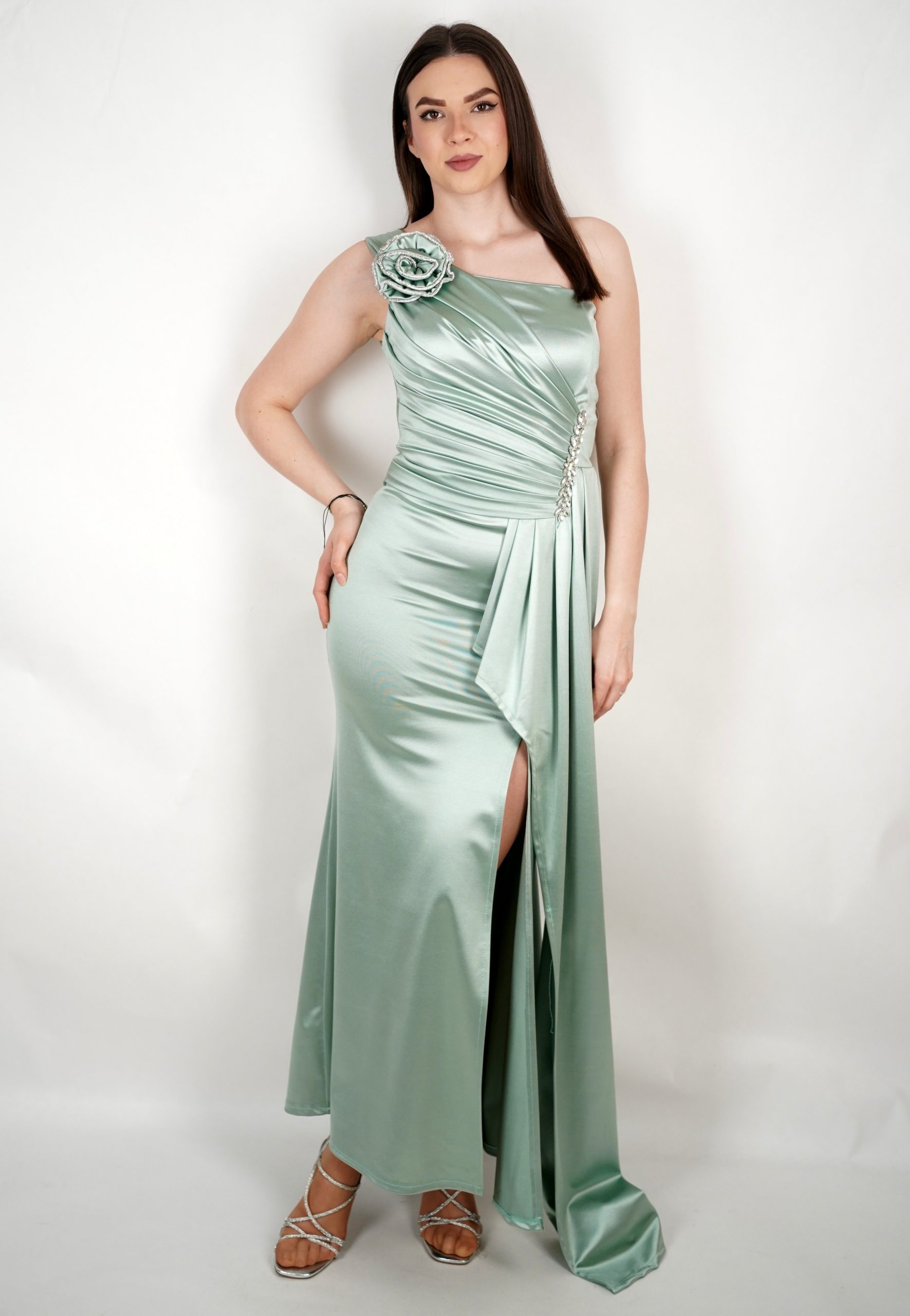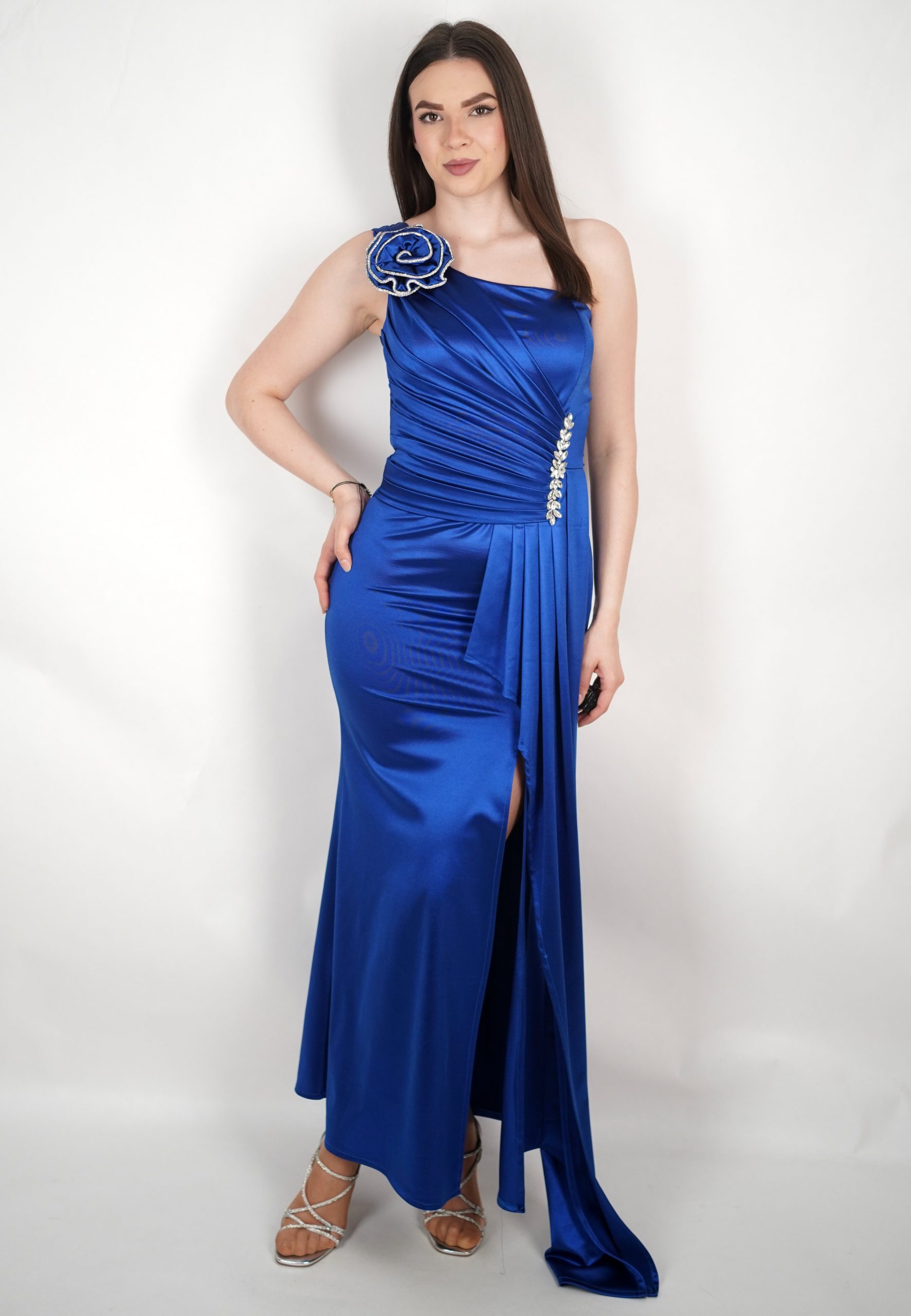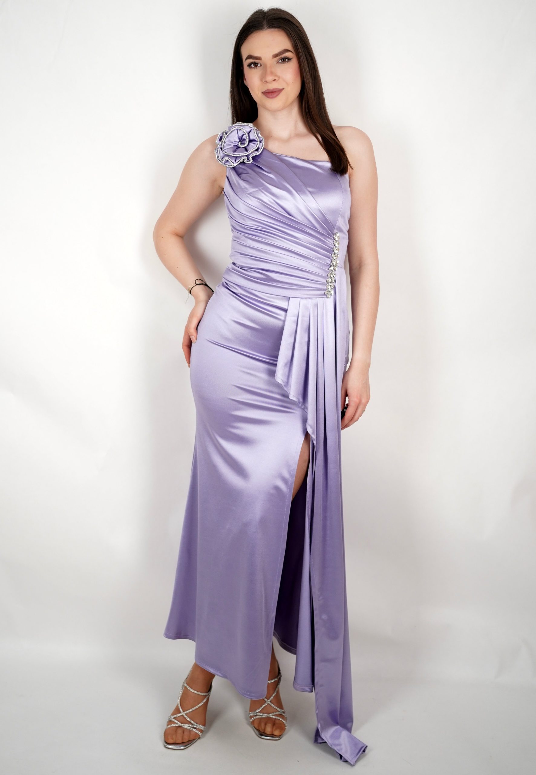 Ženska svečana haljina na jedno rame s ukrasnim cvijetom i visokim prorezom – 89614