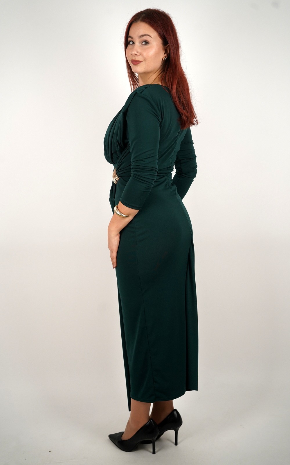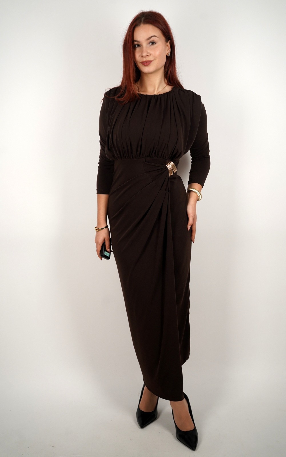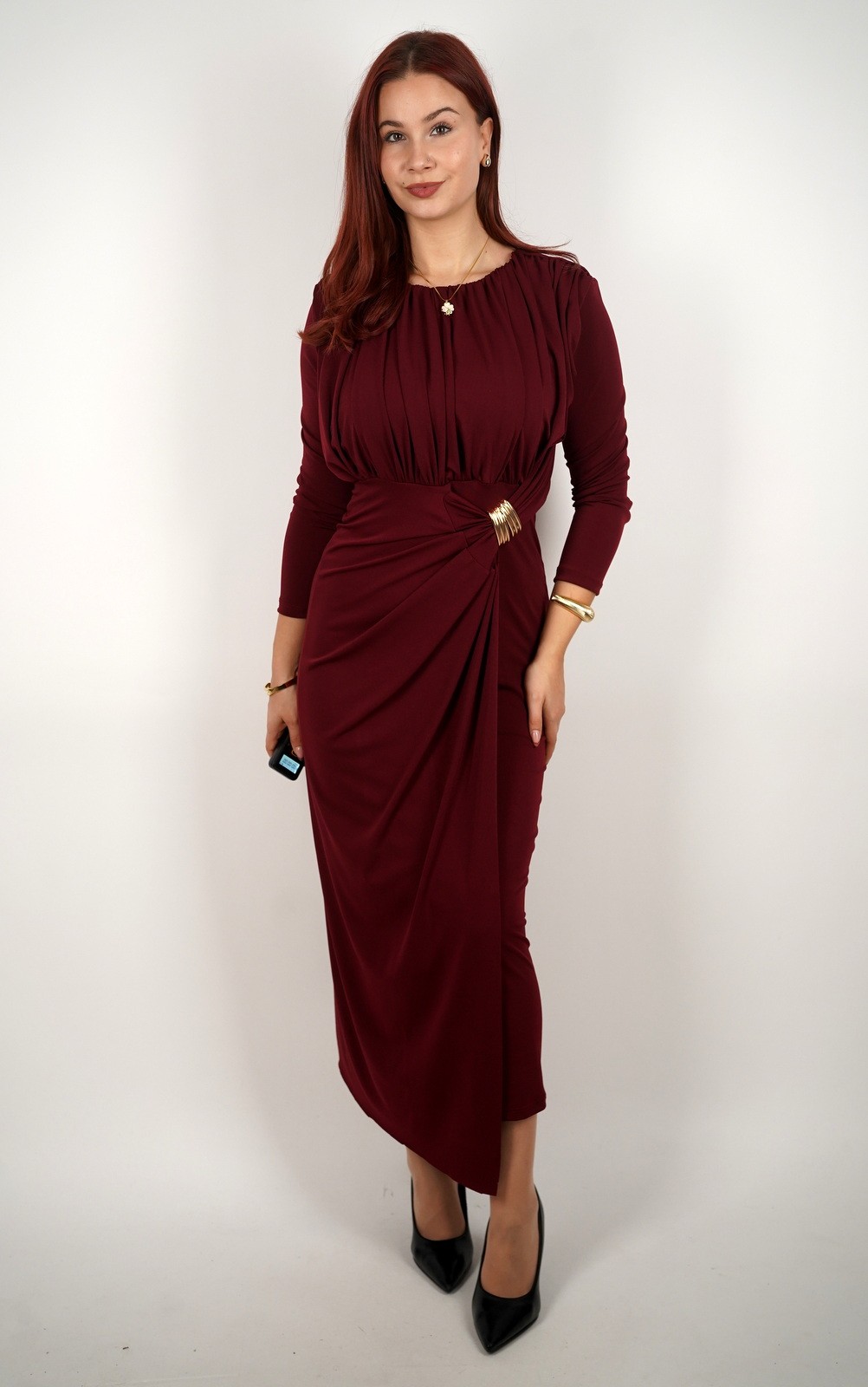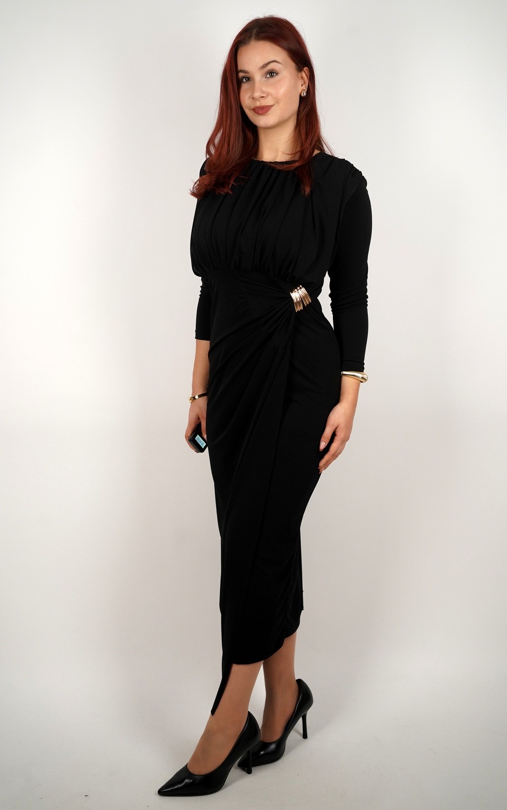 Glamurozna maksi haljina koja stvara upečatljivu siluetu. Karakterizira je asimetrični drapirani preklop preko prednjeg dijela, koji vizualno izdužuje figuru. U struku je naglašena dekorativnom, sjajnom metalnom kopčom koja drži drapiranje. Elegantni dugi rukavi i boat ili okrugli izrez upotpunjuju izgled. Idealna za svečane prigode, domjenke i večernje izlaske.