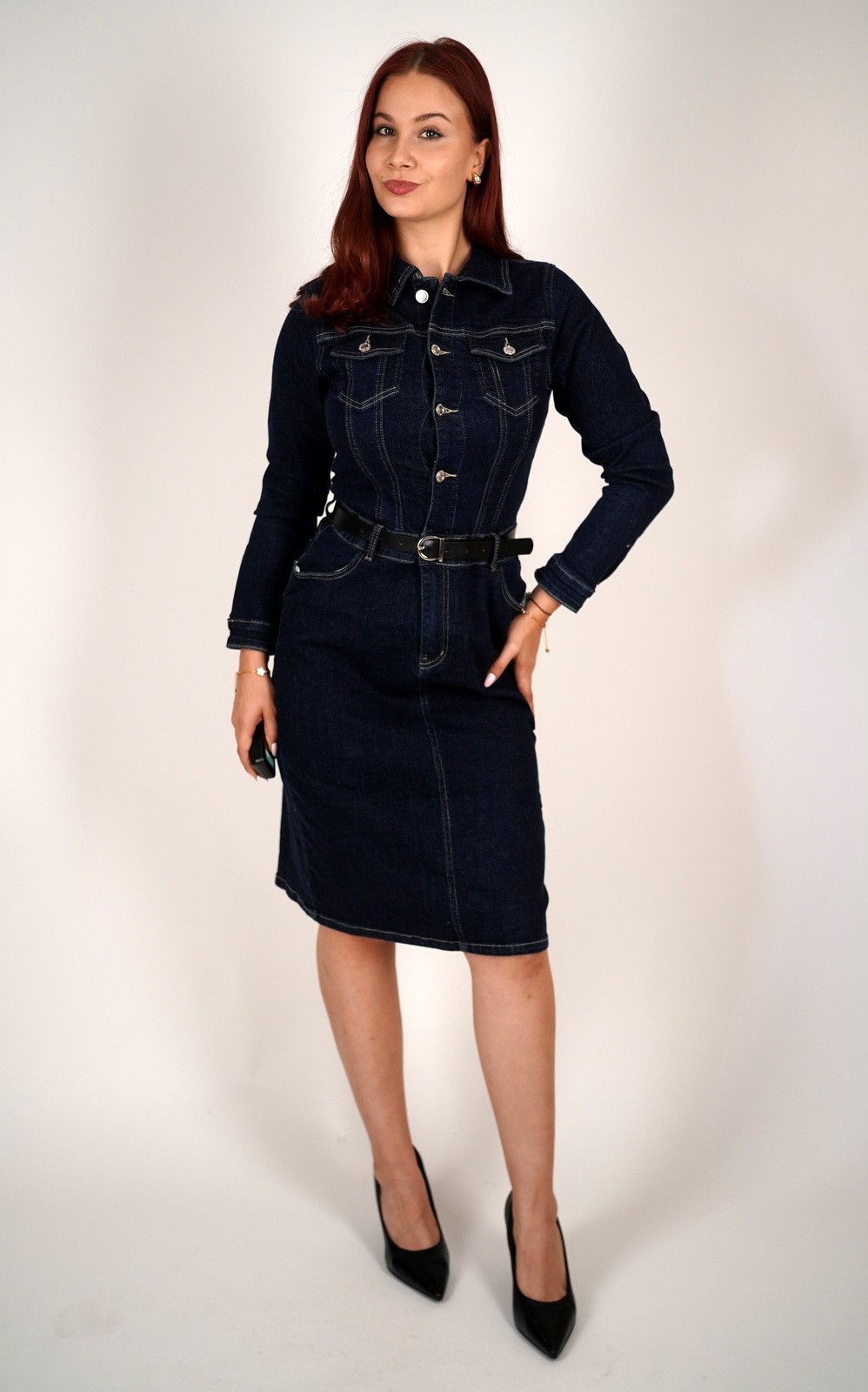 Ženska tamna traper haljina s džepovima – remen gratis – C118