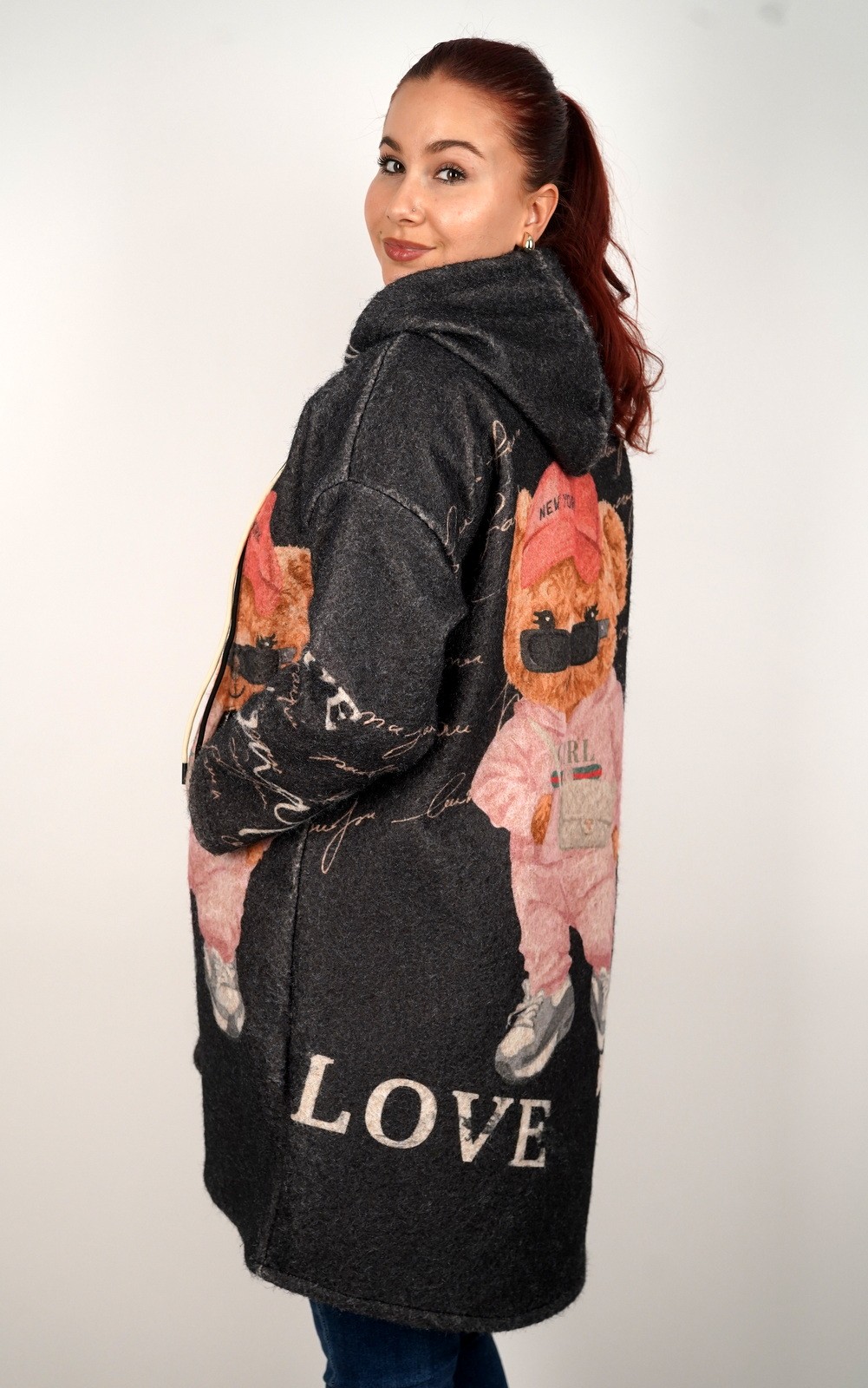 Ženska topla jakna s kapuljačom i medvjedić printom – zip model s vezicama – 3380 – uzorak I