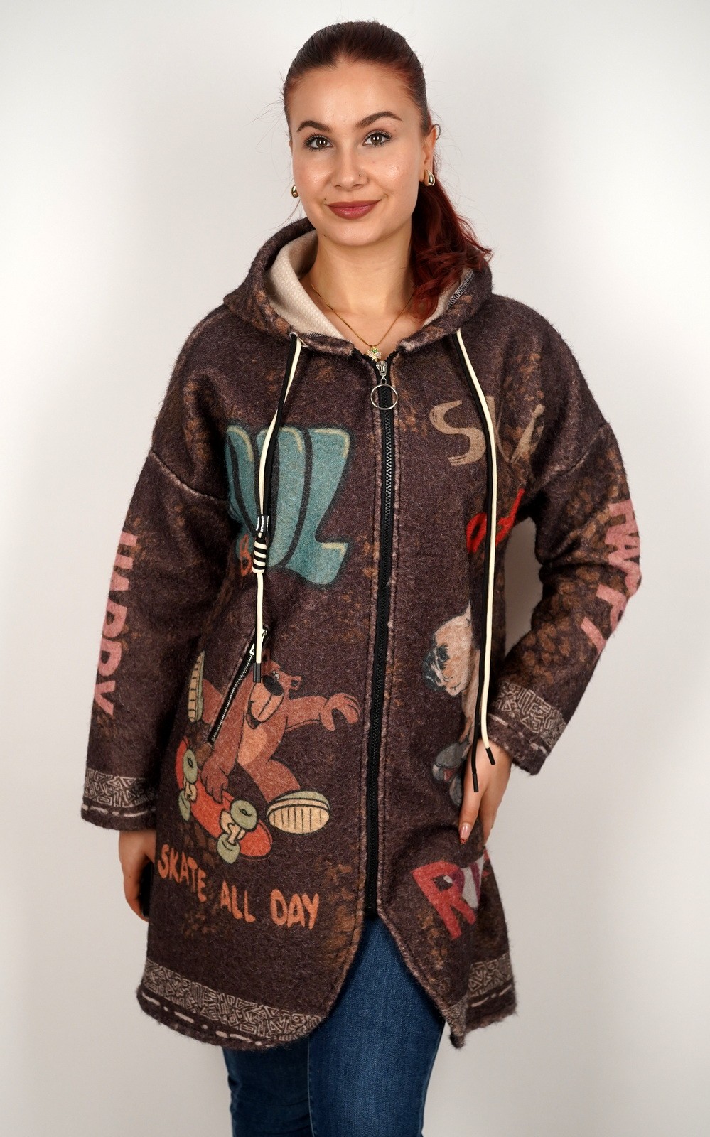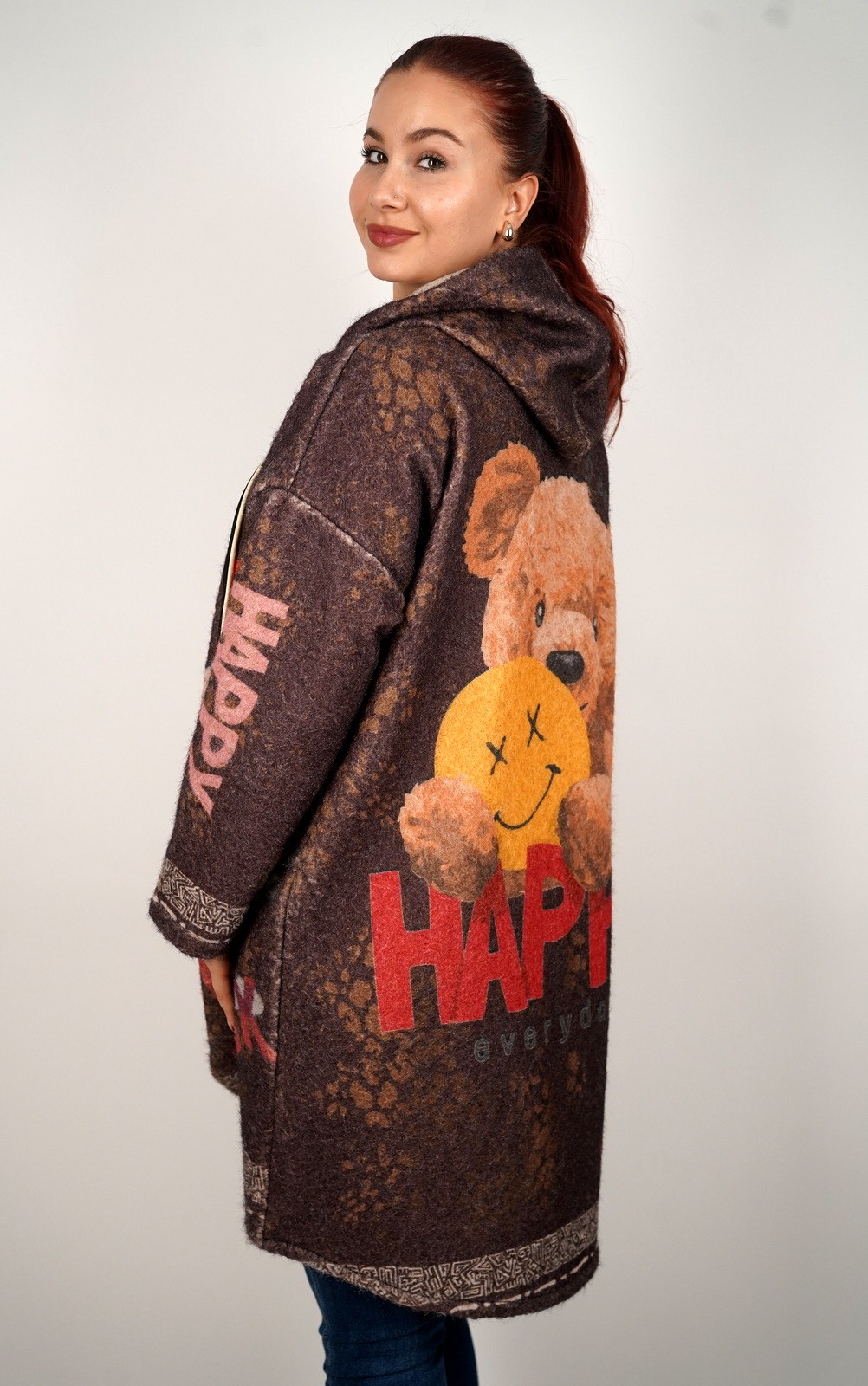 Ženska topla jakna s kapuljačom i medvjedić printom – zip model s vezicama – 3380 – uzorak II