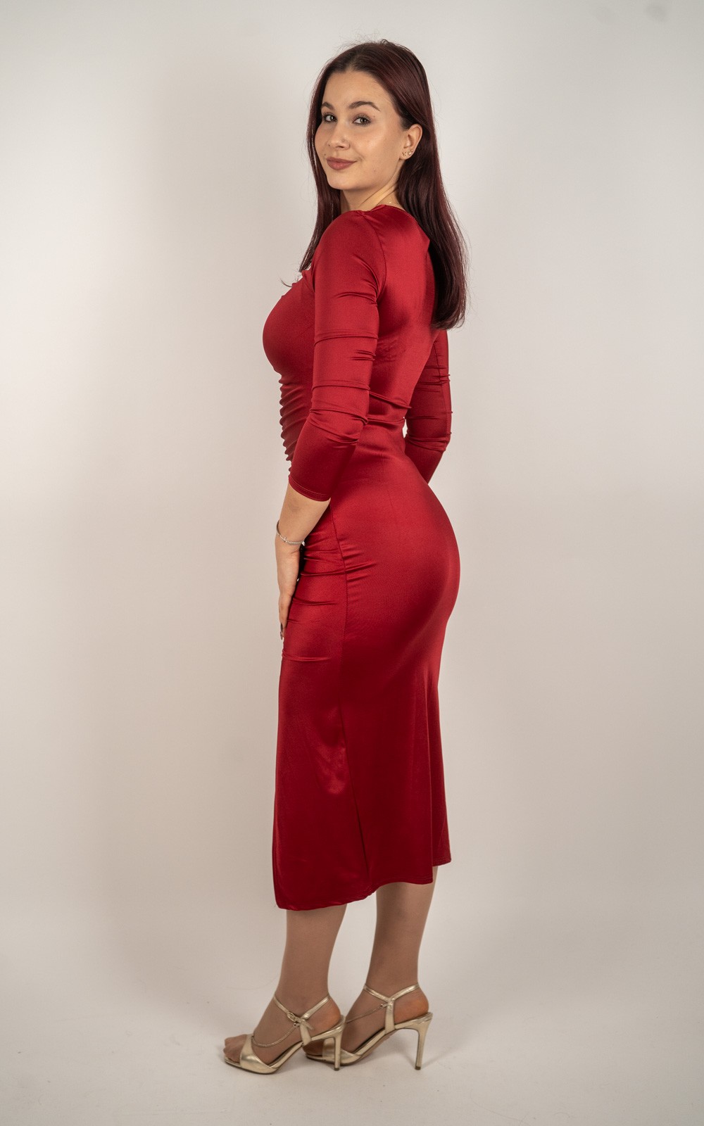 Elegantna midi haljina s izraženim nabiranim efektom, uskim krojem koji prati liniju tijela i visokim prorezom sprijeda. Savršena za posebne prilike, večernje izlaske i svečanosti. Udobna, podatna i jako ženstvena.