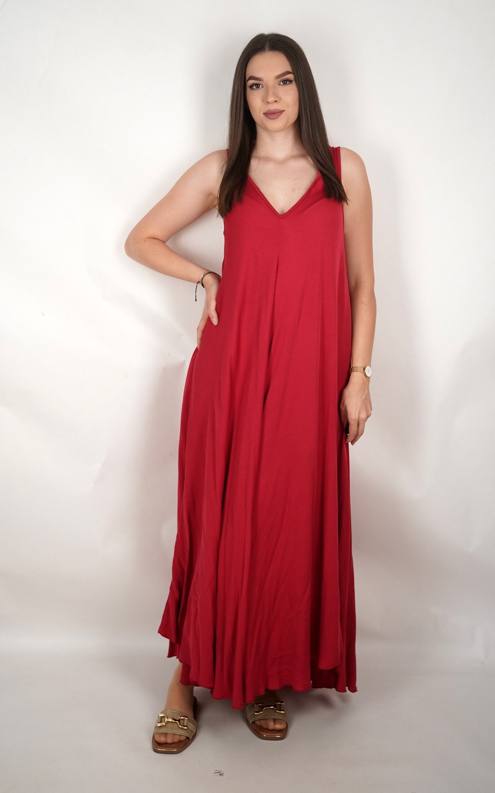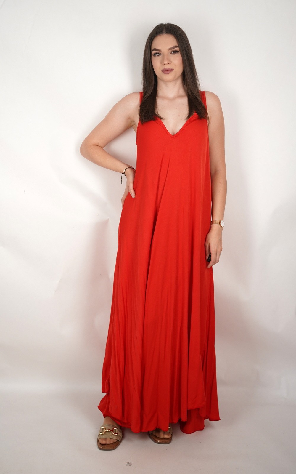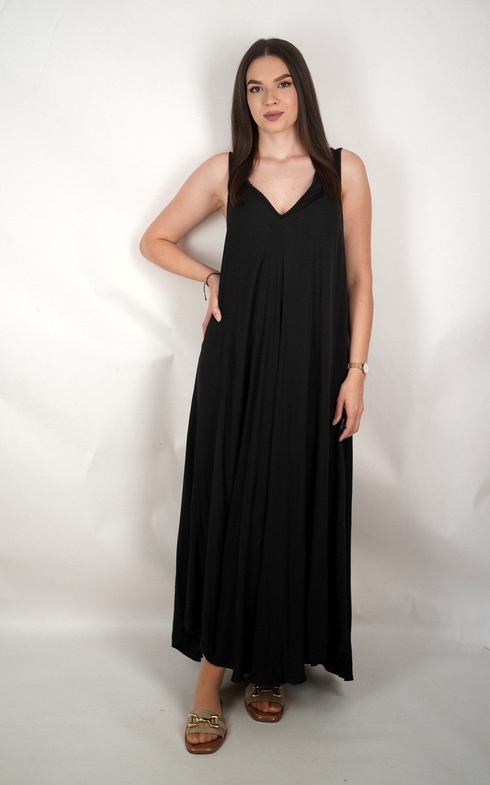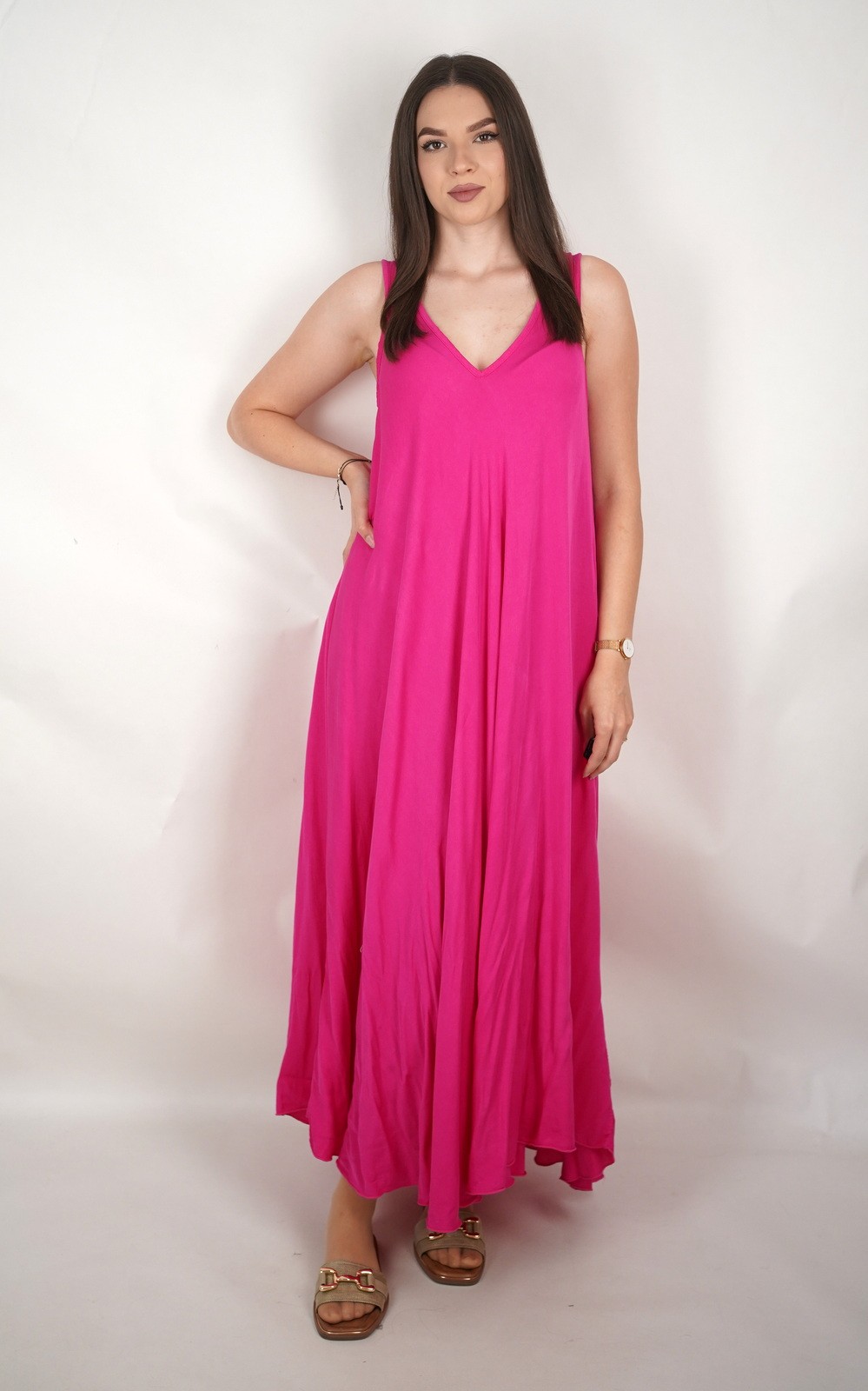 Ova lepršava maxi haljina s dubokim V izrezom i tankim naramenicama savršena je za ljetne dane, kada tražimo spoj jednostavnosti i stila. Prozračni materijal i široki, slobodni kroj pružaju maksimalnu udobnost, dok elegantan pad tkanine lijepo prati liniju tijela. Haljina se lako kombinira uz ravne sandale, platforme ili espadrile, a pogodna je za svakodnevno nošenje, večernje šetnje uz more ili opuštene ljetne izlaske. Jednostavna, ženstvena i efektna – model koji ćete obožavati!