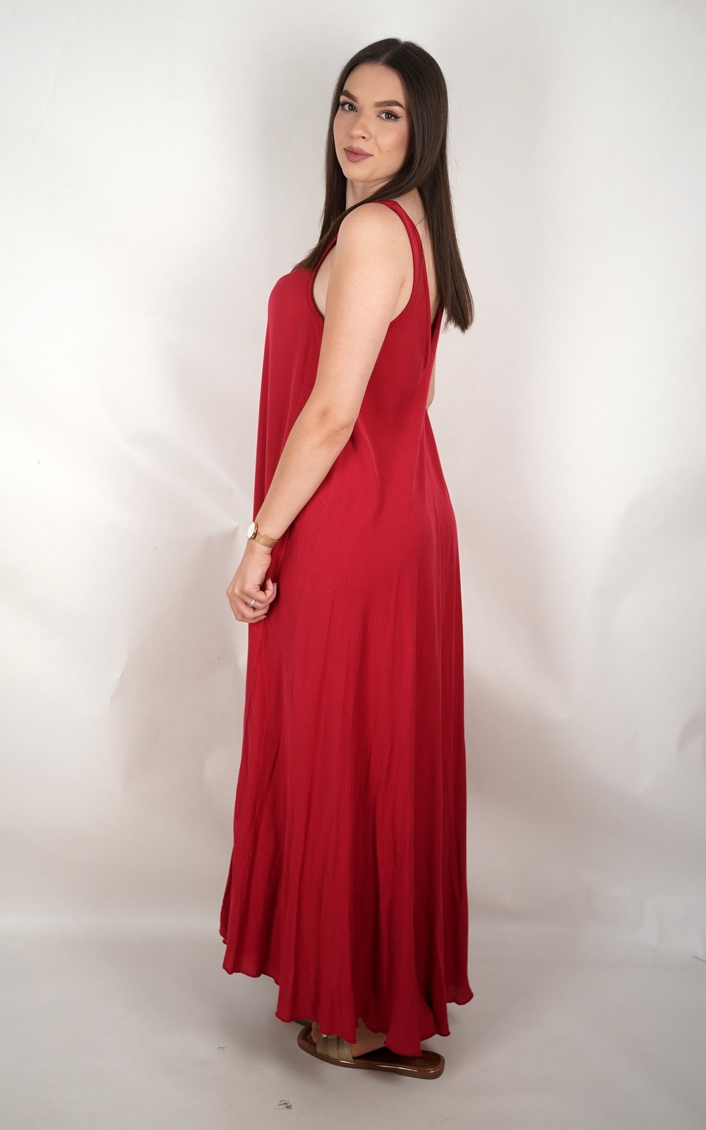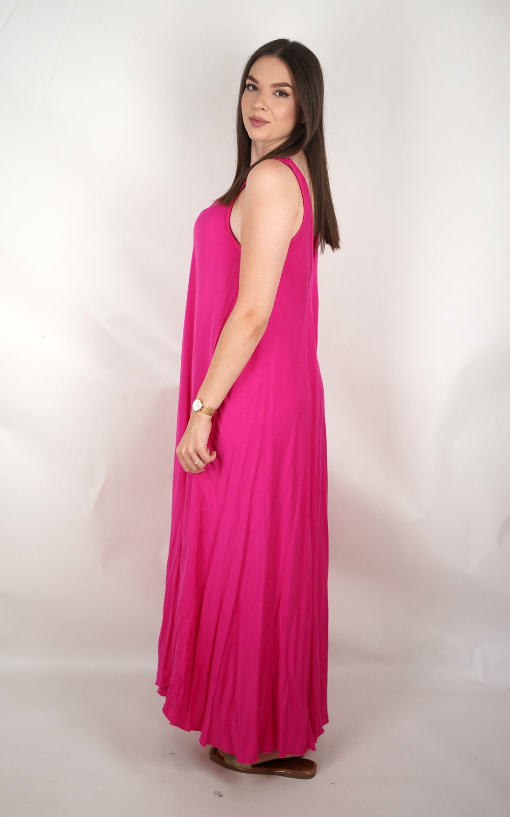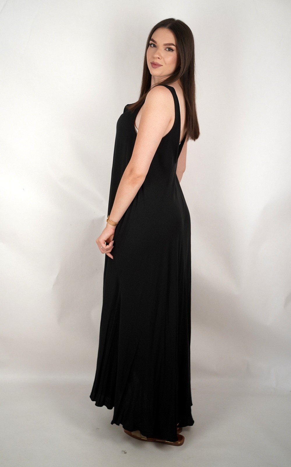 Ova lepršava maxi haljina s dubokim V izrezom i tankim naramenicama savršena je za ljetne dane, kada tražimo spoj jednostavnosti i stila. Prozračni materijal i široki, slobodni kroj pružaju maksimalnu udobnost, dok elegantan pad tkanine lijepo prati liniju tijela. Haljina se lako kombinira uz ravne sandale, platforme ili espadrile, a pogodna je za svakodnevno nošenje, večernje šetnje uz more ili opuštene ljetne izlaske. Jednostavna, ženstvena i efektna – model koji ćete obožavati!