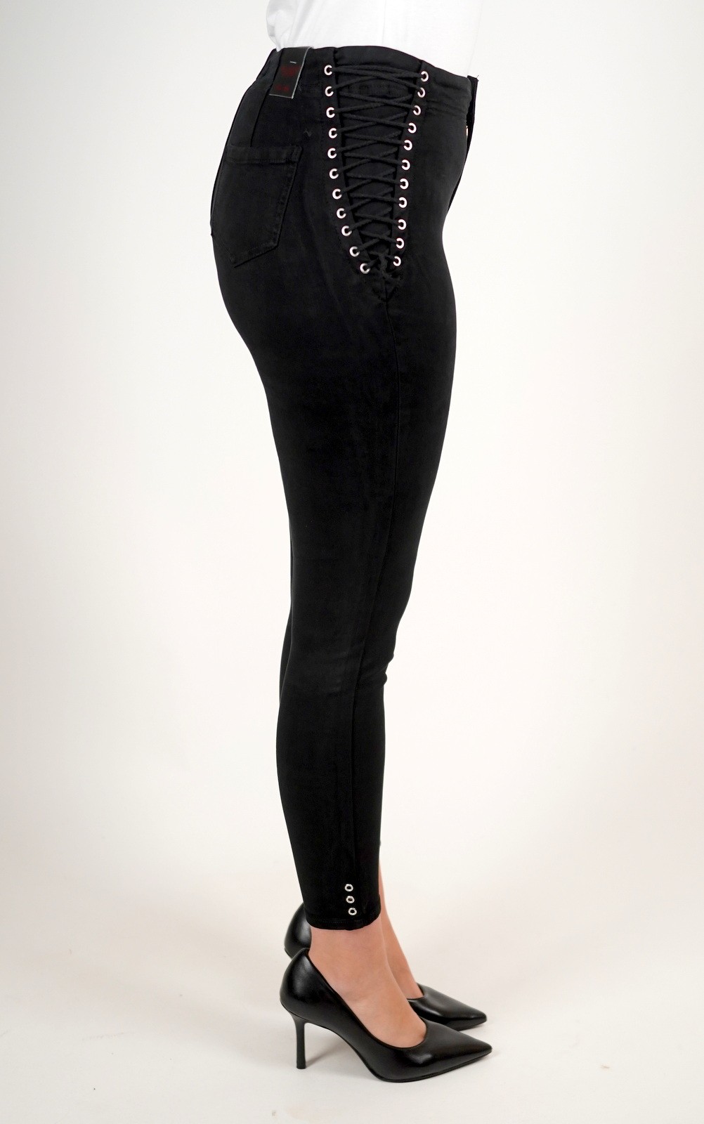 Provjerite dostupnost veličina na našoj web stranici. Ove traperice dolaze u crnoj boji s vezicama na bokovima za dodatnu udobnost i stil.