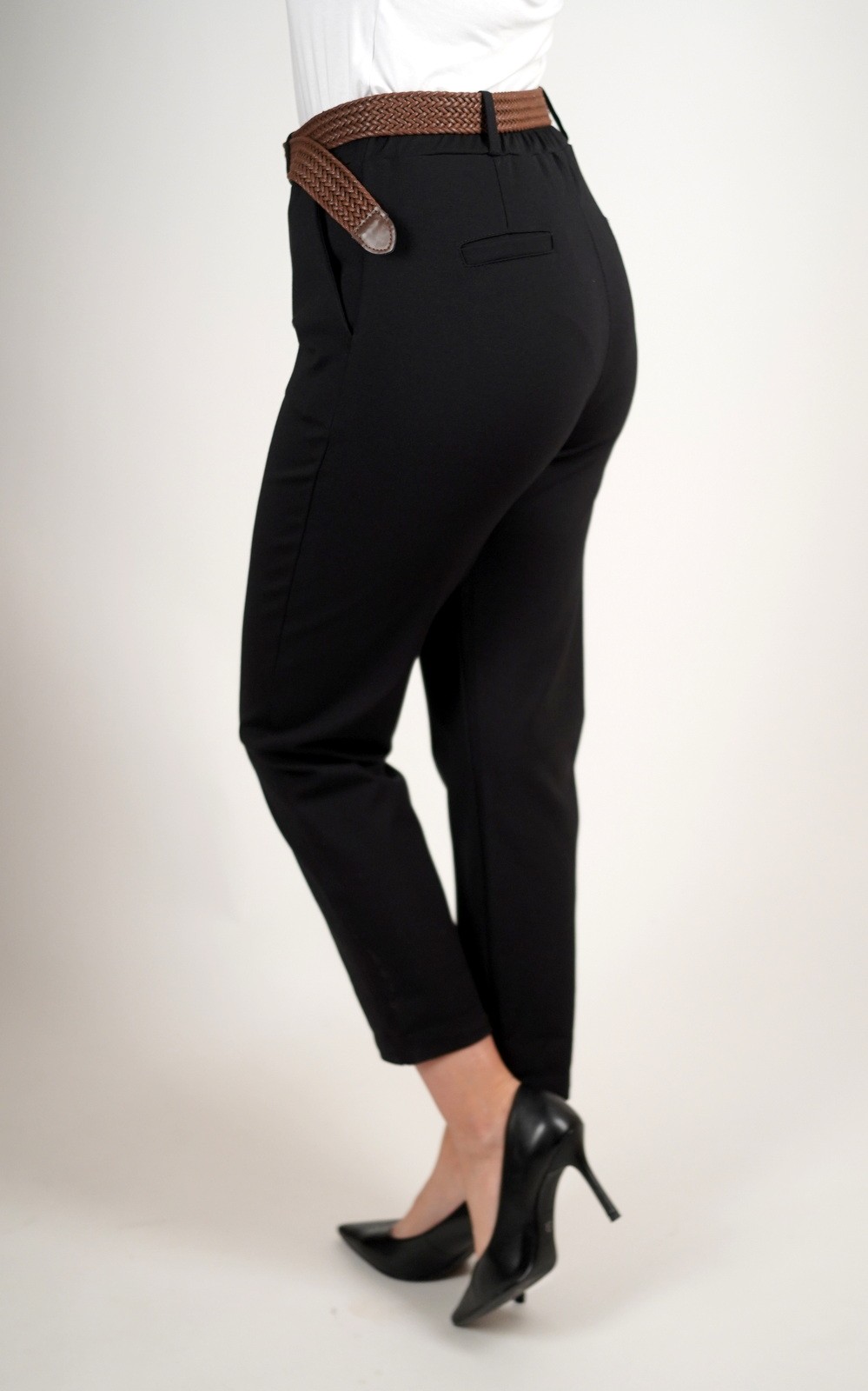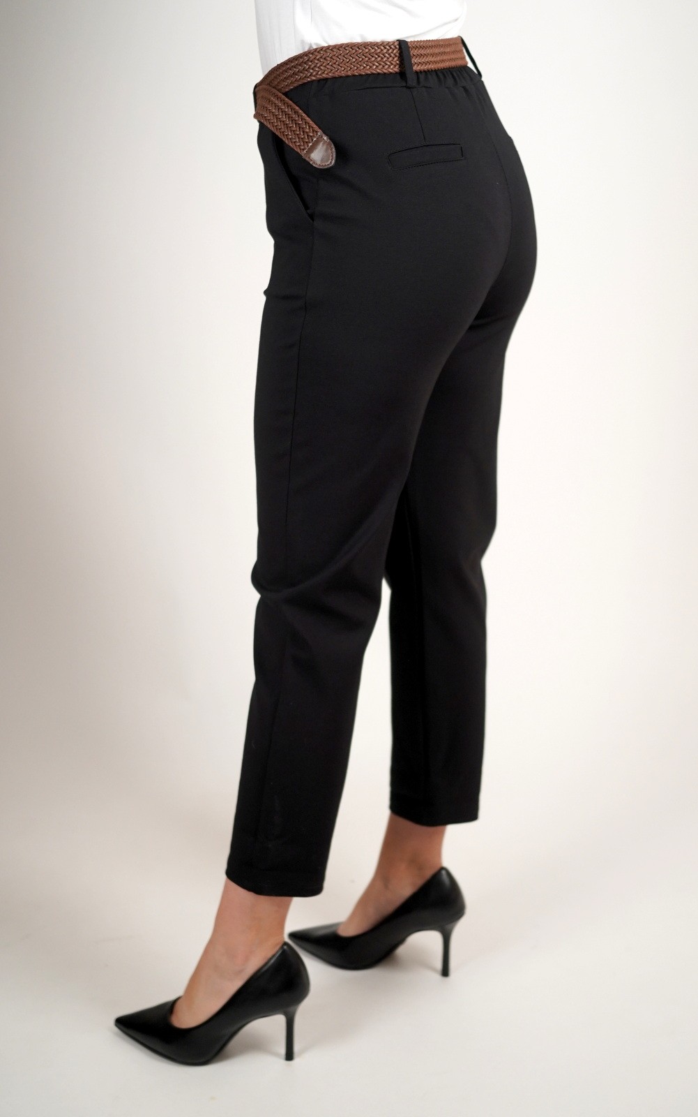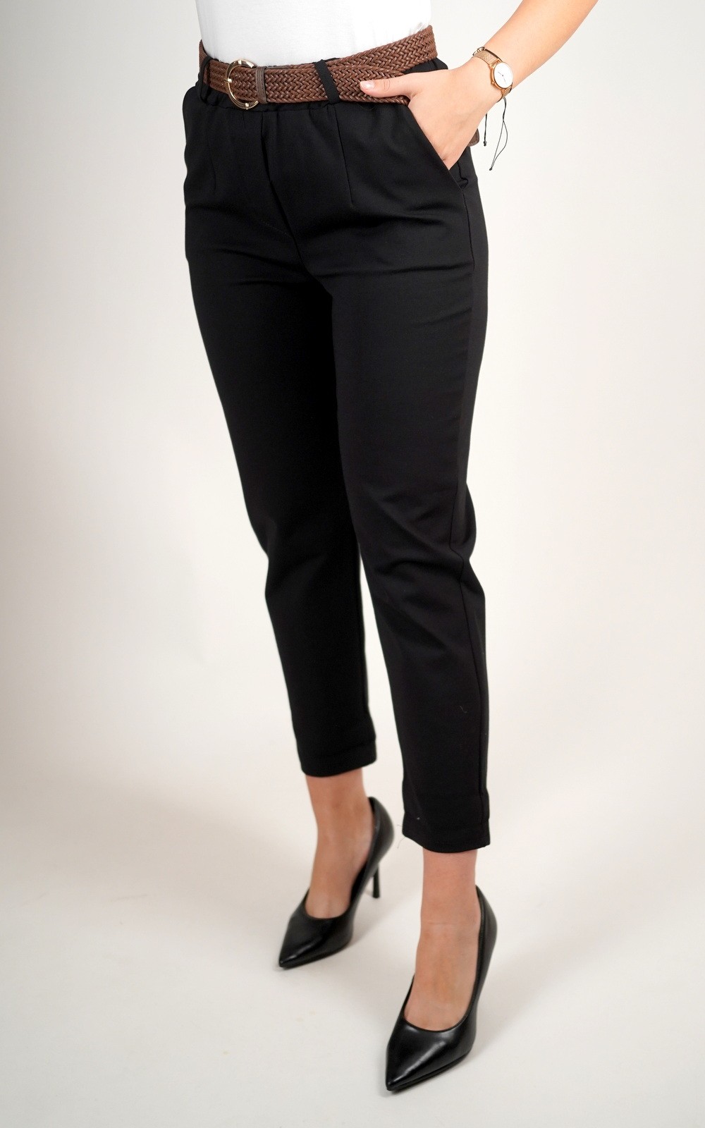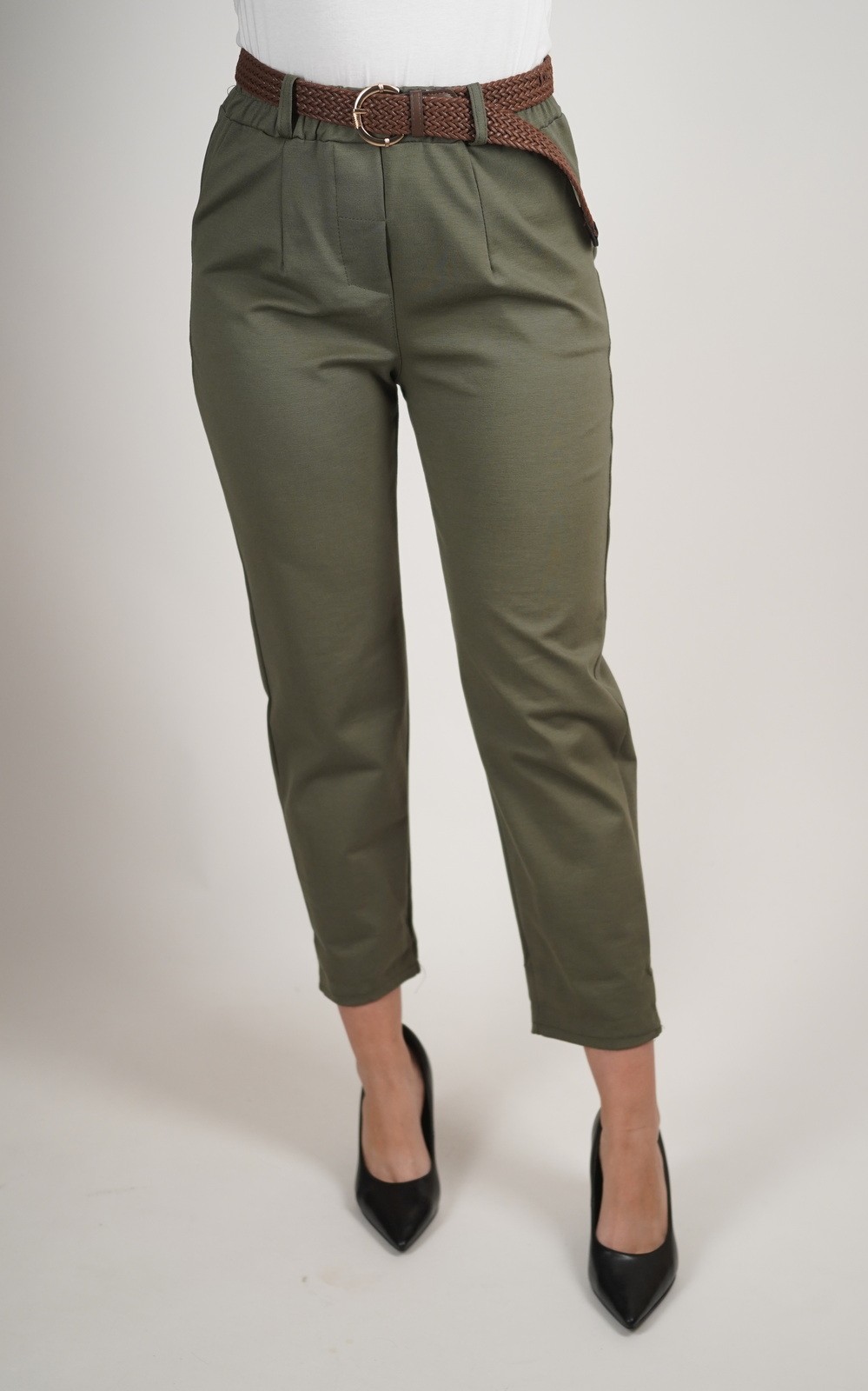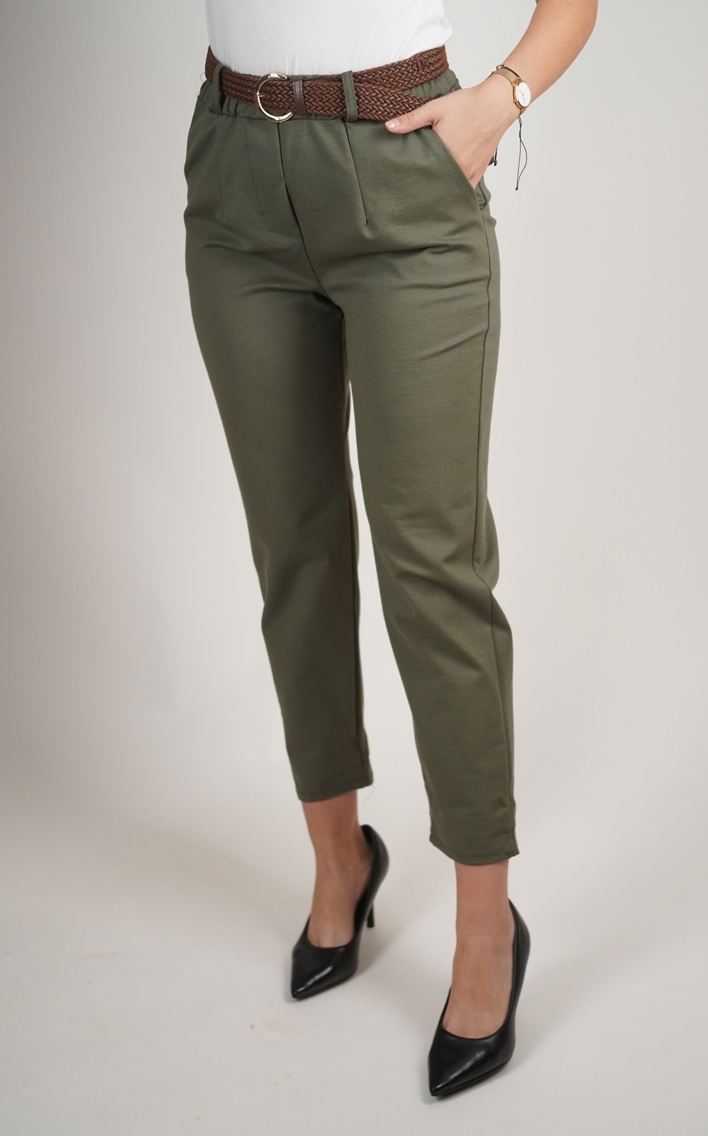 Ženske elastične hlače 7/8 dužine s pojasom i džepovima – smeđi pleteni remen – 2037