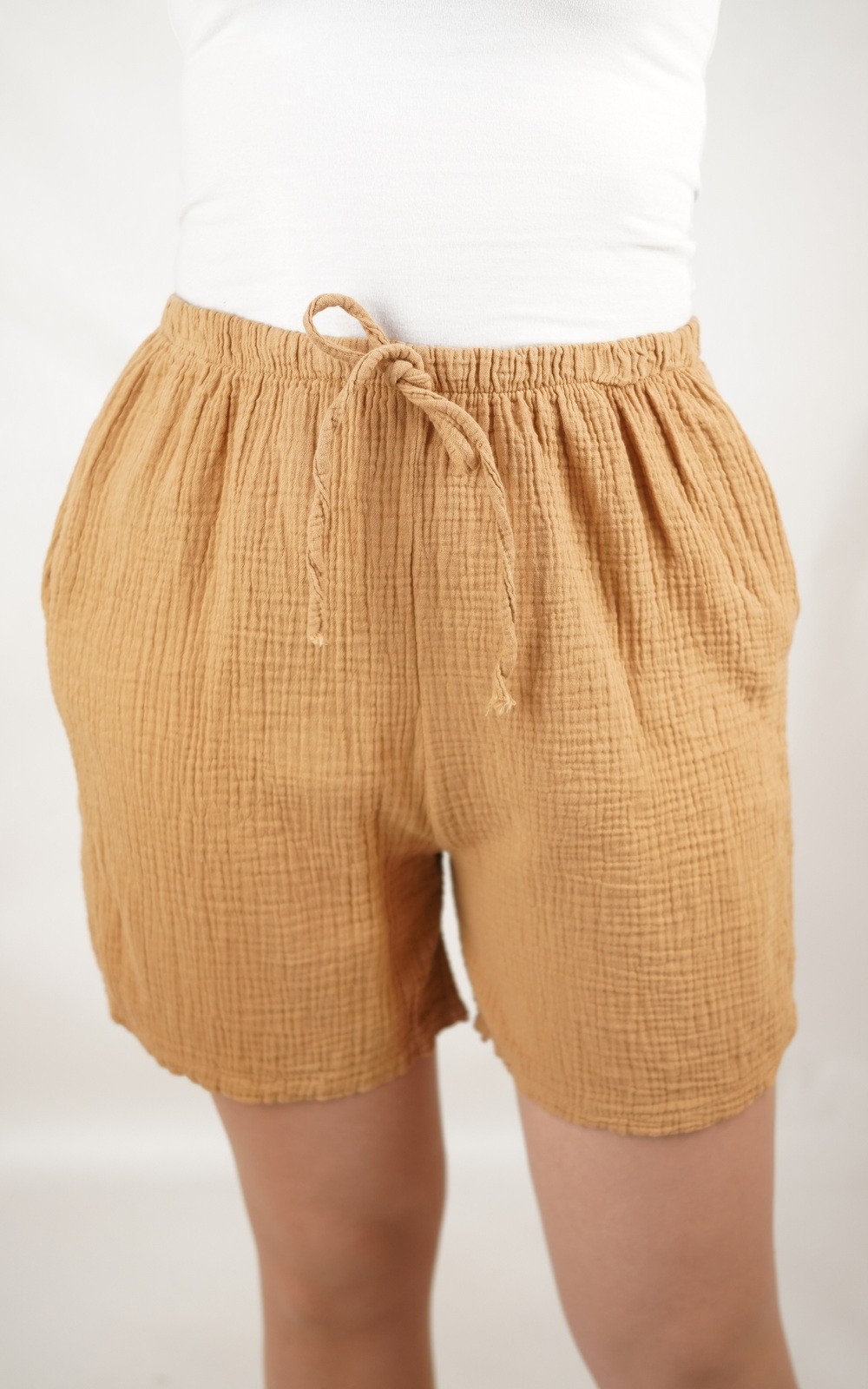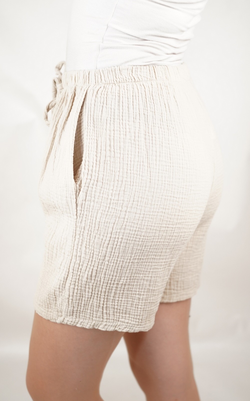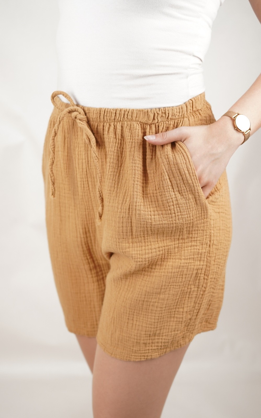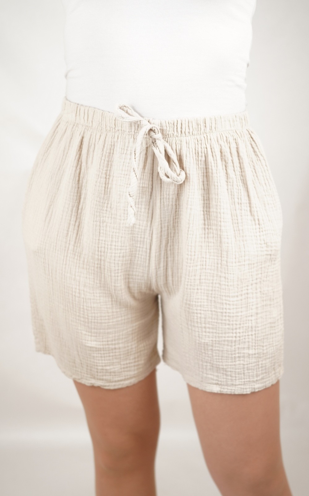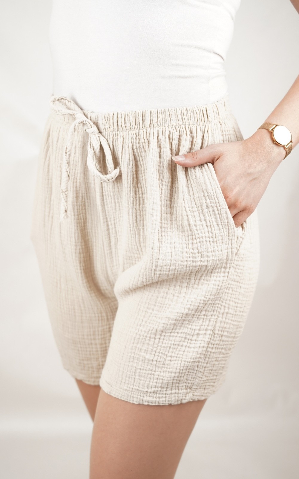 Ove kratke hlačice od mekanog muslina pravi su izbor za opušten i udoban ljetni styling. Lagani pamučni materijal omogućuje koži da diše, dok elastični pojas i dodatna vezica omogućuju idealno pristajanje bez osjećaja stezanja. Jednostavan kroj s praktičnim džepovima čini ih savršenim za svakodnevne kombinacije – bilo da ih nosiš uz lepršavi top ili preko kupaćeg na plaži. Minimalistički i prirodan stil u kojem ćeš se osjećati slobodno i nesputano.