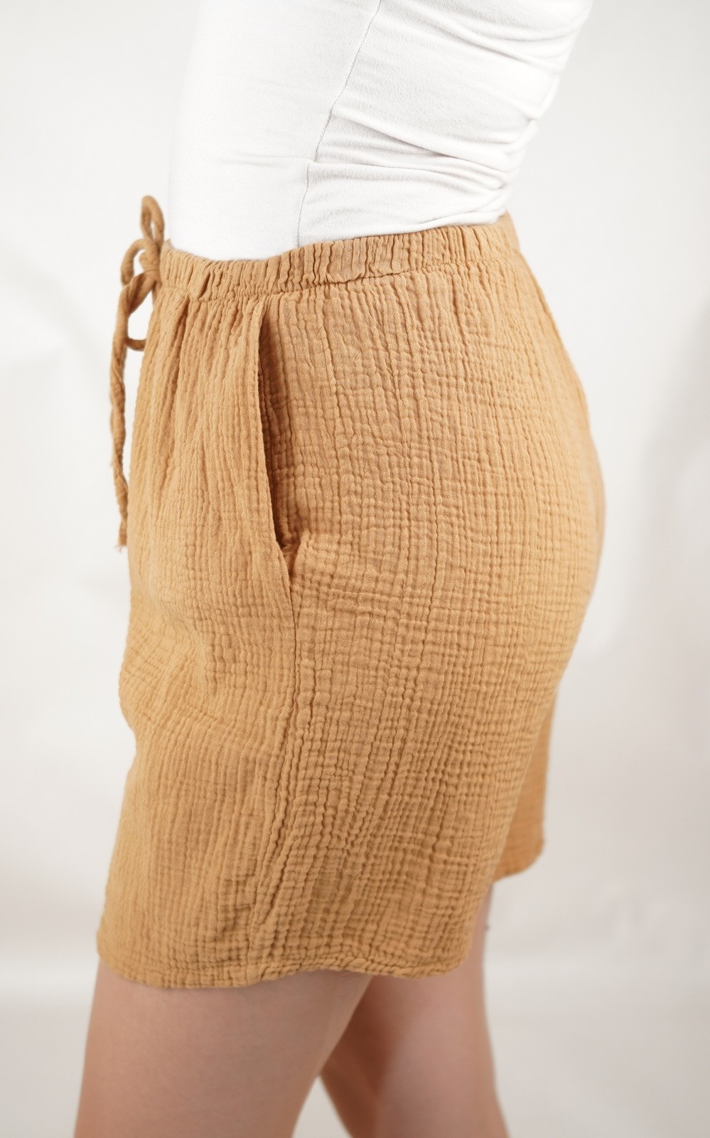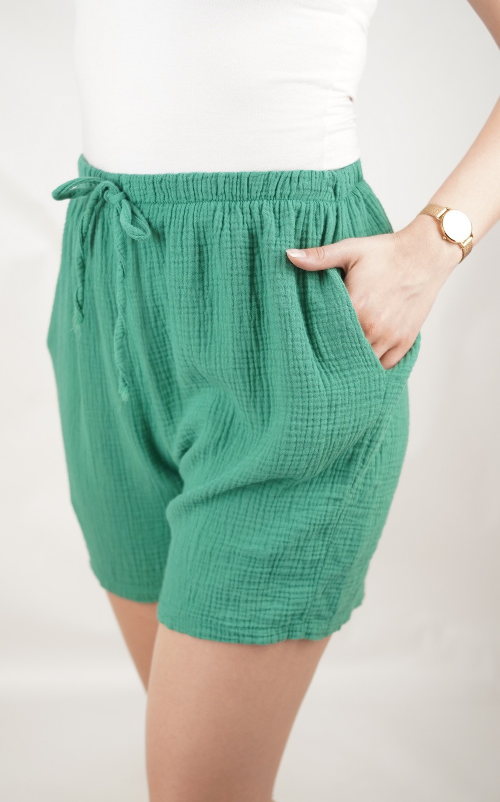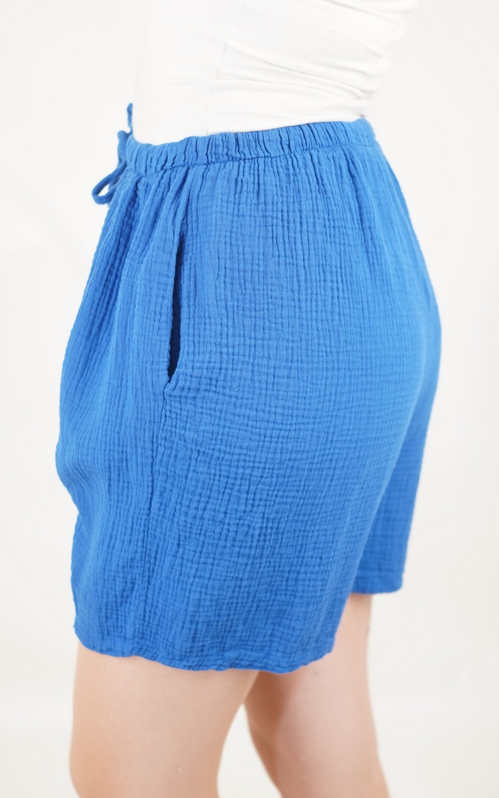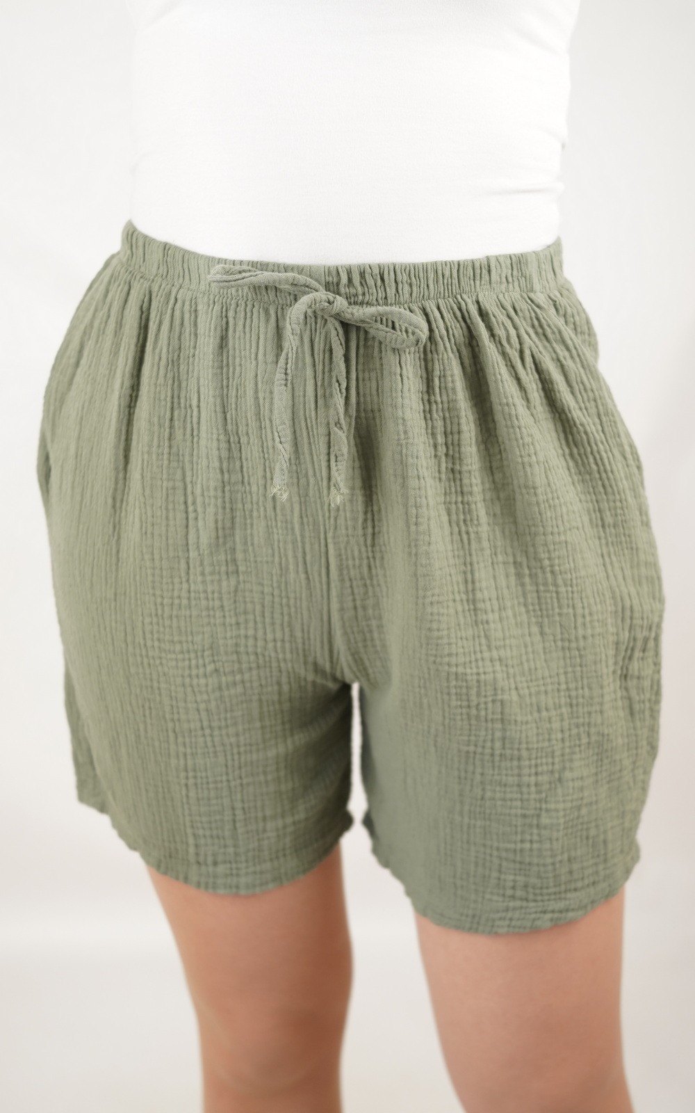 Ove kratke hlačice od mekanog muslina pravi su izbor za opušten i udoban ljetni styling. Lagani pamučni materijal omogućuje koži da diše, dok elastični pojas i dodatna vezica omogućuju idealno pristajanje bez osjećaja stezanja. Jednostavan kroj s praktičnim džepovima čini ih savršenim za svakodnevne kombinacije – bilo da ih nosiš uz lepršavi top ili preko kupaćeg na plaži. Minimalistički i prirodan stil u kojem ćeš se osjećati slobodno i nesputano.
