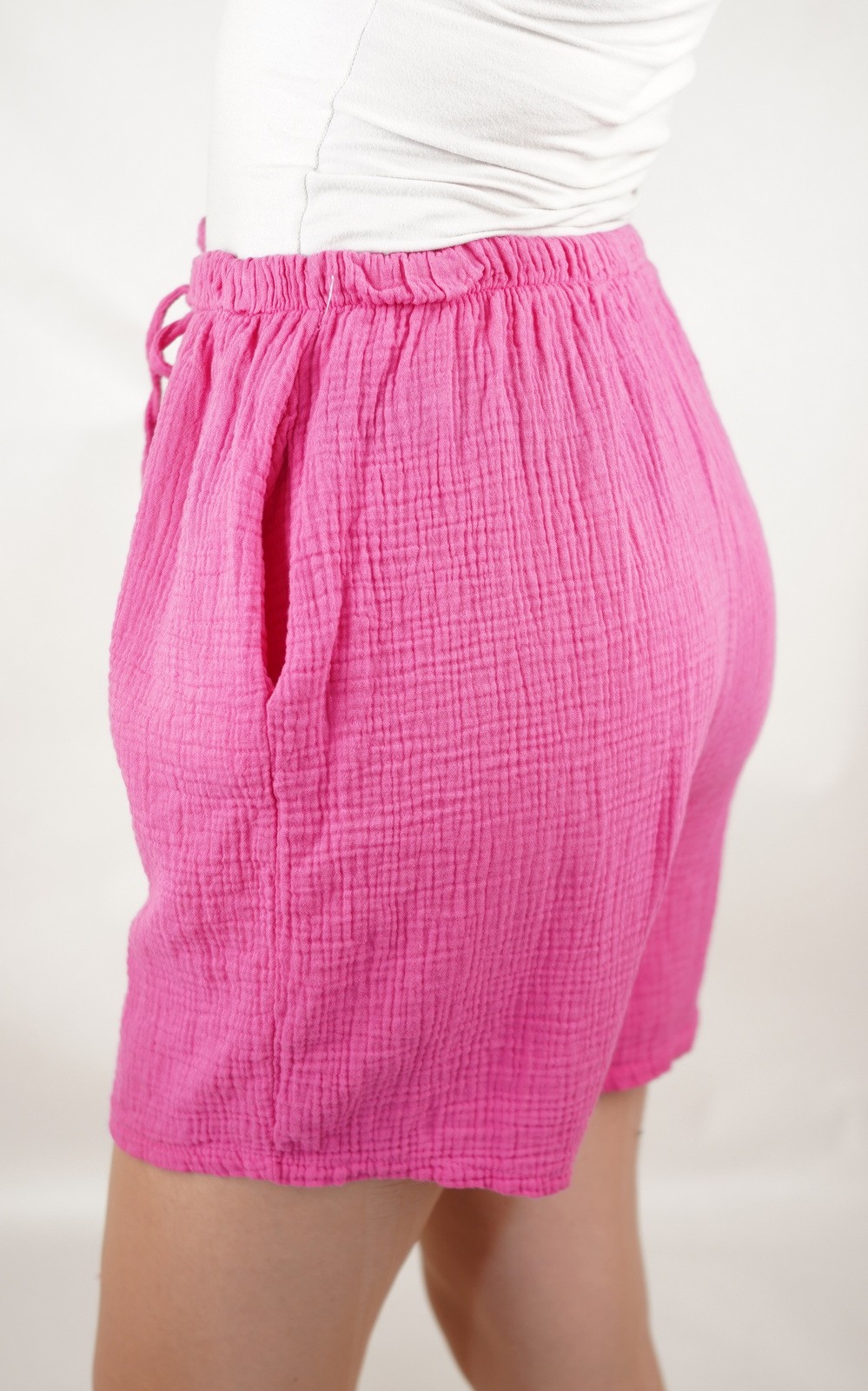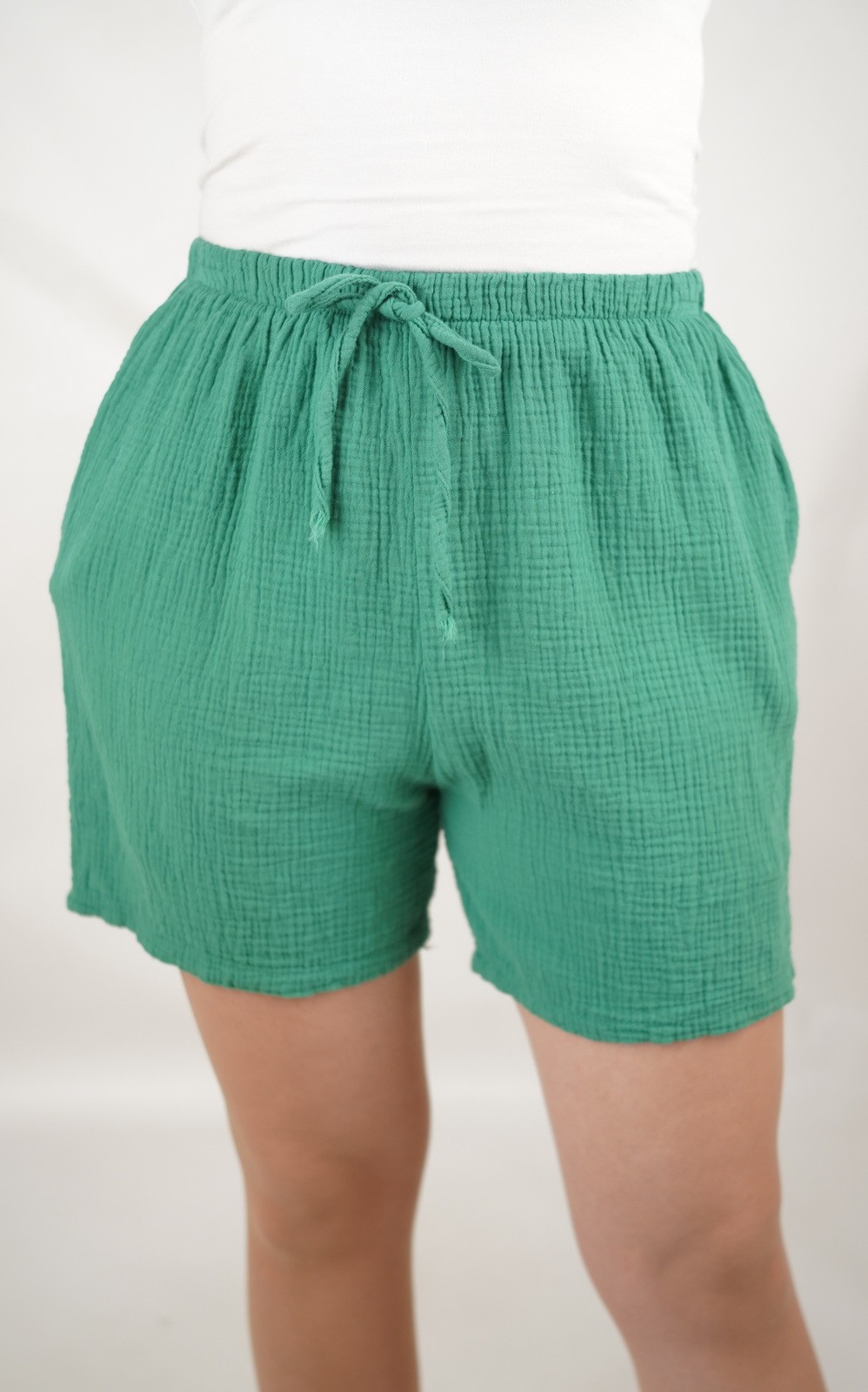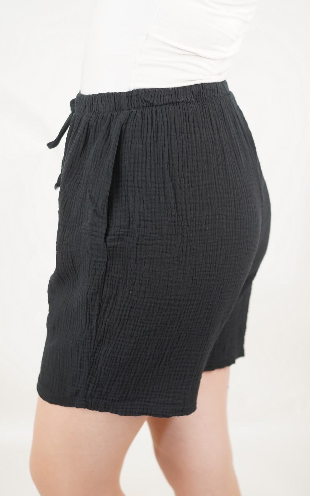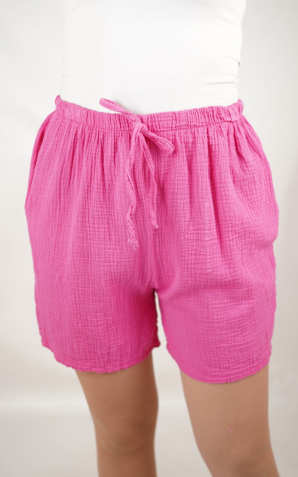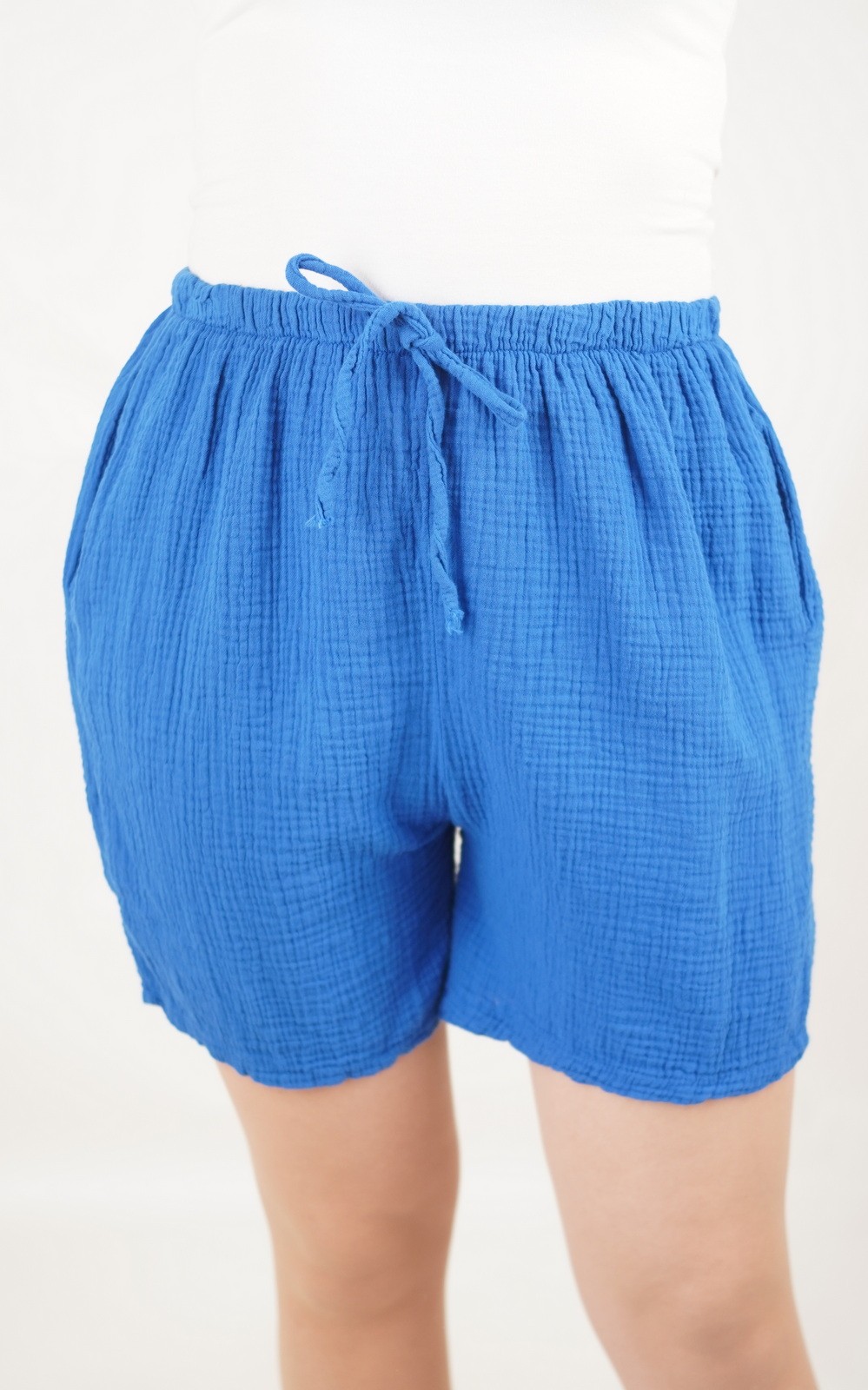 Ove kratke hlačice od mekanog muslina pravi su izbor za opušten i udoban ljetni styling. Lagani pamučni materijal omogućuje koži da diše, dok elastični pojas i dodatna vezica omogućuju idealno pristajanje bez osjećaja stezanja. Jednostavan kroj s praktičnim džepovima čini ih savršenim za svakodnevne kombinacije – bilo da ih nosiš uz lepršavi top ili preko kupaćeg na plaži. Minimalistički i prirodan stil u kojem ćeš se osjećati slobodno i nesputano.