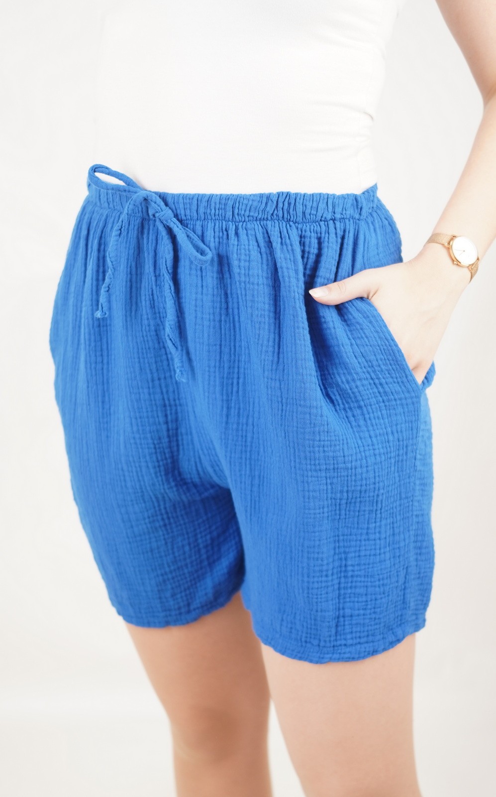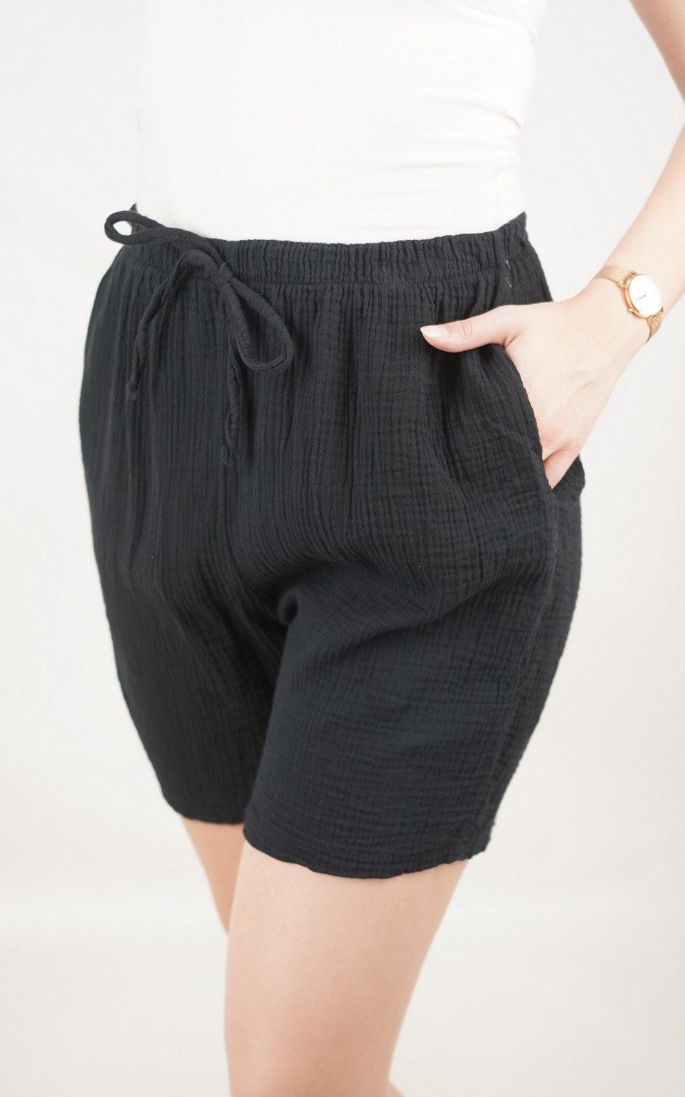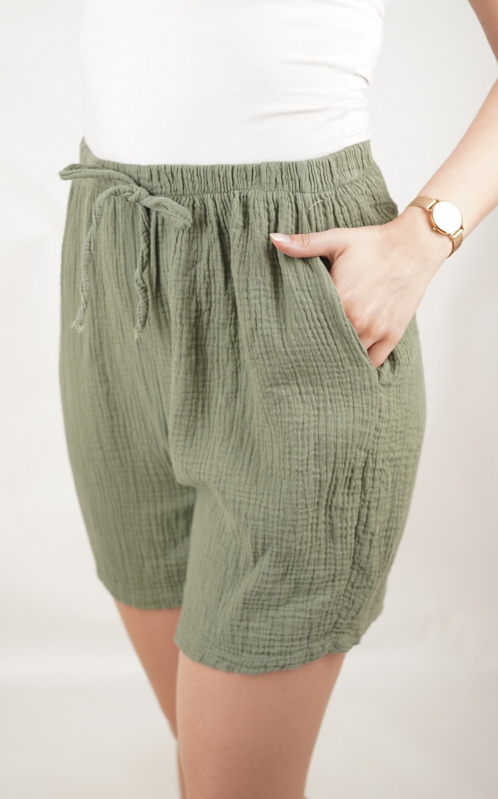 Ženske kratke pamučne hlačice s vezicom i elastičnim pojasom – gaza – 24130