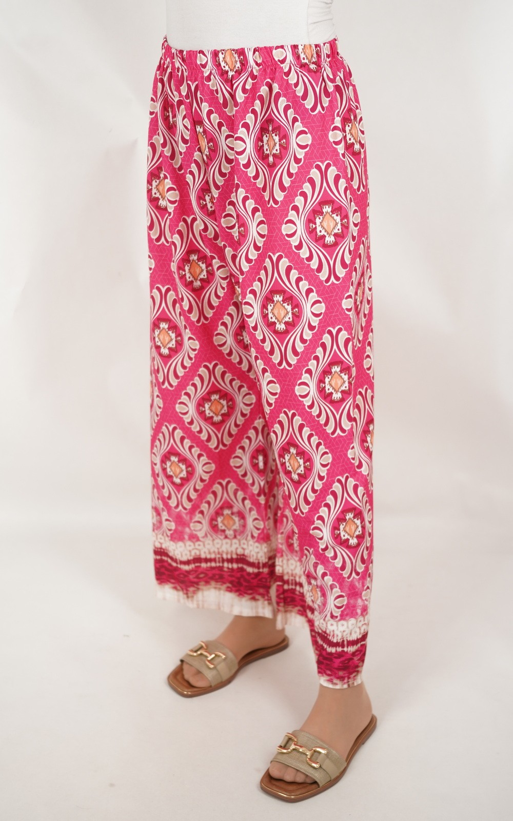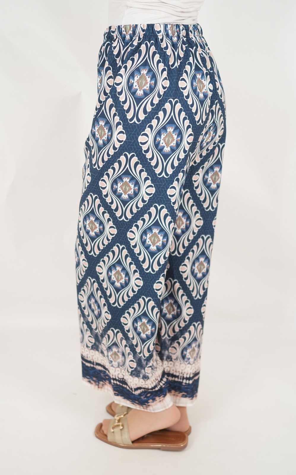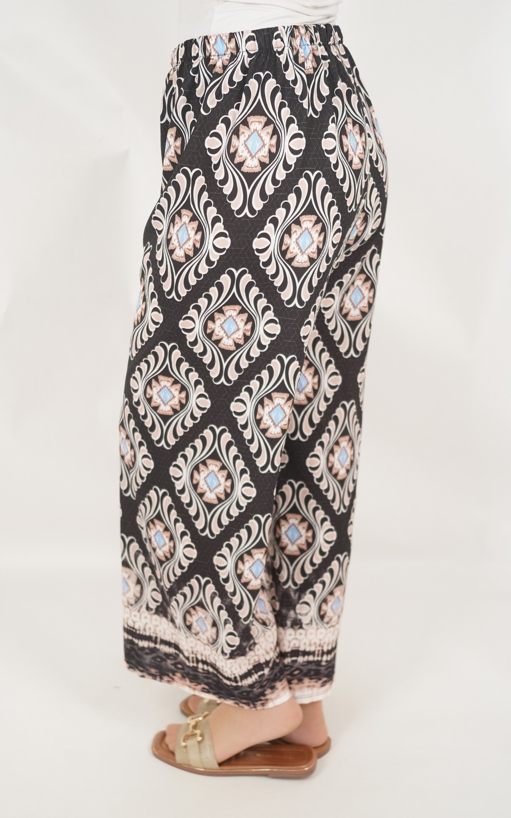 Ove lagane i široke hlače idealan su izbor za tople ljetne dane. Lepršavi kroj pruža maksimalnu udobnost, dok elastični pojas omogućuje savršeno pristajanje bez stezanja. Etno uzorak daje hlačama upečatljiv i razigran izgled koji se lako kombinira s jednostavnim majicama ili bluzama. Bez zatvarača, izrađene od laganog i prozračnog materijala, ove hlače su odlične za grad, plažu ili putovanja – udobne su, moderne i efektne.
