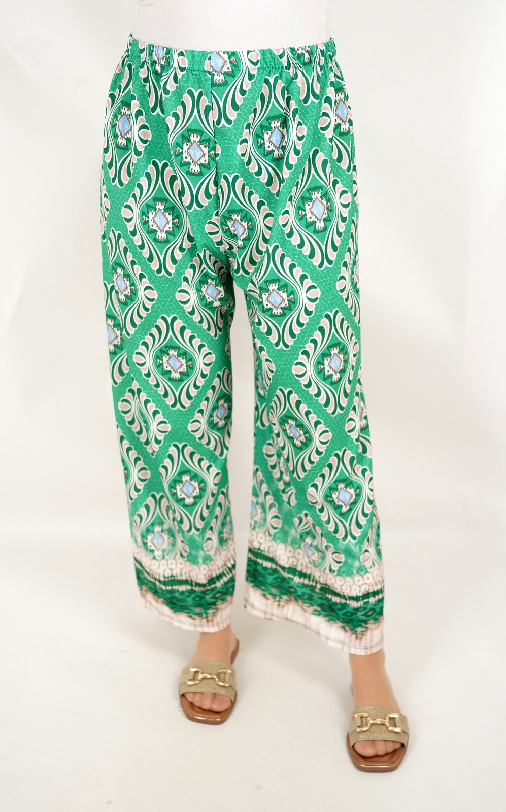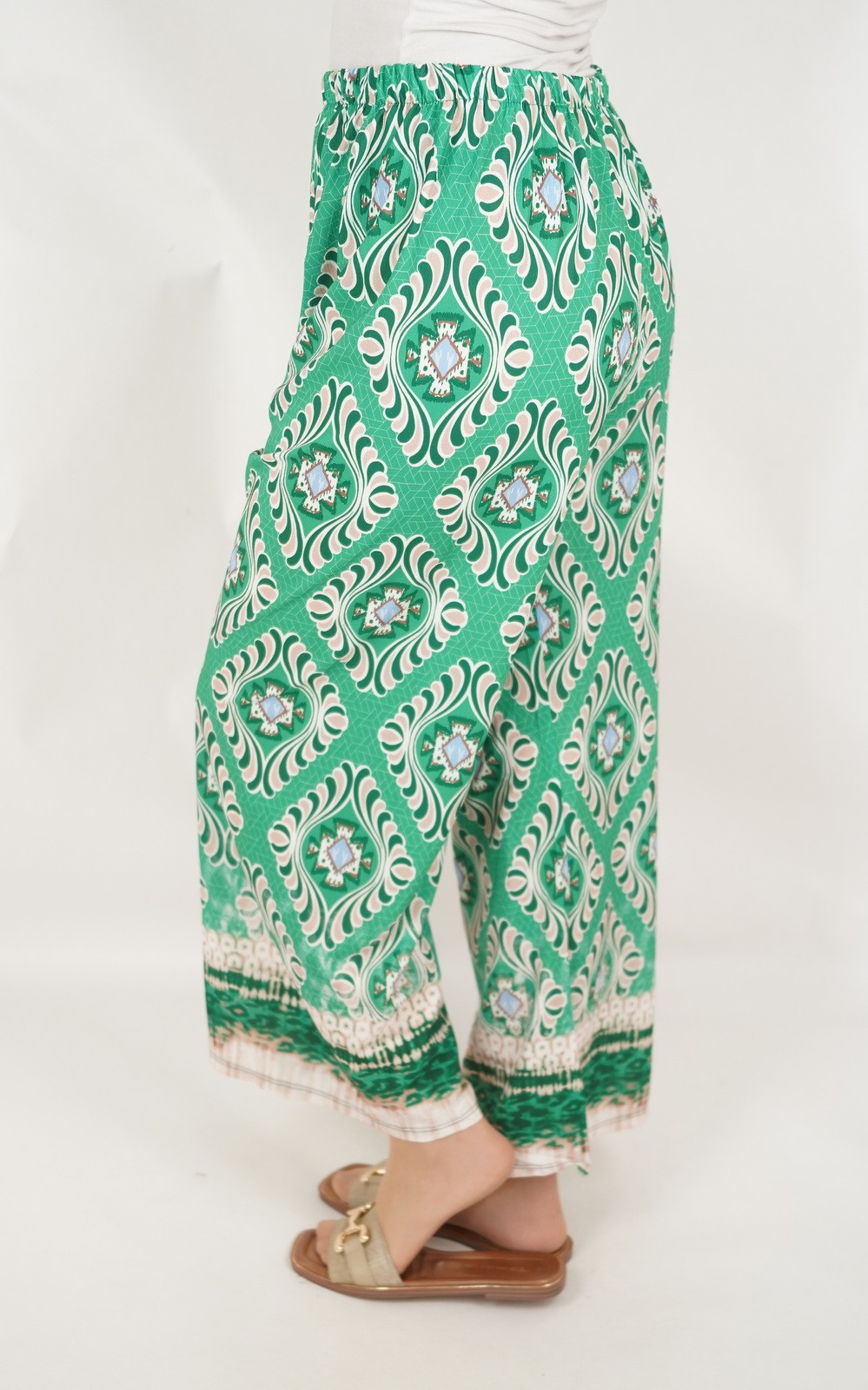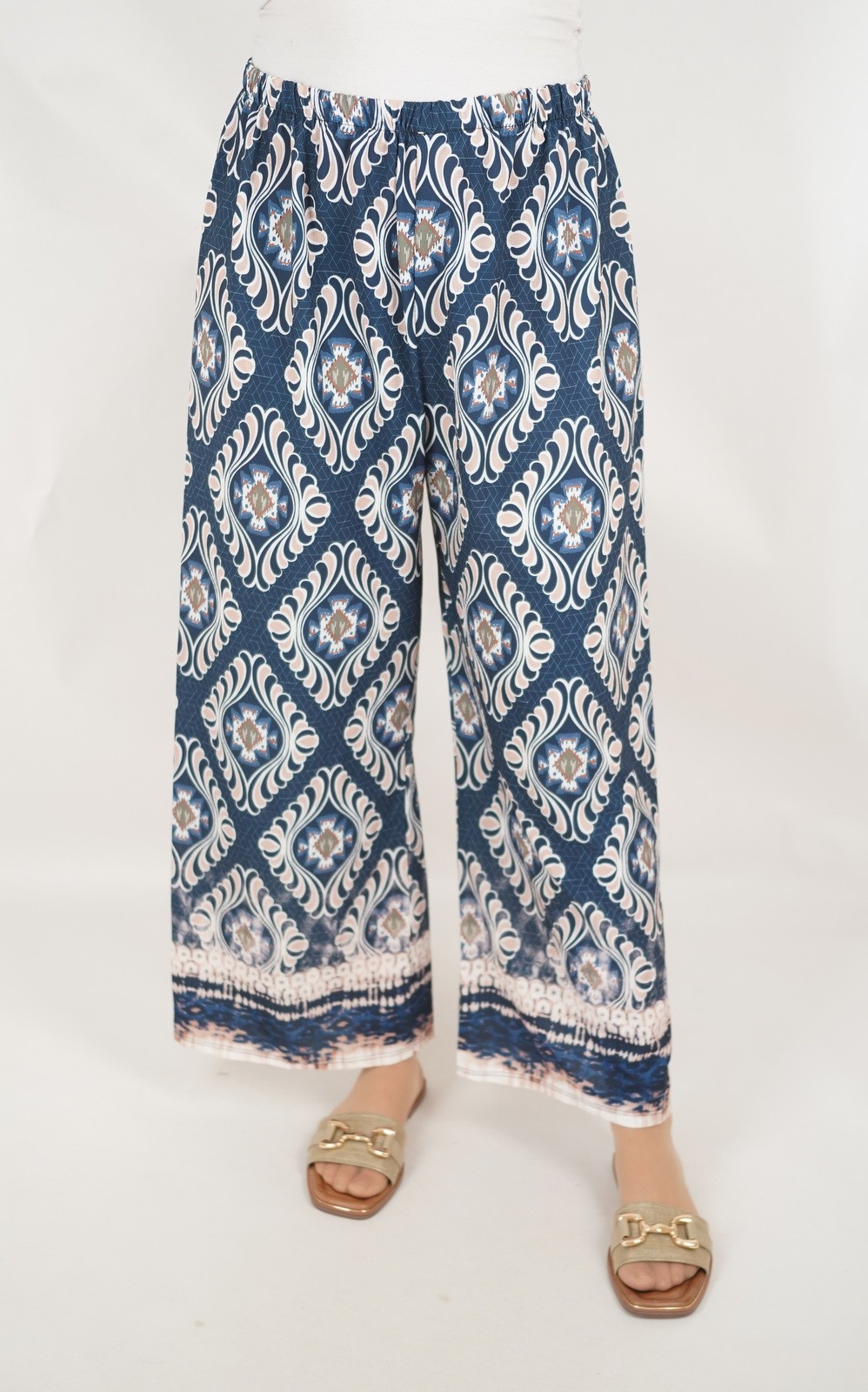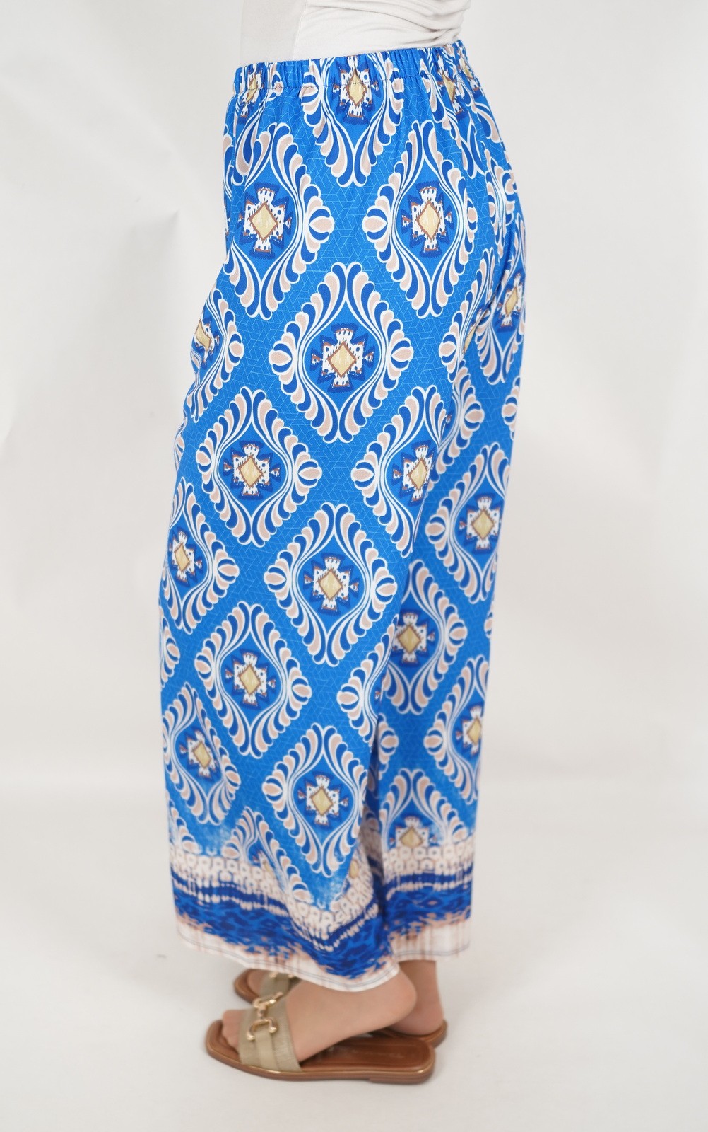Ove lagane i široke hlače idealan su izbor za tople ljetne dane. Lepršavi kroj pruža maksimalnu udobnost, dok elastični pojas omogućuje savršeno pristajanje bez stezanja. Etno uzorak daje hlačama upečatljiv i razigran izgled koji se lako kombinira s jednostavnim majicama ili bluzama. Bez zatvarača, izrađene od laganog i prozračnog materijala, ove hlače su odlične za grad, plažu ili putovanja – udobne su, moderne i efektne.