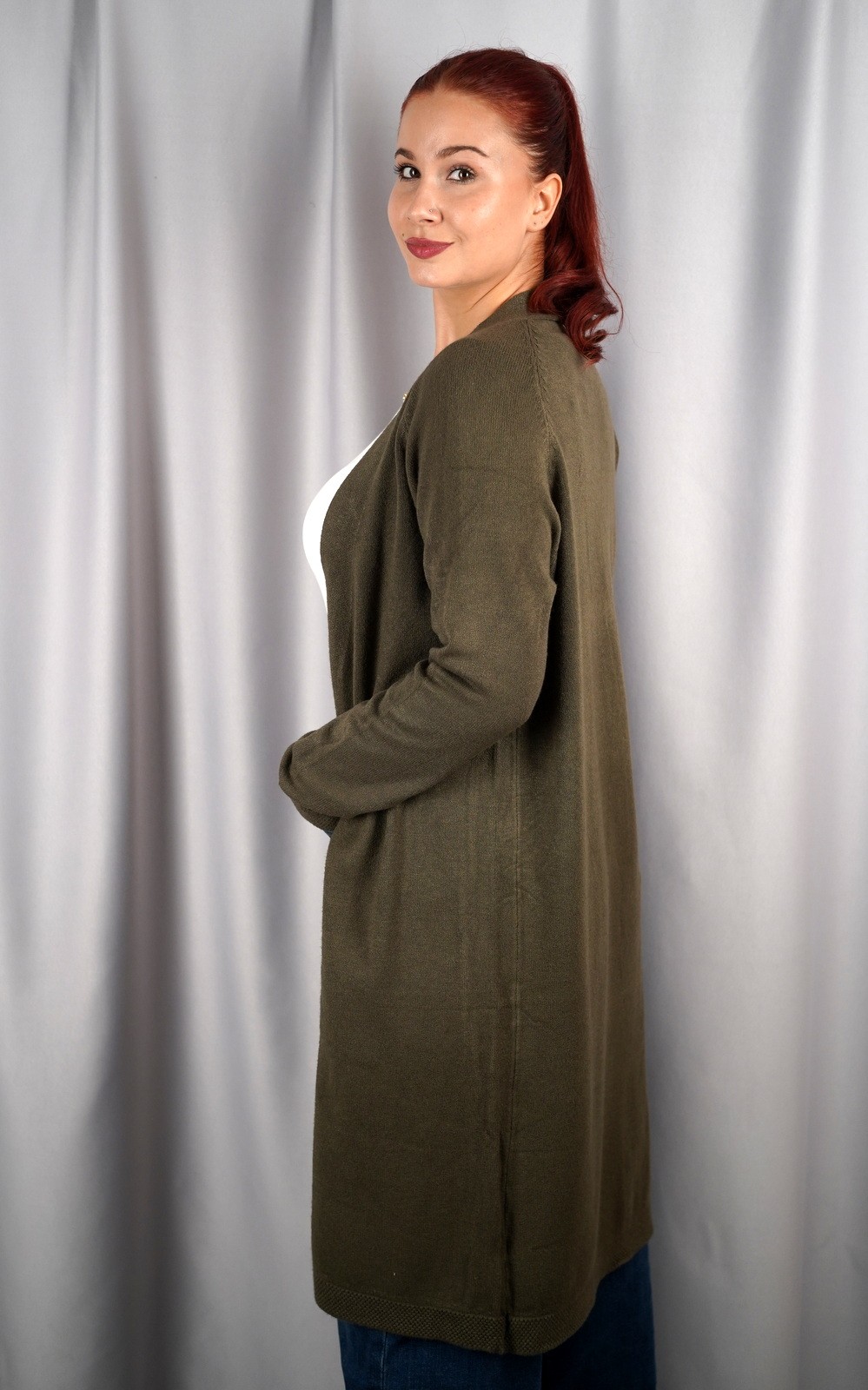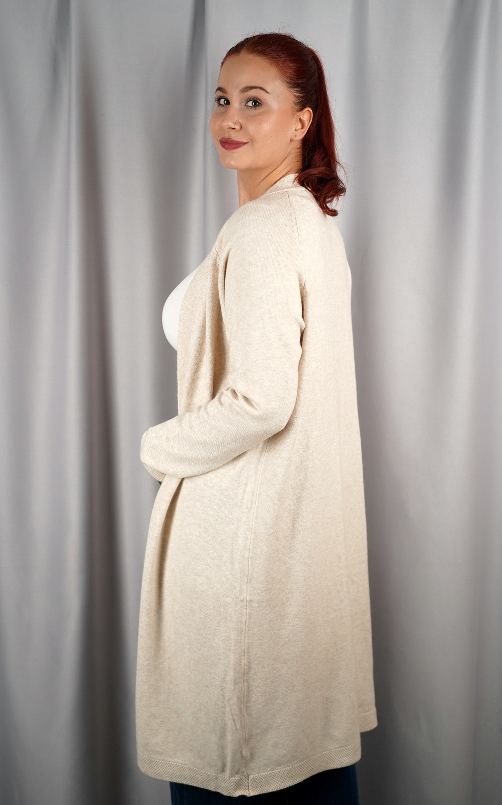 Ovaj elegantan dugački kardigan savršen je dodatak za vašu garderobu. Izrađen od mekog, pletenog materijala, pruža udobnost i toplinu, a istovremeno daje sofisticiran izgled svakoj kombinaciji. Njegov otvoreni prednji dio bez kopčanja omogućuje slobodno kretanje i čini ga idealnim za slojevito oblačenje. Dužina seže do koljena, što ga čini elegantnim i svestranim. Može se nositi preko majice, bluze ili haljine, a lako se kombinira s hlačama, trapericama ili suknjama. Ovaj kardigan je praktičan i moderan komad koji će vas pratiti kroz prijelazno razdoblje, a ujedno će vašem outfitu dati dozu stila i elegancije.