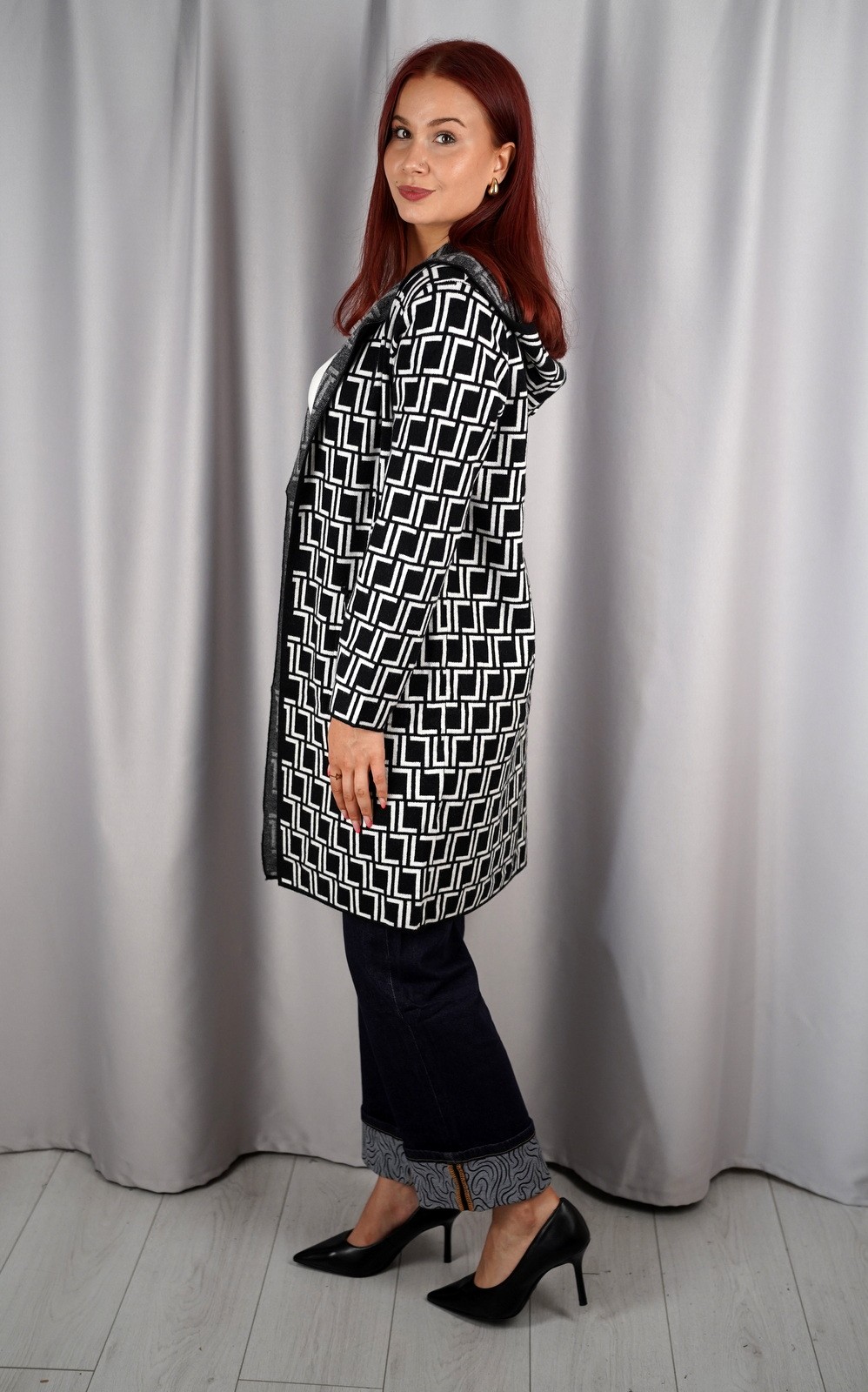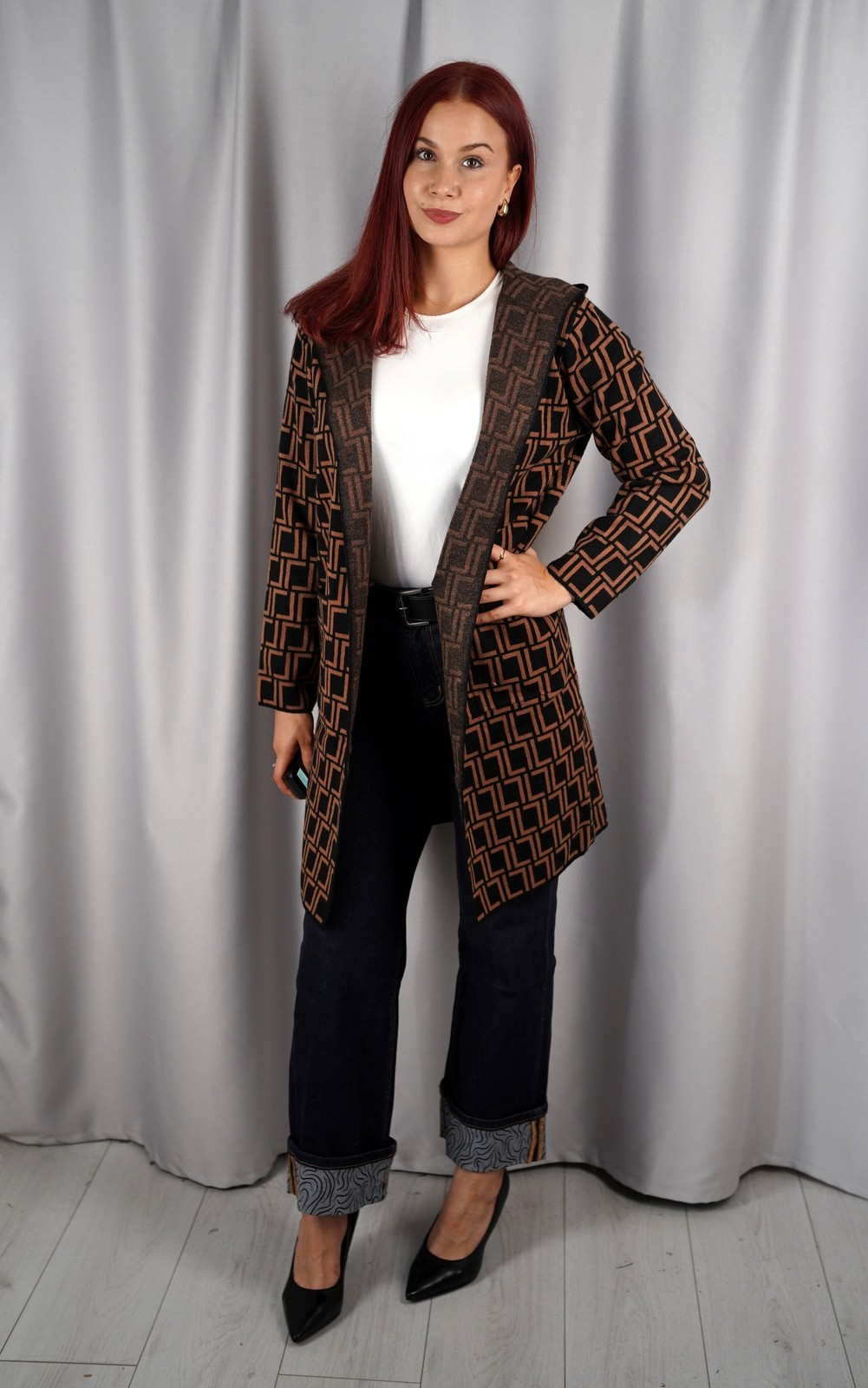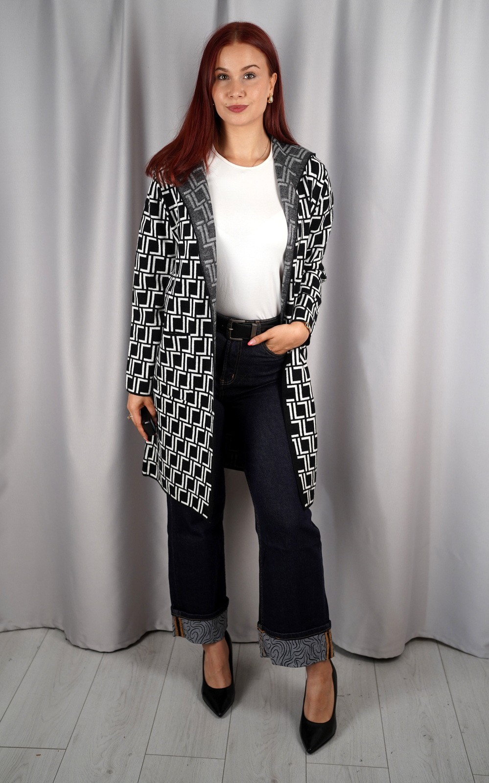 Ovaj ženski kardigan s kapuljačom i prepoznatljivim geometrijskim uzorkom kombinira udobnost i moderan dizajn u jednom odjevnom komadu. Bez kopčanja i u dužem kroju, pruža ležeran, ali elegantan izgled koji se savršeno uklapa u različite kombinacije – od svakodnevnih do poslovnih. Izrađen je od mekanog i toplog materijala, što ga čini idealnim izborom za prijelazne sezone i slojevito odijevanje. Geometrijski uzorak daje mu dinamičan i modno osvježen izgled, dok kapuljača unosi praktičnost i urbanu notu. Savršen je za žene koje vole spoj komfora i stila u svakodnevnoj garderobi.