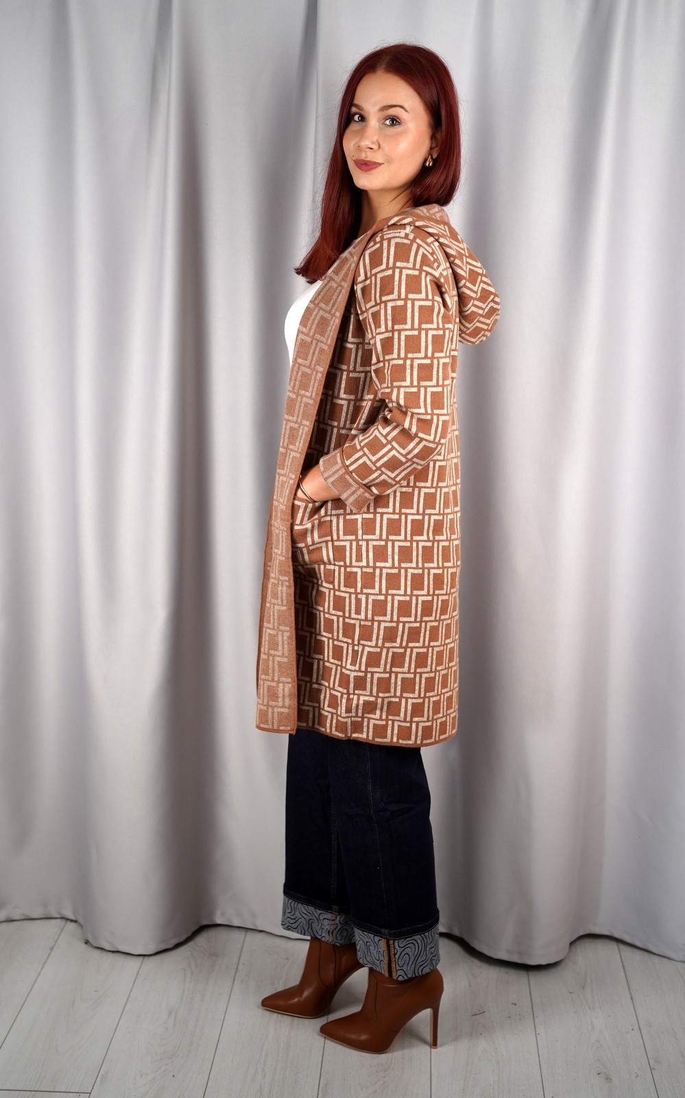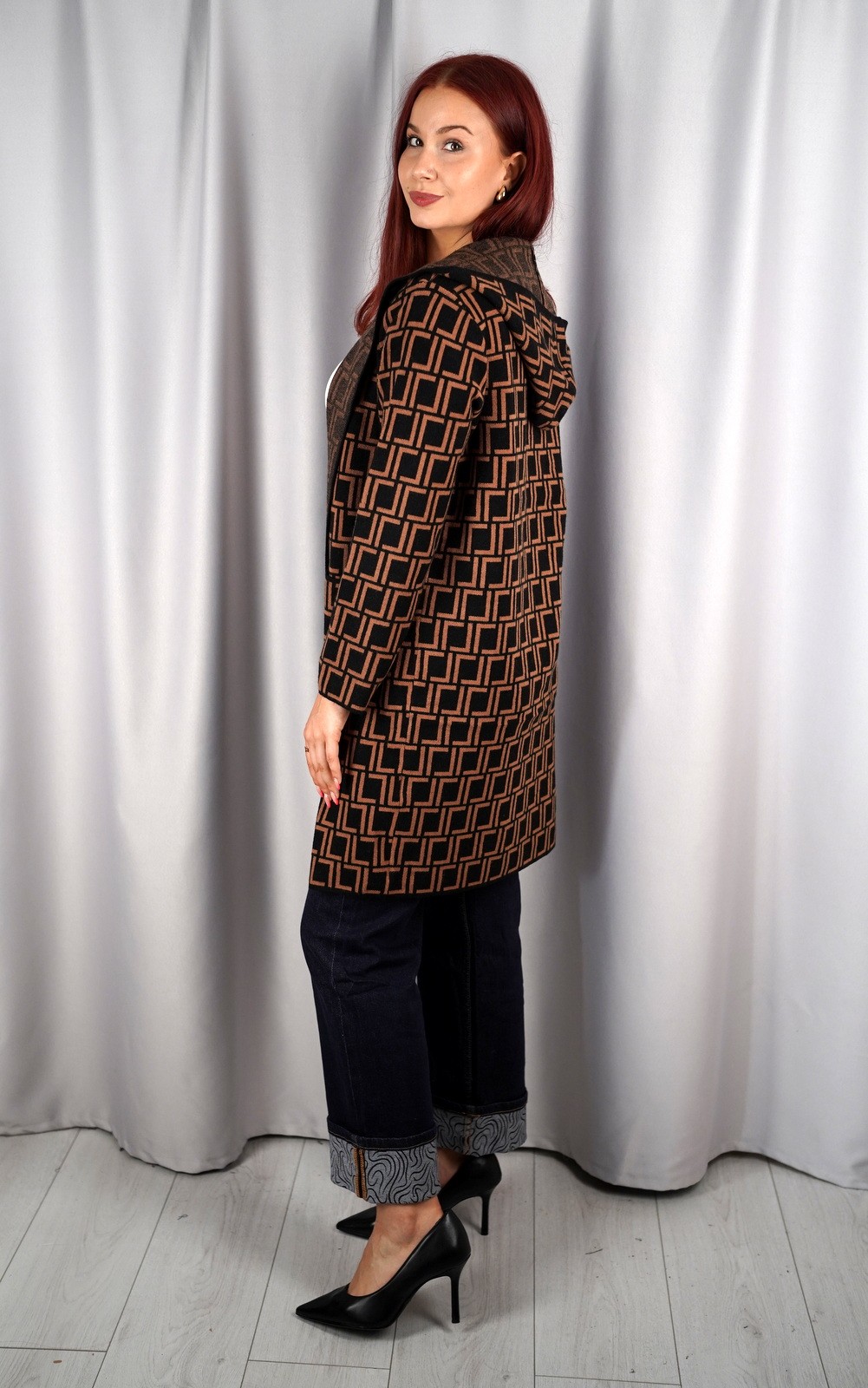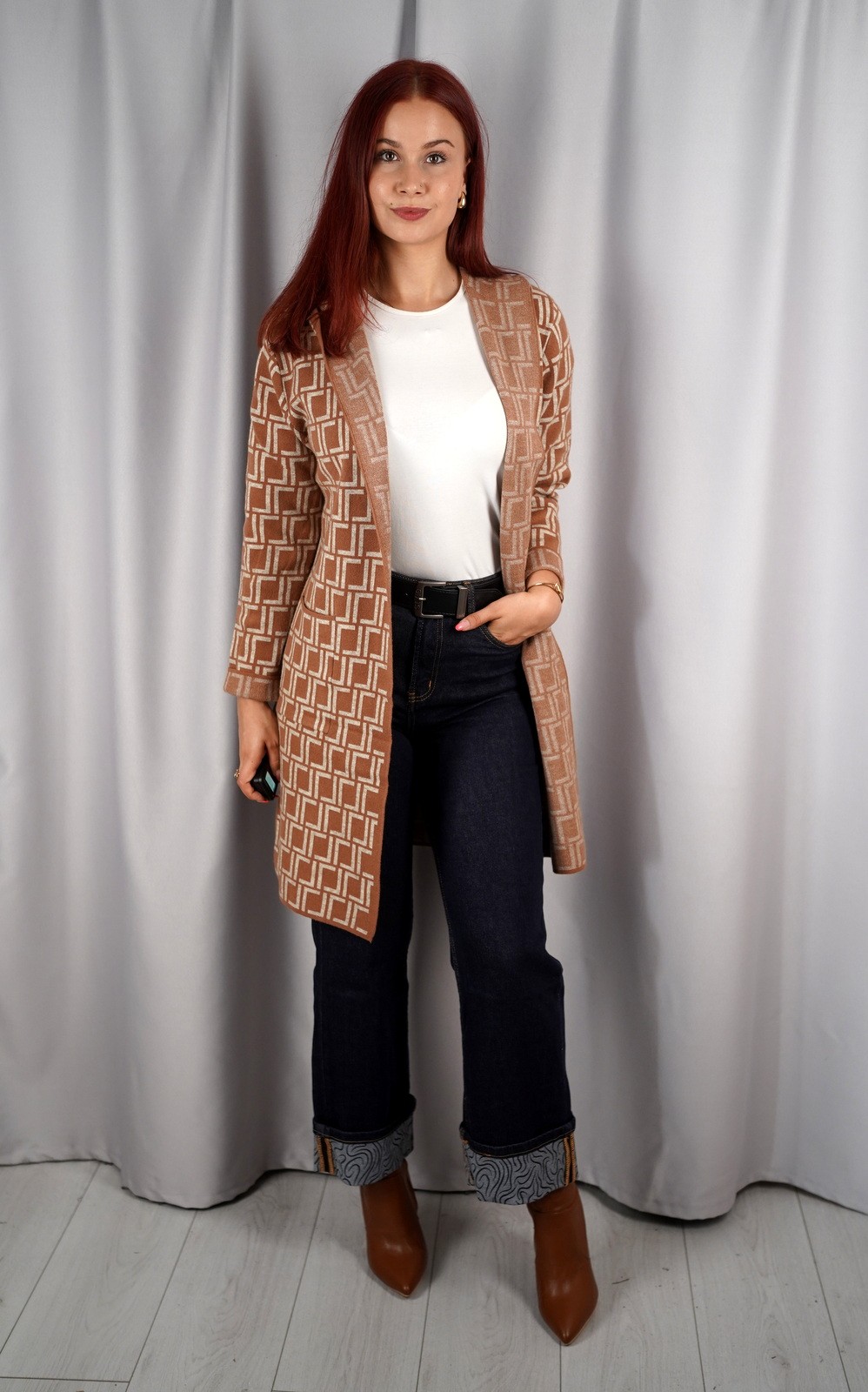 Ovaj ženski kardigan s kapuljačom i prepoznatljivim geometrijskim uzorkom kombinira udobnost i moderan dizajn u jednom odjevnom komadu. Bez kopčanja i u dužem kroju, pruža ležeran, ali elegantan izgled koji se savršeno uklapa u različite kombinacije – od svakodnevnih do poslovnih. Izrađen je od mekanog i toplog materijala, što ga čini idealnim izborom za prijelazne sezone i slojevito odijevanje. Geometrijski uzorak daje mu dinamičan i modno osvježen izgled, dok kapuljača unosi praktičnost i urbanu notu. Savršen je za žene koje vole spoj komfora i stila u svakodnevnoj garderobi.