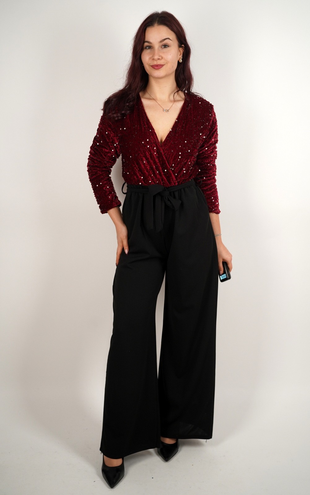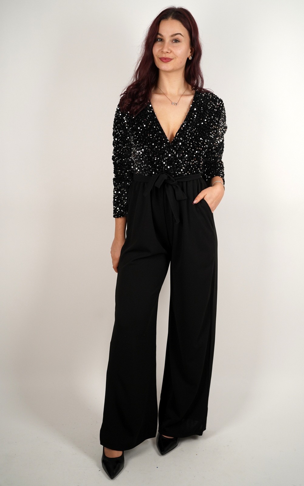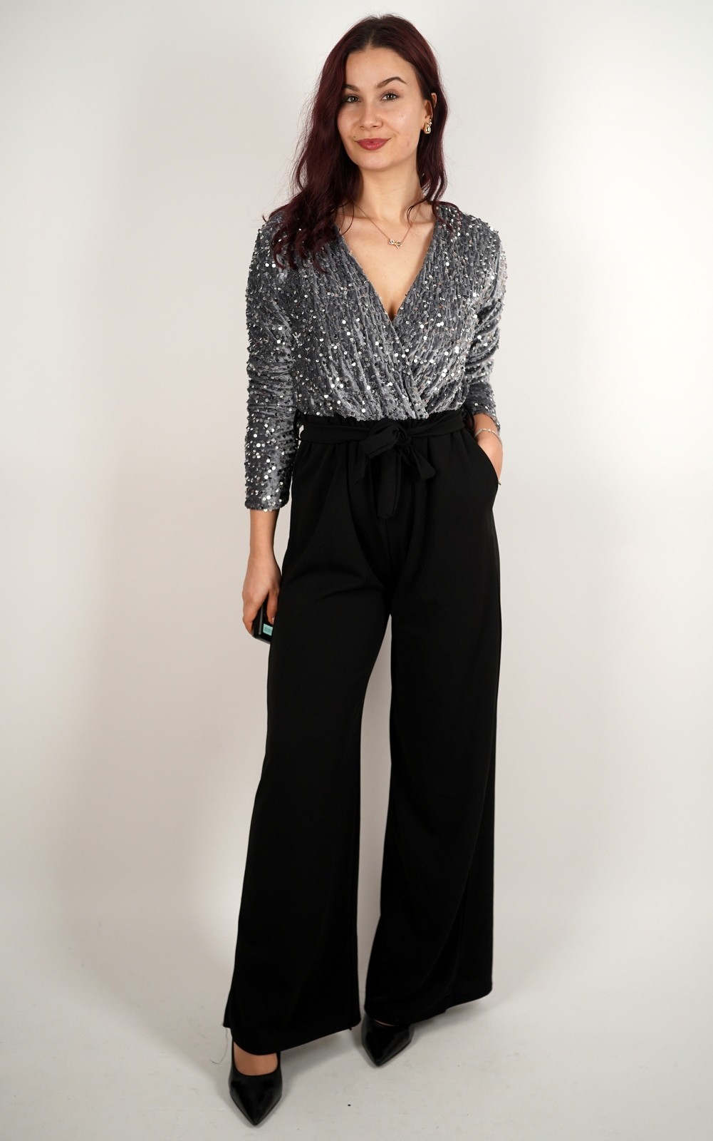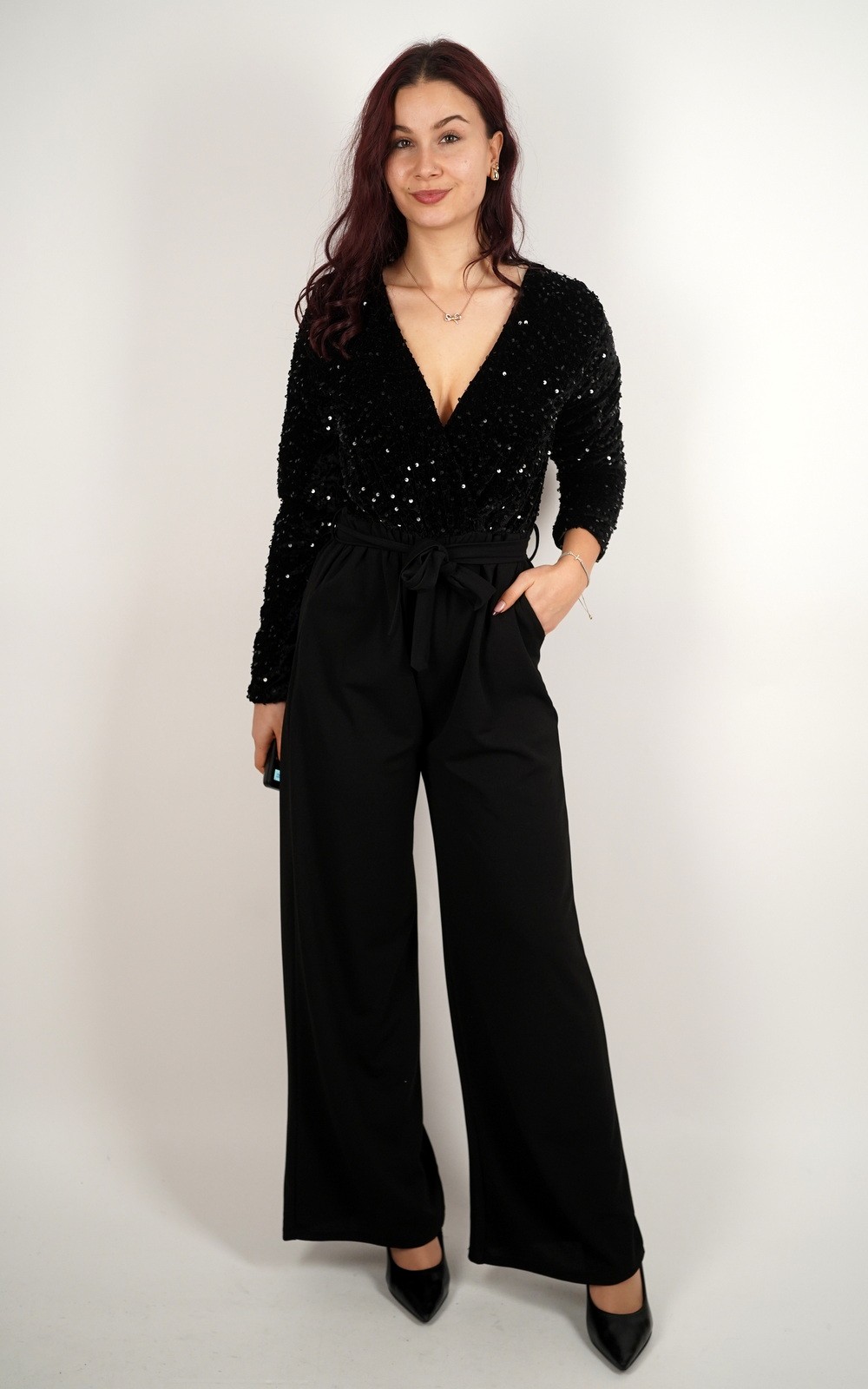 bozic10 očekuje te snižena cijena od 31.50 € za ovaj artikl u košarici.Glamurozni ženski kombinezon sa šljokičastim gornjim dijelom, dubokim preklop izrezom i širokim nogavicama. Prilagodljivi struk s vezicom naglašava liniju, dok elegantan kroj pruža udobnost i efektan večernji izgled.