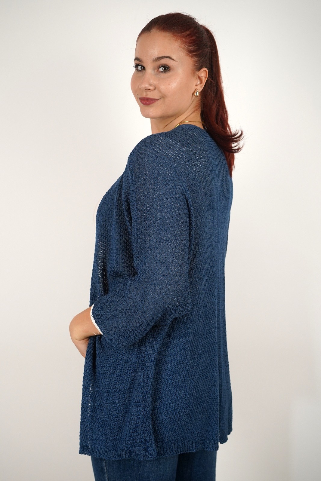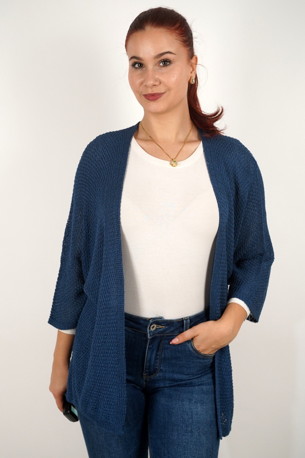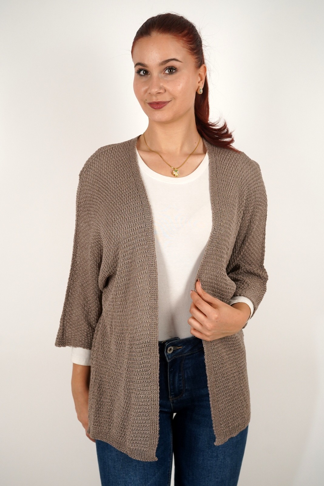 Ovaj ženski lagani kardigan izrađen je od mekanog, prozračnog pletiva koje se savršeno prilagođava svakoj odjevnoj kombinaciji. Opušteni kroj bez kopčanja pruža maksimalnu udobnost i slobodu pokreta, dok tročetvrt rukavi i decentna tekstura dodaju profinjen izgled. Idealan je za prijelazno razdoblje – možete ga nositi preko majice, košulje ili haljine za svakodnevni, ali elegantan izgled. Lako se kombinira uz traperice ili hlače, a zbog lagane strukture odličan je izbor i za slojevito odijevanje u svakoj sezoni.