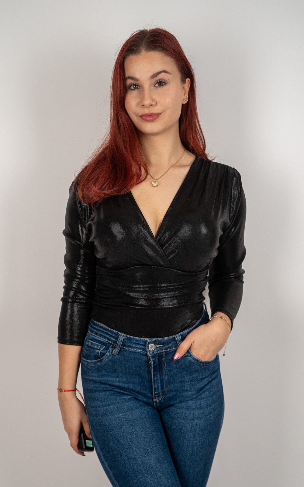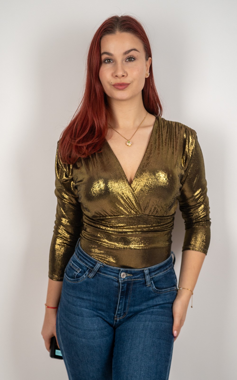 Ženski metalik bodi s preklopnim V-izrezom i efektom sjaja – 18570