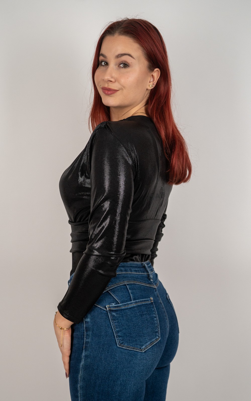 Ovaj ženski metalik bodi s preklopnim V-izrezom donosi savršen spoj glamura i profinjenosti. Izrađen od elastičnog, sjajnog materijala koji se prilagođava figuri, naglašava siluetu i daje efektan, luksuzan izgled. Preklopni gornji dio vizualno izdužuje vrat i lijepo oblikuje dekolte, dok dugi rukavi osiguravaju eleganciju i praktičnost u svim prilikama. Idealan je za večernje izlaske, svečane prigode, blagdanske outfite ili svaki put kada želiš zasjati u nešto posebnom. Savršeno se kombinira s trapericama, suknjama visokog struka ili elegantnim hlačama.