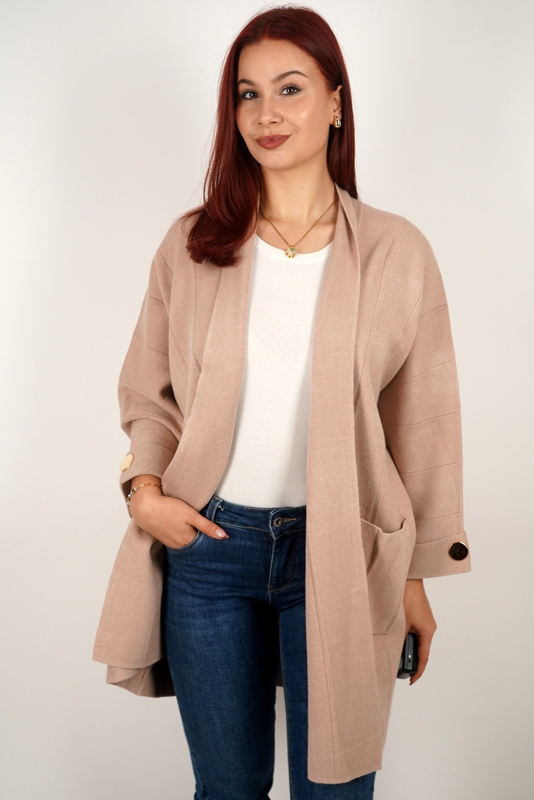 Ženski oversized kardigan bez kopčanja s džepovima i ukrasnim gumbima na rukavima – u veličinama – 3959