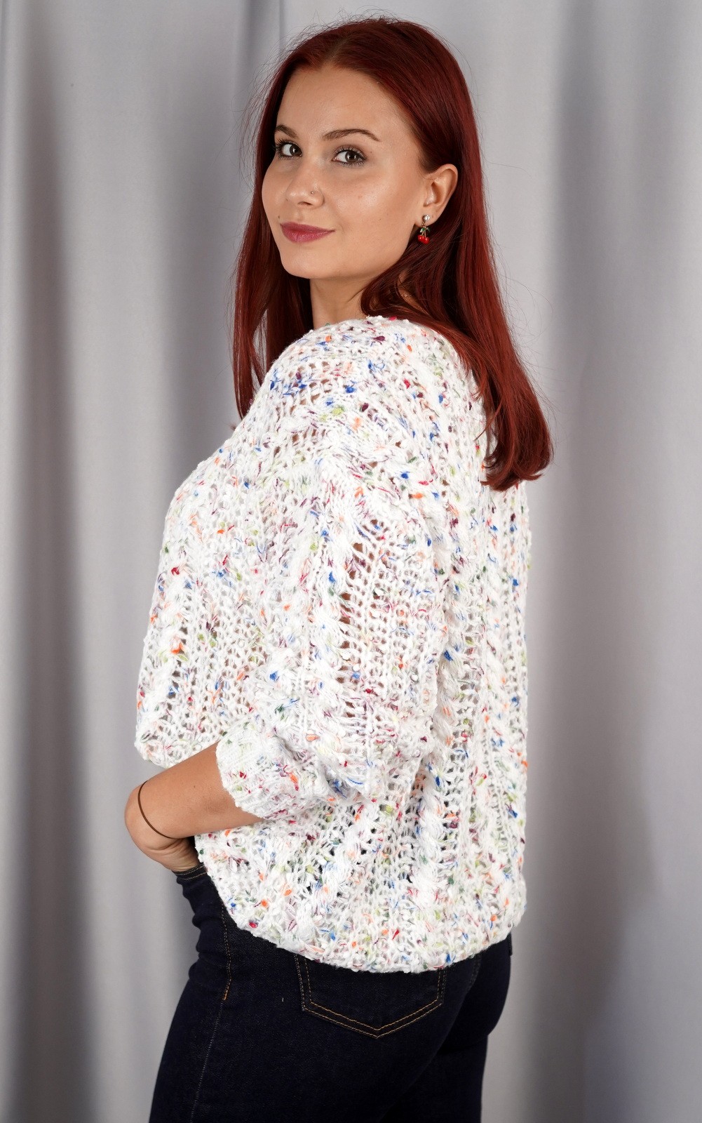 Ova udobna pletena majica savršen je izbor za svakodnevne prigode. Izrađena je od mekog materijala i ima širi kroj koji osigurava udobnost i slobodu pokreta. Posebnost majice je ukrasni pleteni uzorak po cijeloj površini, što joj daje poseban šarm i sofisticiranost. Zbog svog svestranog dizajna, ova majica je idealna za razne prilike. Može se kombinirati s trapericama za ležeran izgled, a jednako dobro funkcionira i s poslovnim hlačama ili suknjama za formalnije prilike. Njezina jednostavnost i decentni detalji čine je nezamjenjivim komadom u vašoj garderobi, savršenim za prijelazno razdoblje i hladnije dane.