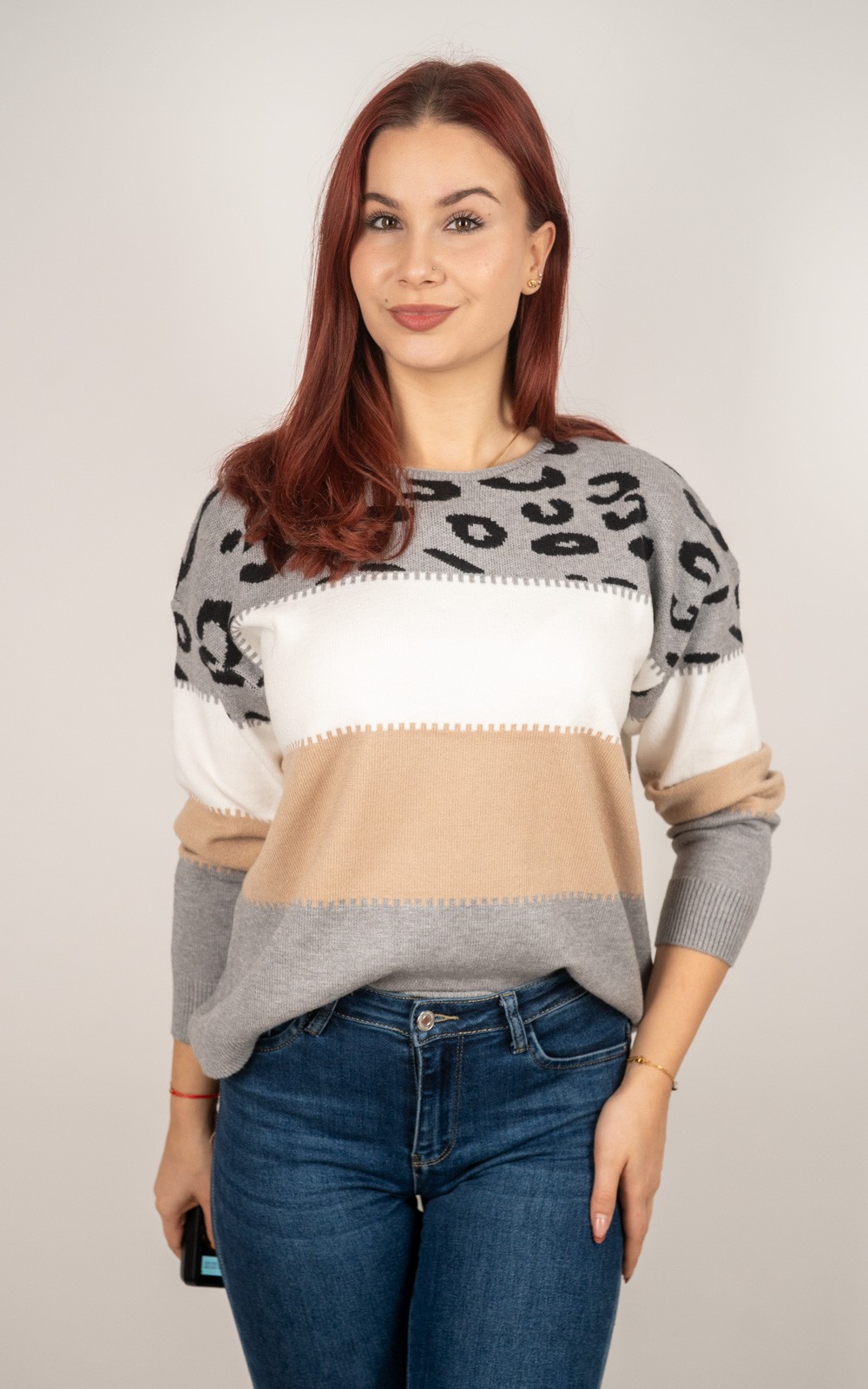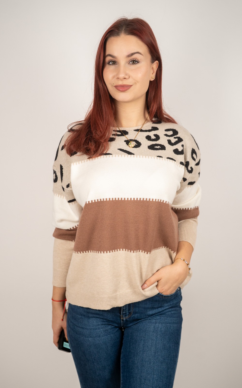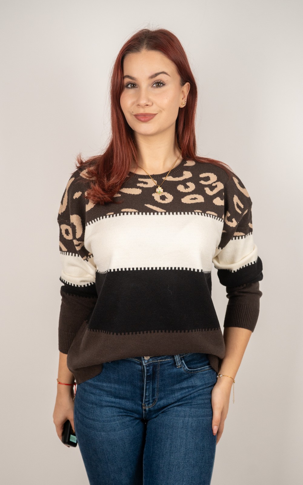 Moderan ženski pleteni pulover koji spaja dva atraktivna modna elementa — animal detalje i prugaste panele. Izrađen od mekane, udobne pletenine, pruža toplinu i savršeno pristaje u svim dnevnim kombinacijama. Prugasti raspored i životinjski uzorak na gornjem dijelu vizualno izdužuju figuru i daju puloveru poseban efekt. Odličan izbor za žene koje žele spojiti udobnost i trendi izgled u jednom komadu. Idealno se kombinira uz traperice ili klasične hlače za chic casual styling.