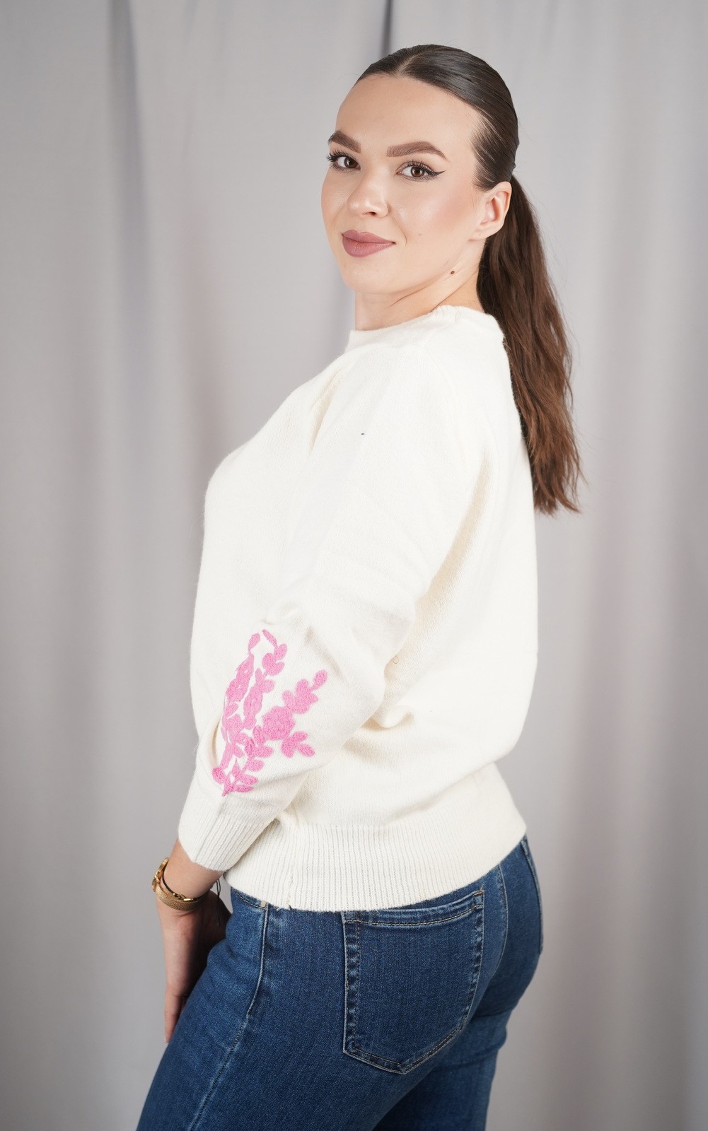Ženski pleteni pulover s cvjetnim aplikacijama na ramenima i rukavima – S6426A