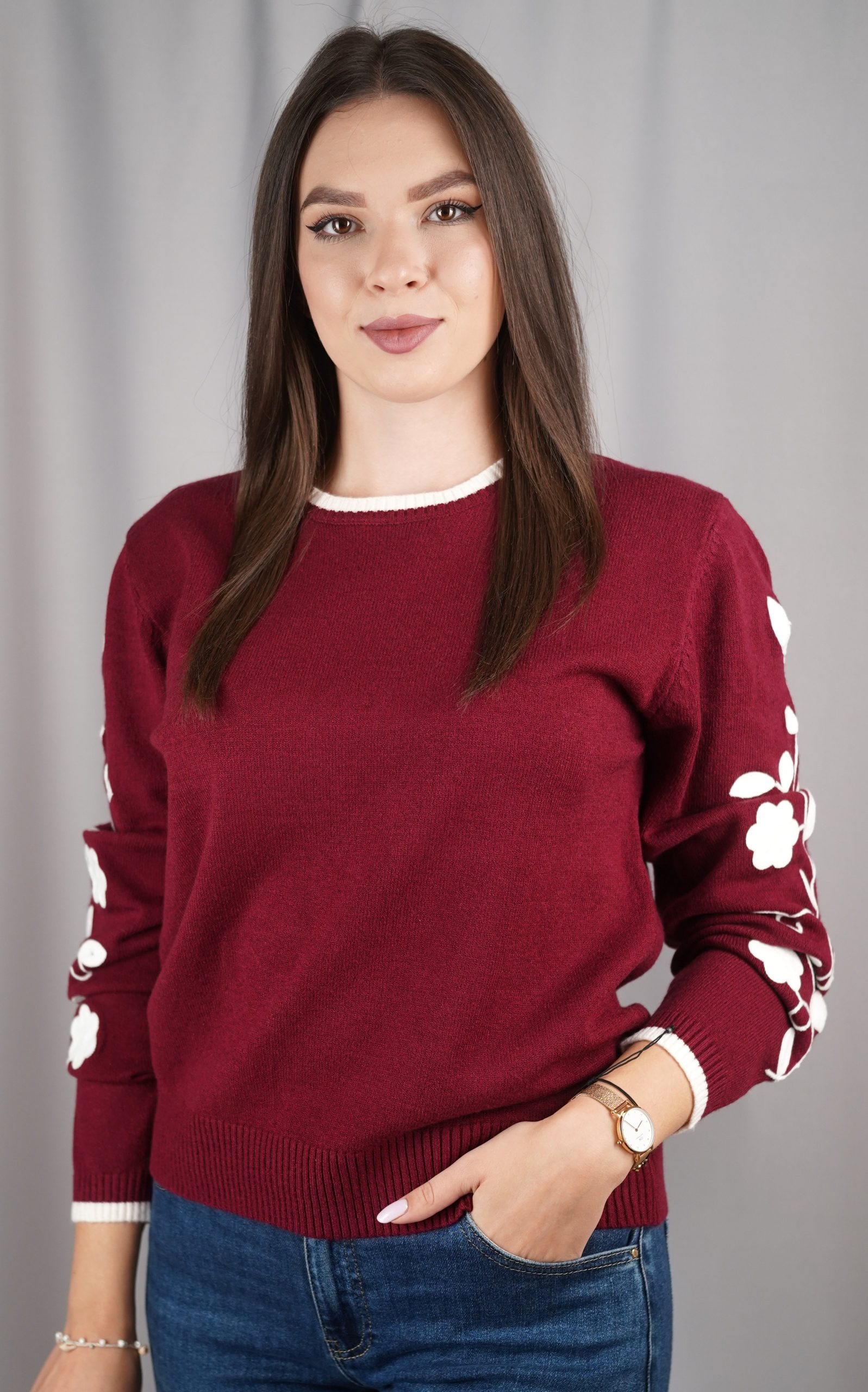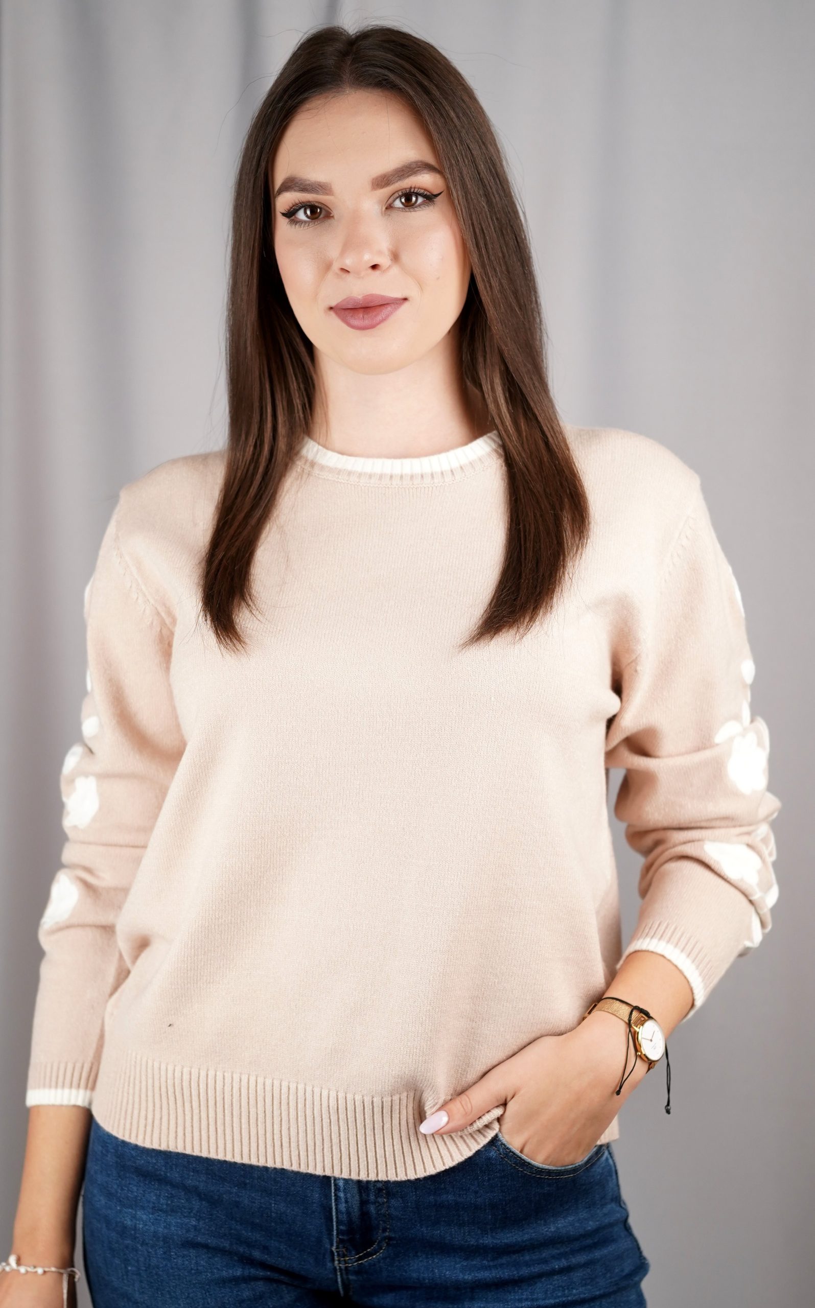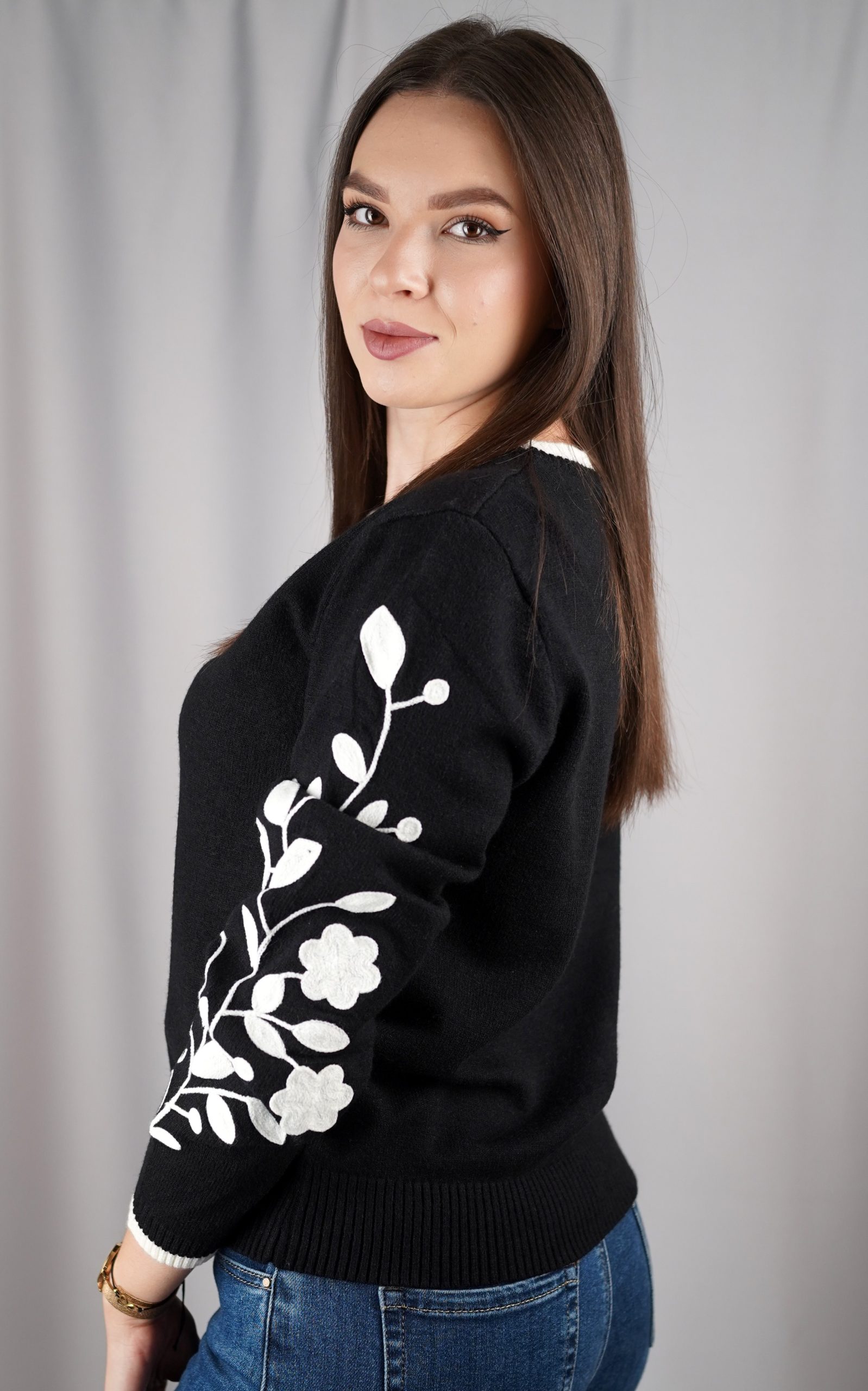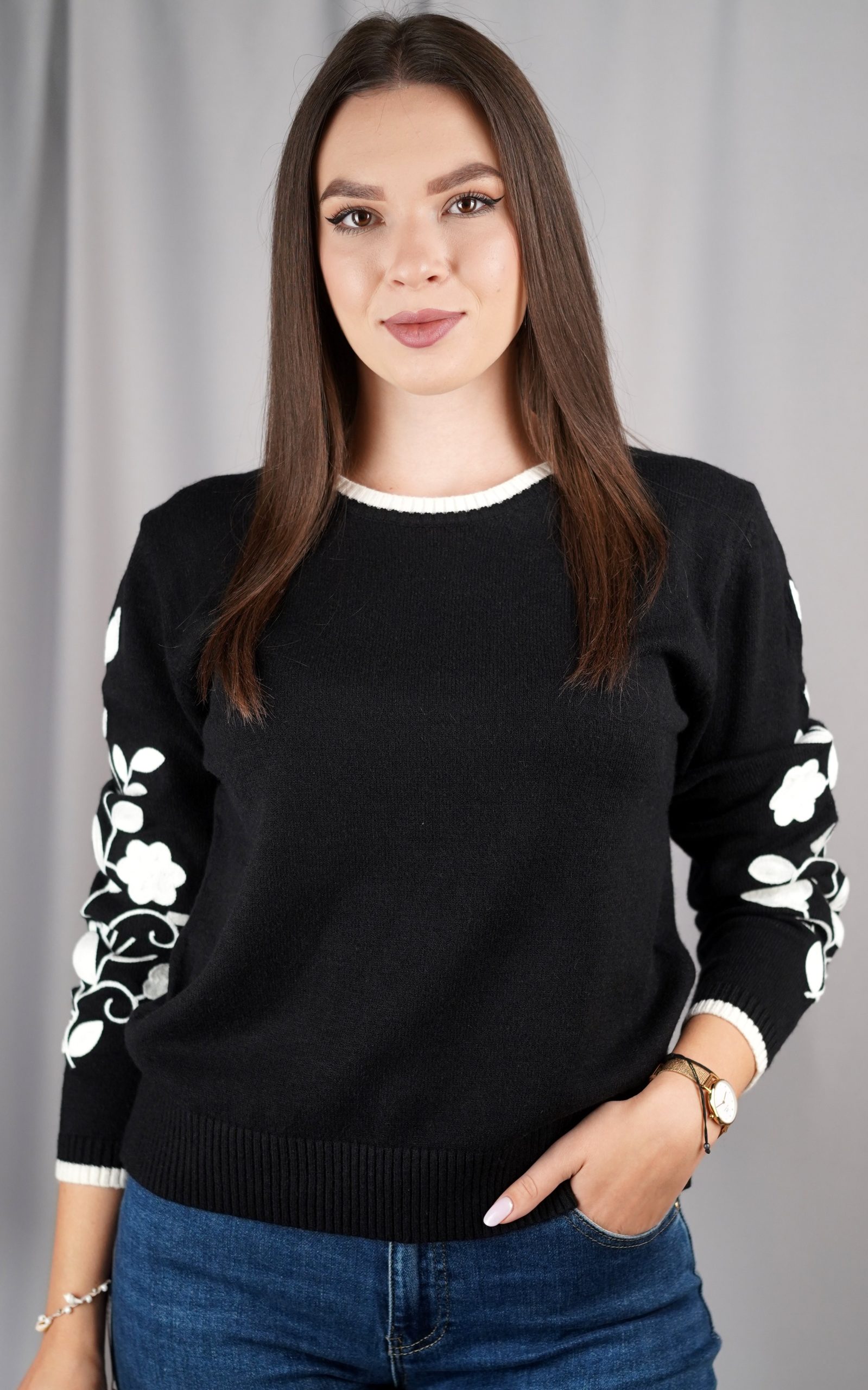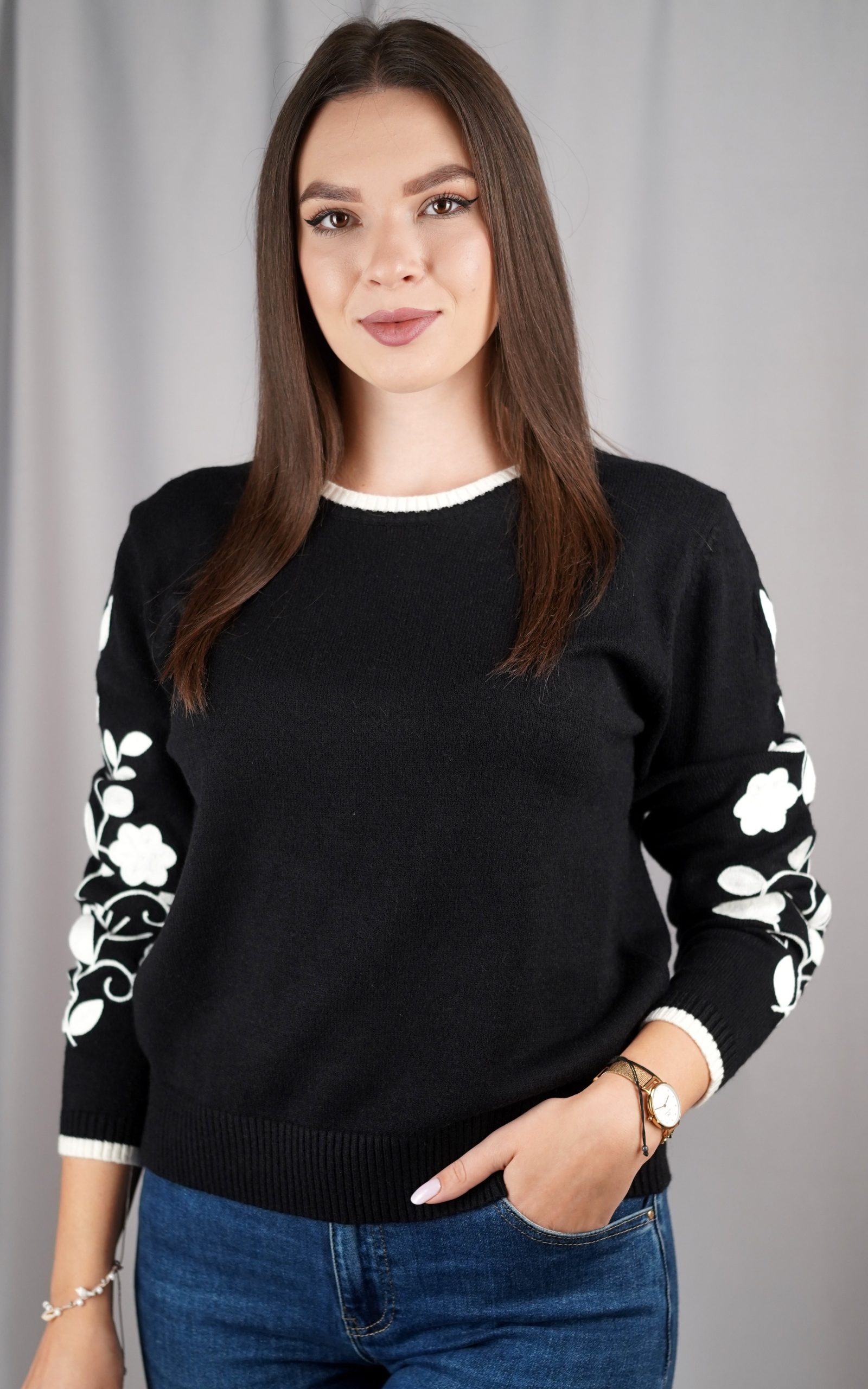 Ženski pleteni pulover s cvjetnim vezom na rukavima – u veličinama – VC779