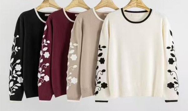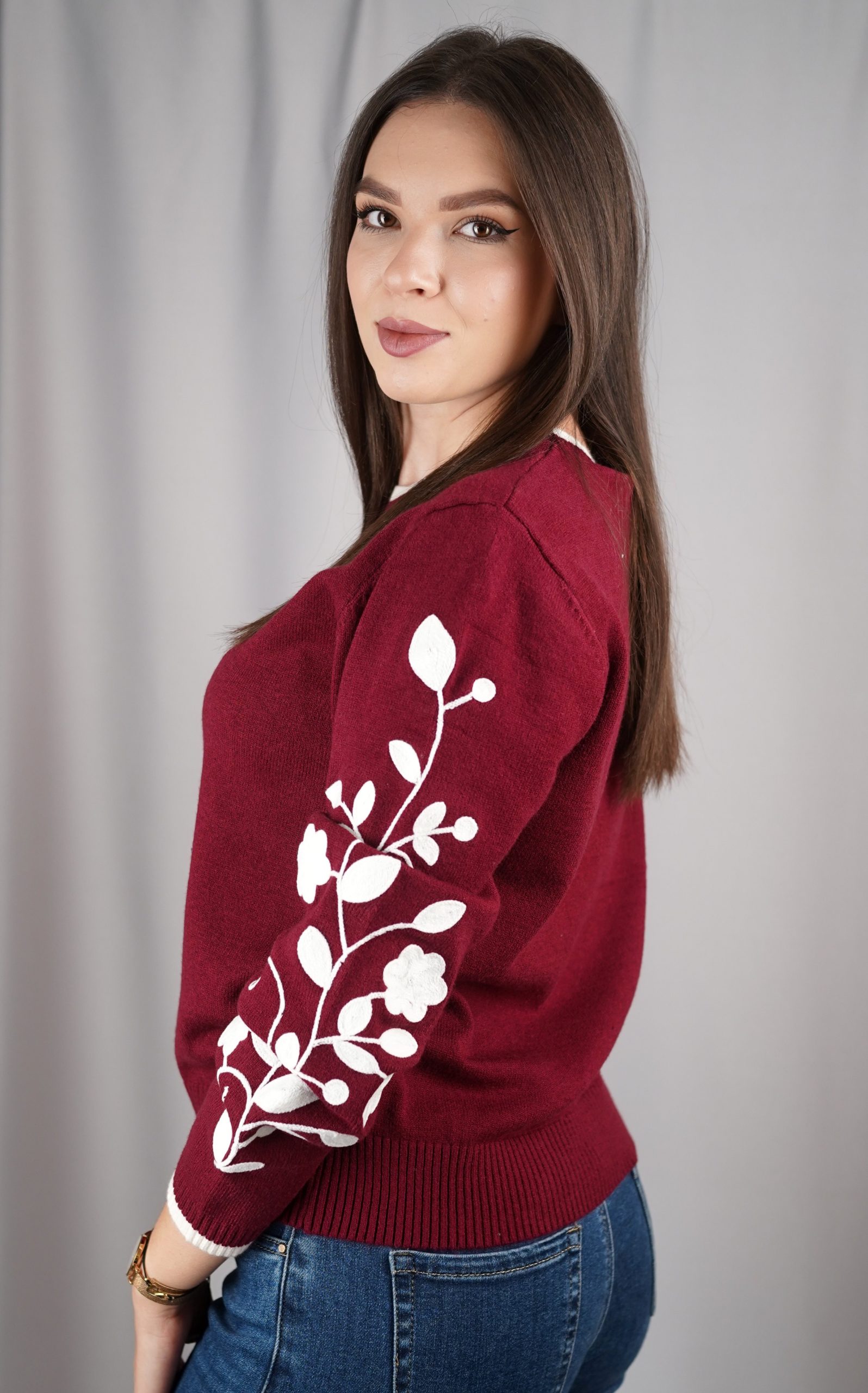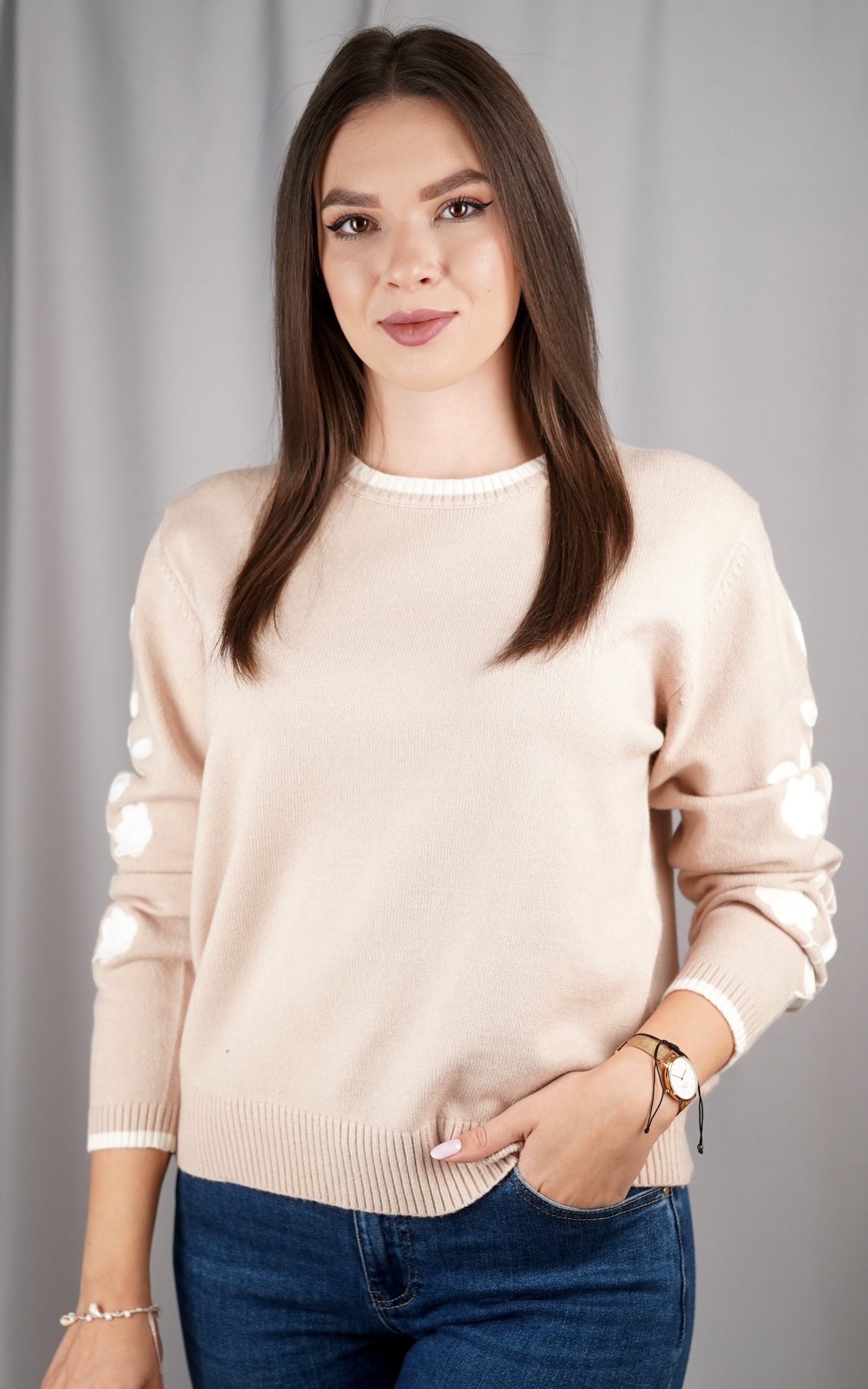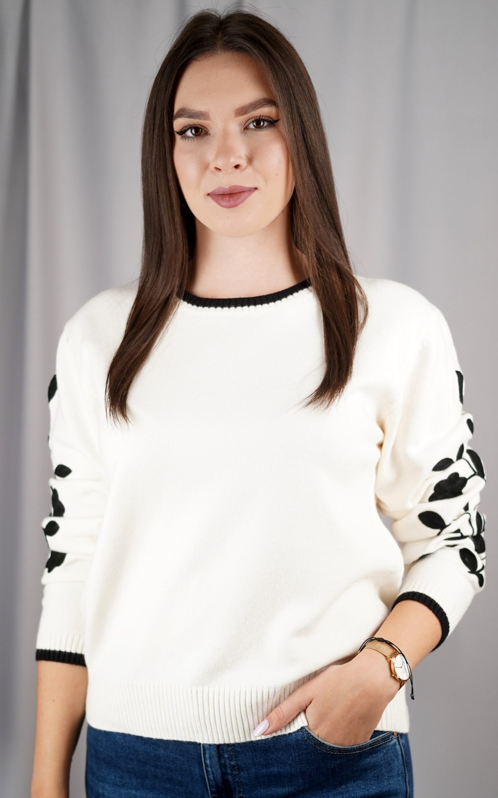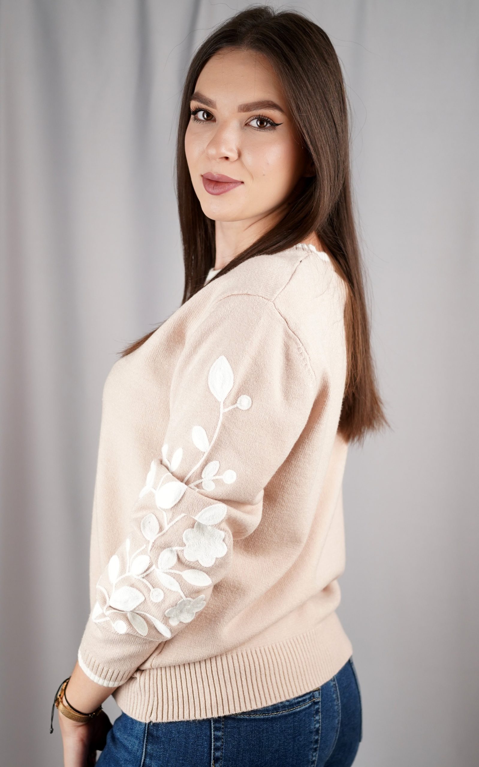 Ženski pleteni pulover s cvjetnim vezom na rukavima – u veličinama – VC779