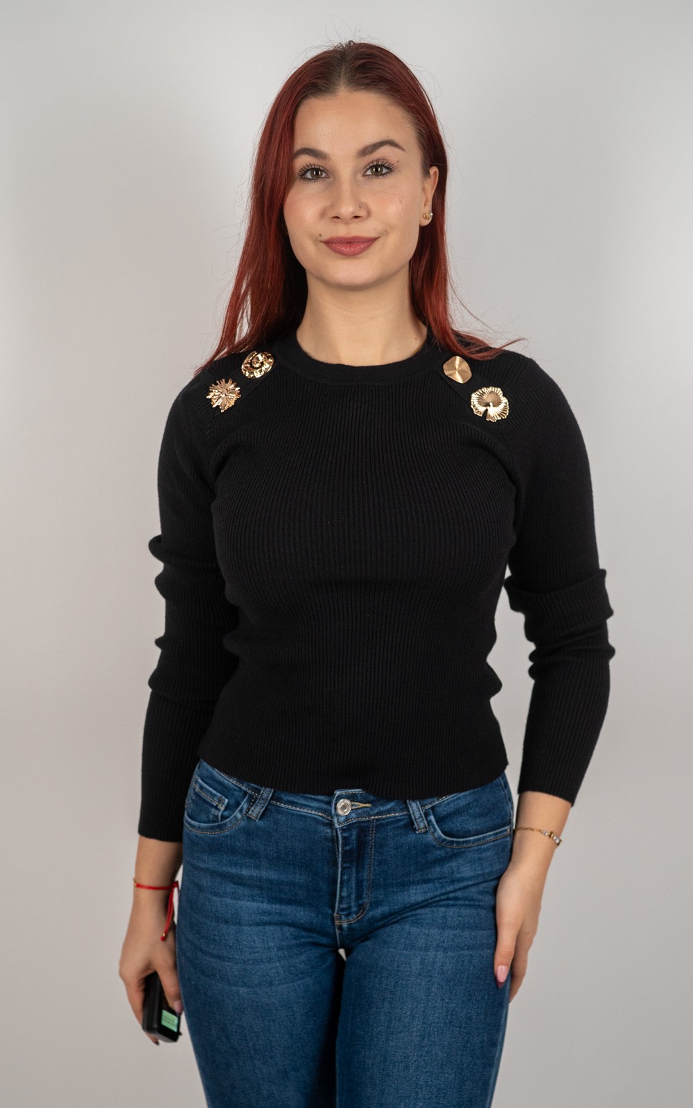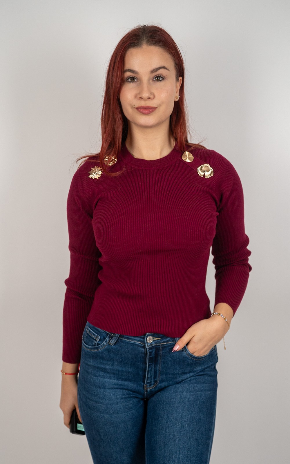 Ženski rebrasti pulover s dekorativnim metalnim gumbima – 9705
