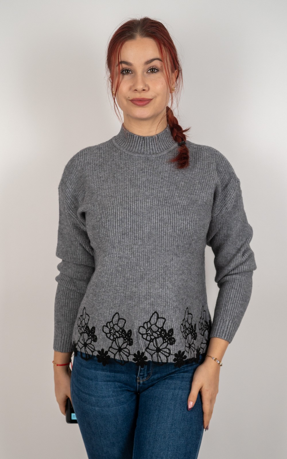 Ženski rebrasti pulover s visokom kragnom i cvjetnom čipkastom aplikacijom – 7042