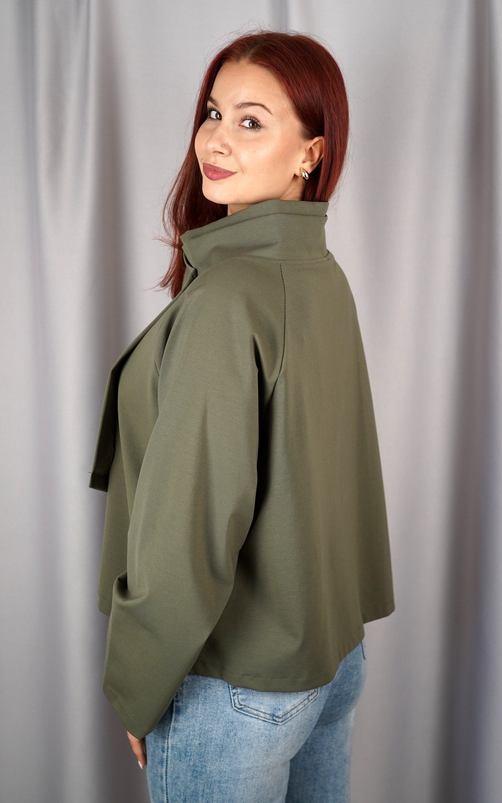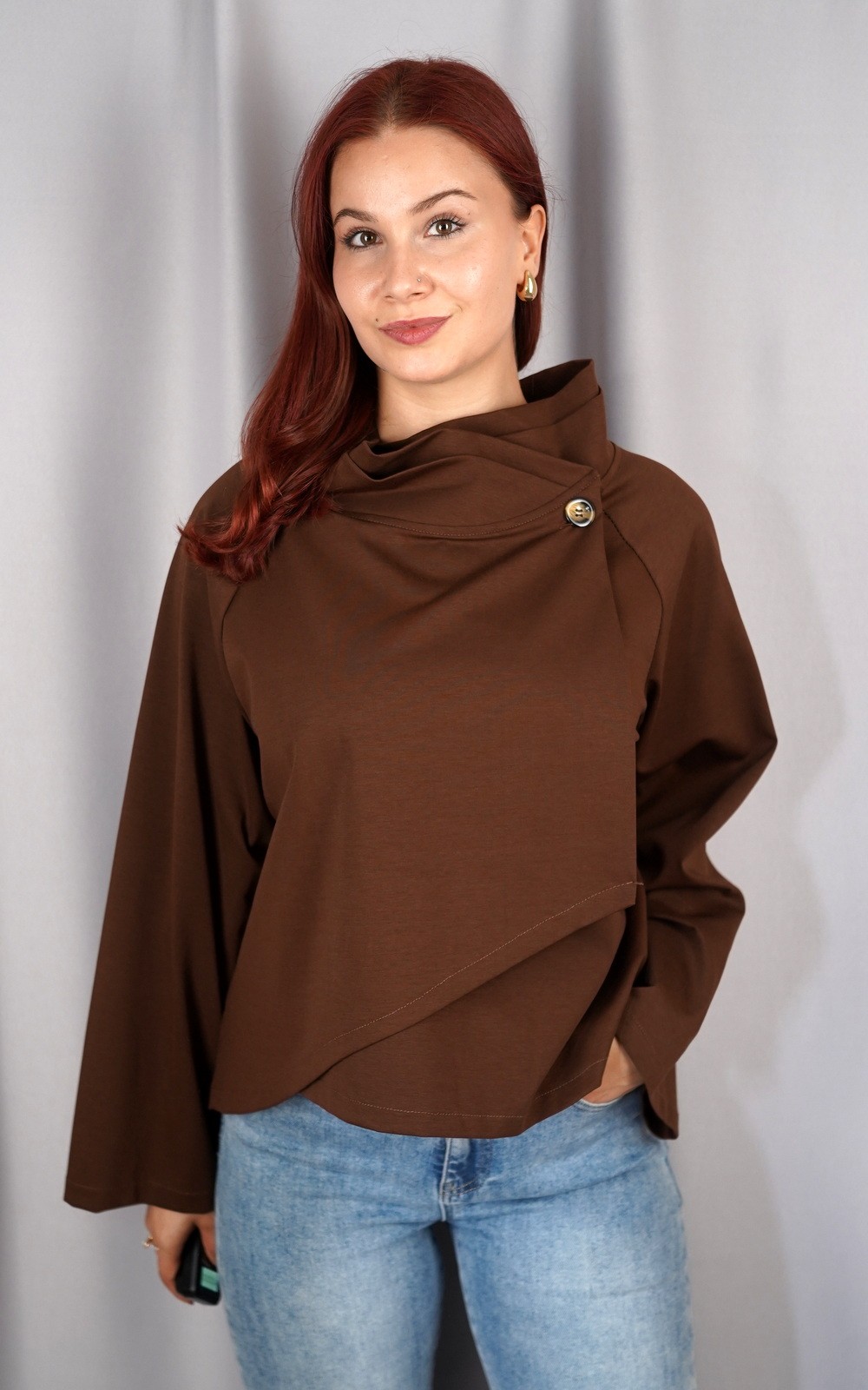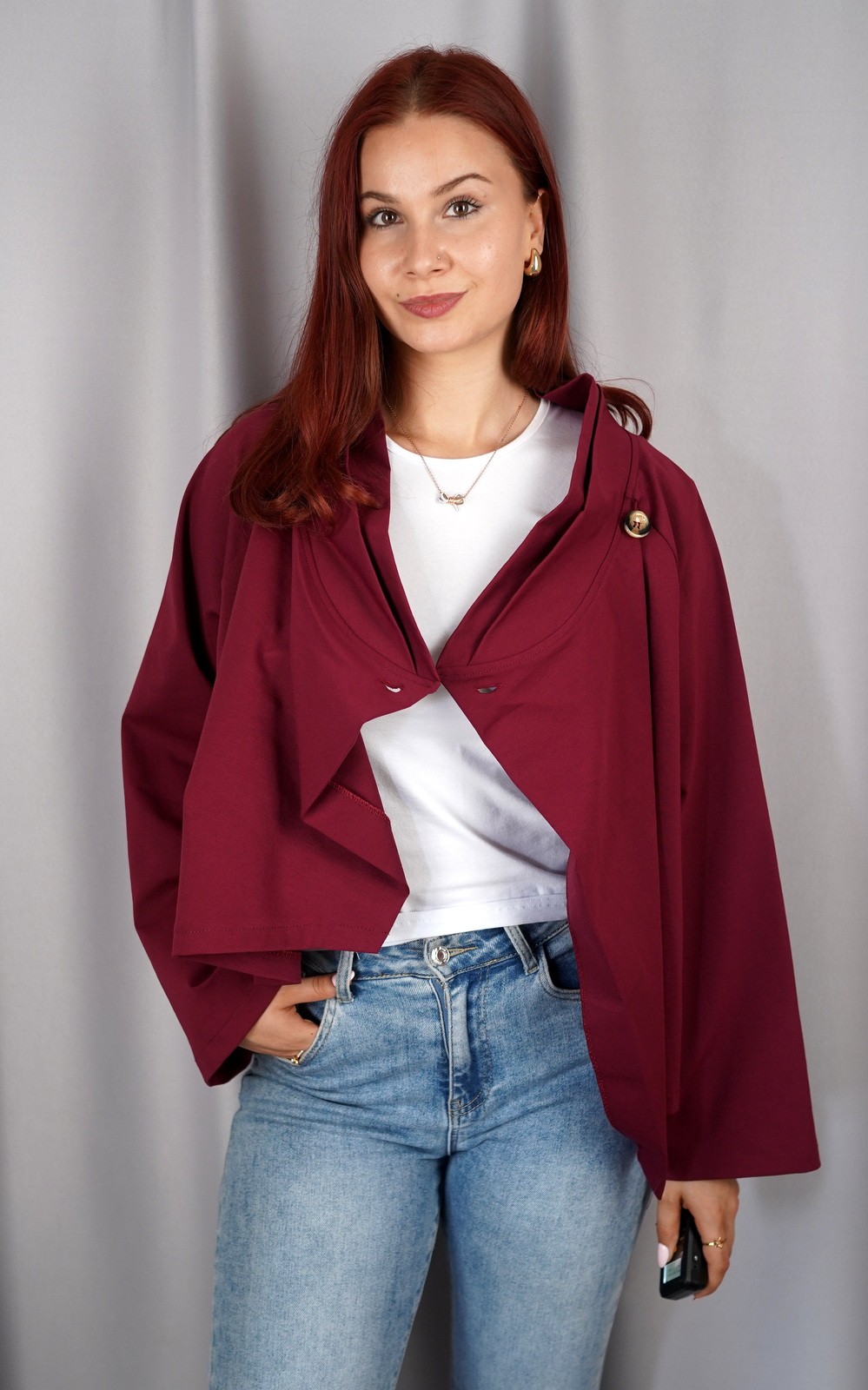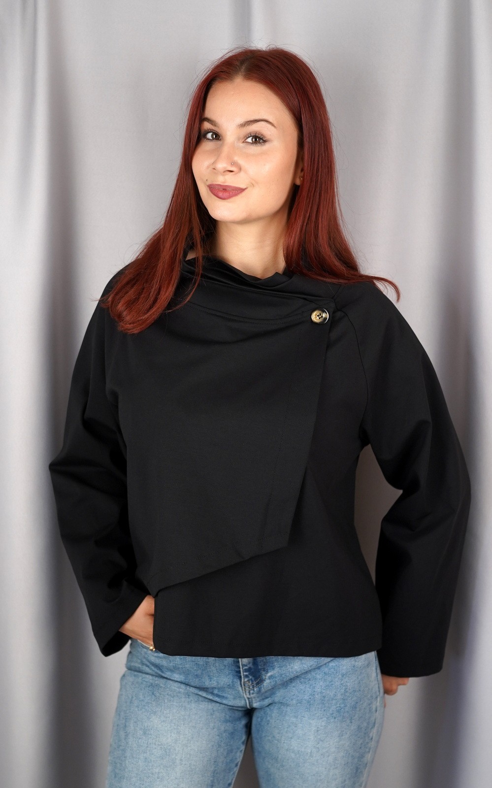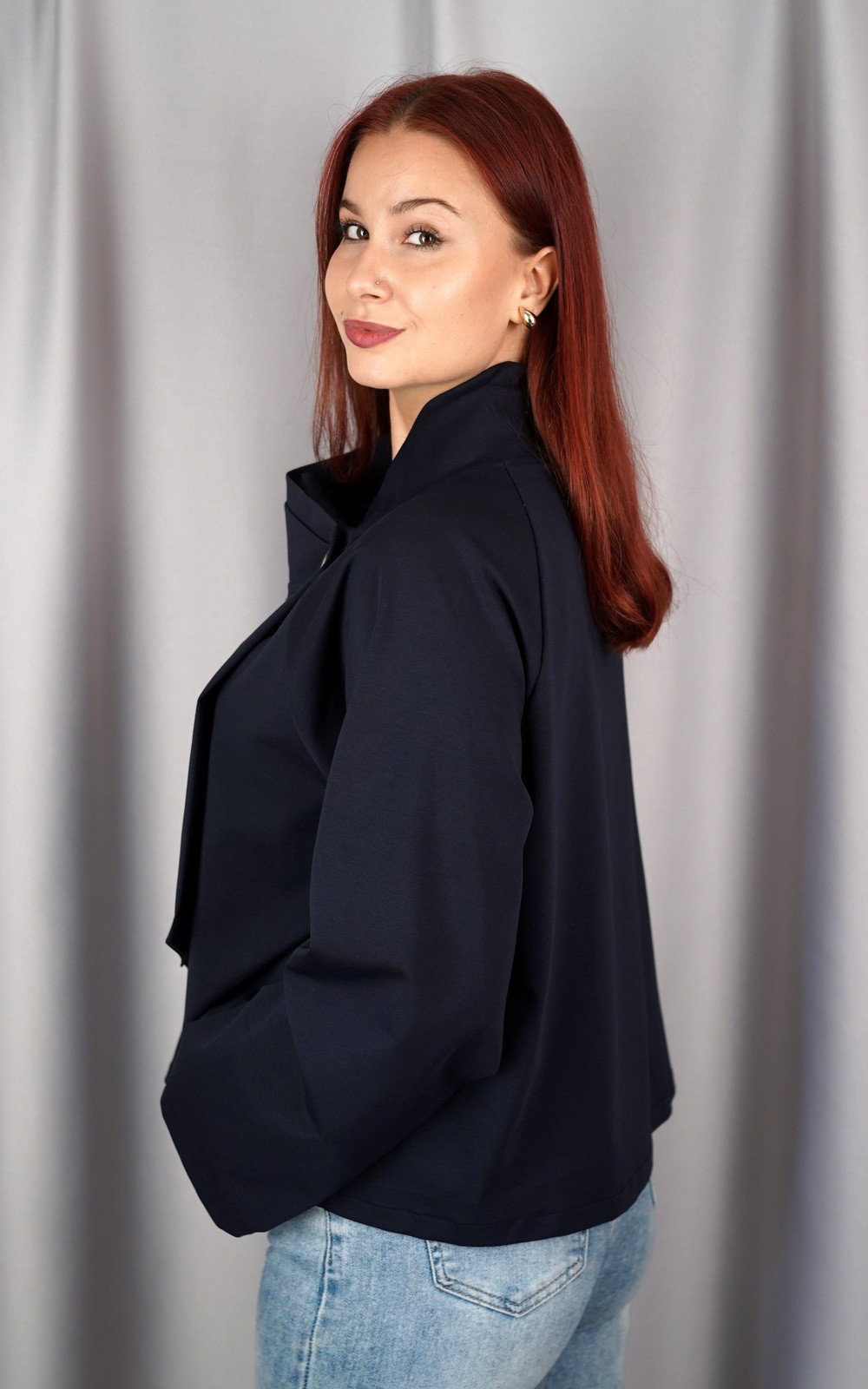 Ženski sako/kardigan asimetričnog kroja s ukrasnim gumbom donosi moderan i jedinstven izgled u svaku garderobu. Opušteni kroj i široki rukavi pružaju maksimalnu udobnost, dok asimetričan dizajn i dekorativni gumb na ovratniku daju sofisticiran i originalan naglasak. Ovaj model je vrlo svestran – može se nositi uz traperice za ležernu kombinaciju ili uz elegantne hlače i suknje za profinjeniji stil. Idealan je za svakodnevne prilike, posao ili večernje izlaske, a posebno će ga cijeniti žene koje vole jednostavnost s daškom unikatnog šarma.