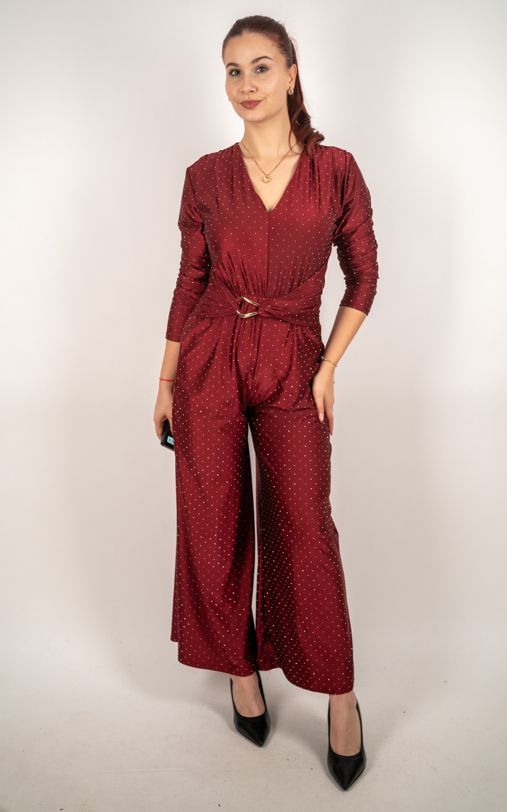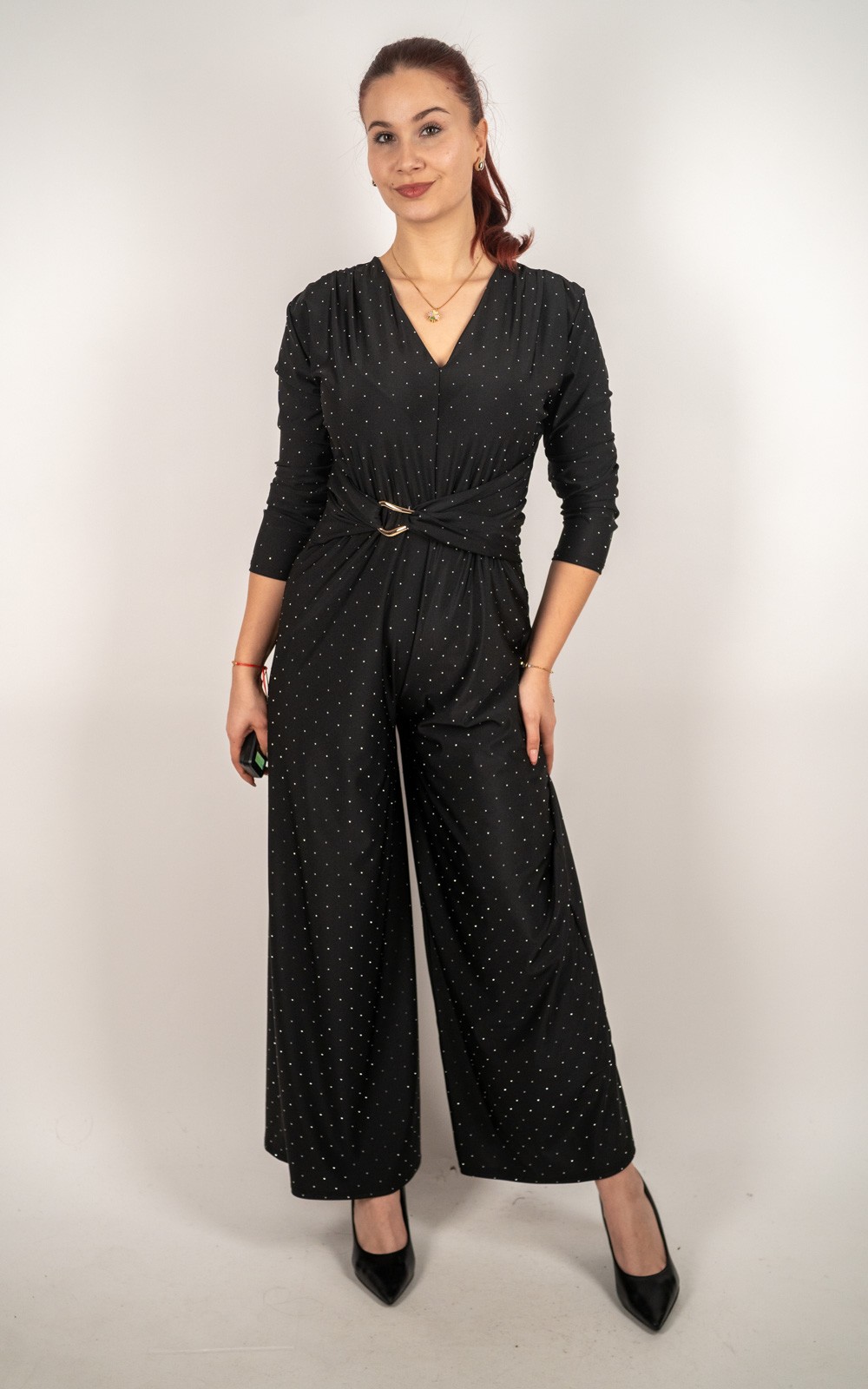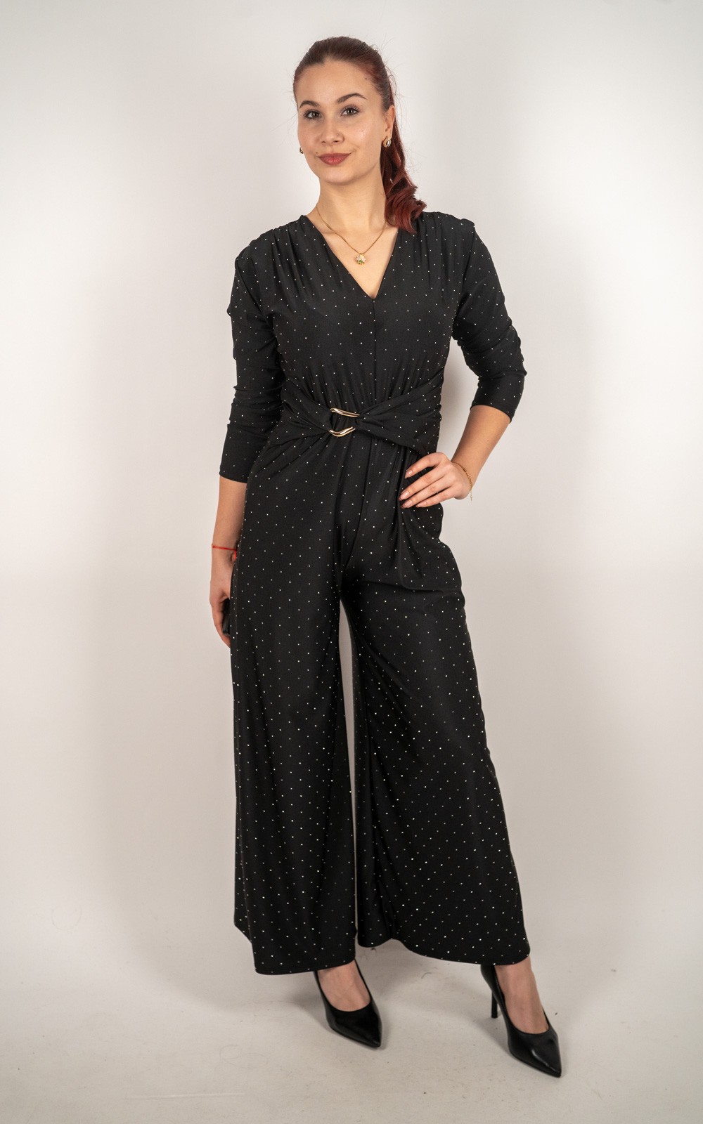 Ženski šljokičasti elegantni kombinezon s V-izrezom, metalnom kopčom i širokim nogavicama – 50019