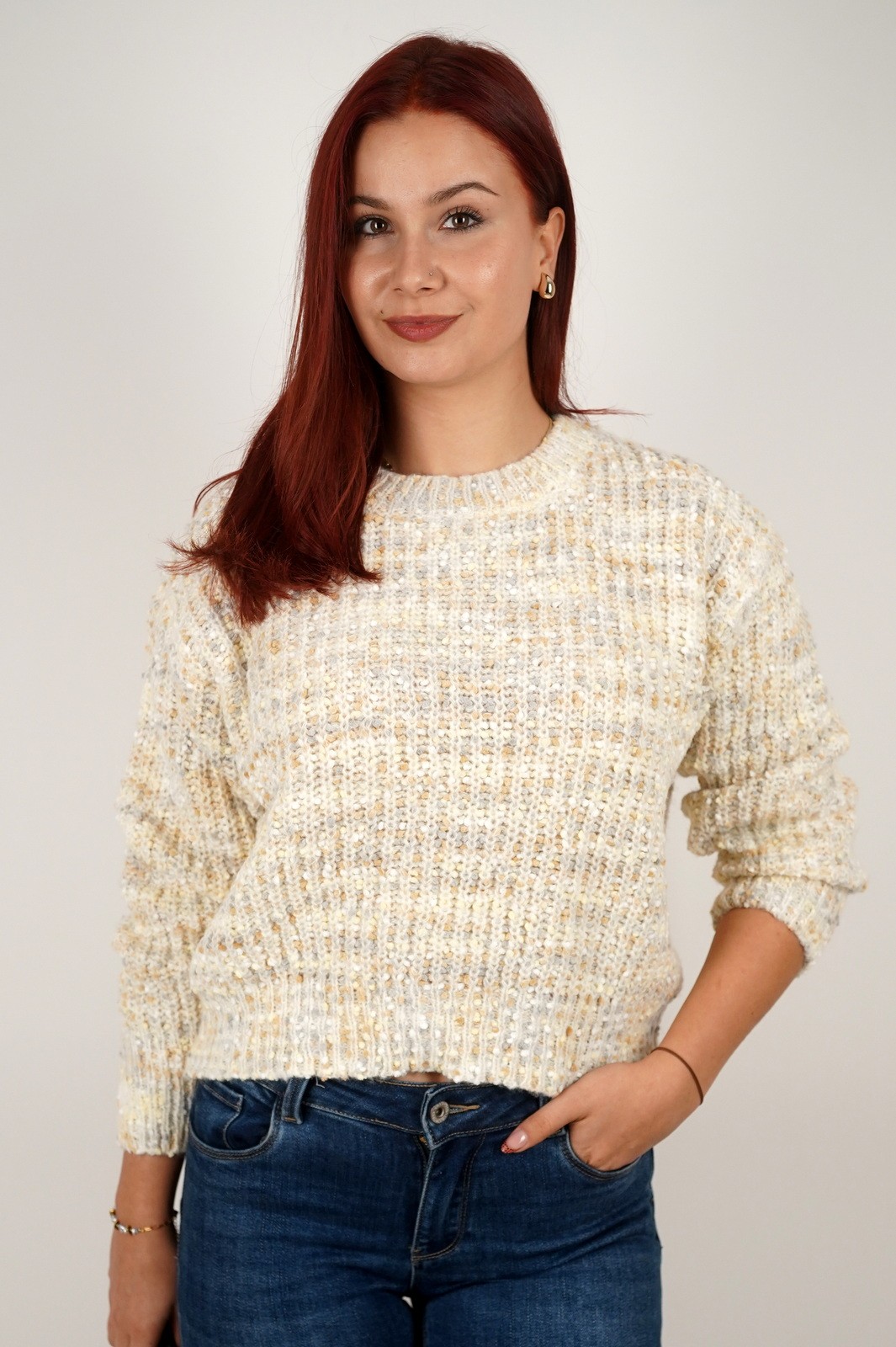 Ženski pulover izrađen od mekane vunene mješavine savršen je izbor za hladne dane. Teksturirano pletivo s izraženom strukturom daje mu moderan i udoban izgled, dok klasičan kroj s dugim rukavima i okruglim izrezom pruža osjećaj topline i lakoće. Ovaj model kombinira ugodu nošenja i stil – nosiv je uz traperice za svakodnevni casual look ili uz elegantne hlače za profinjeniji dojam. Idealan komad za jesen i zimu koji ističe prirodnu ljepotu pletiva.